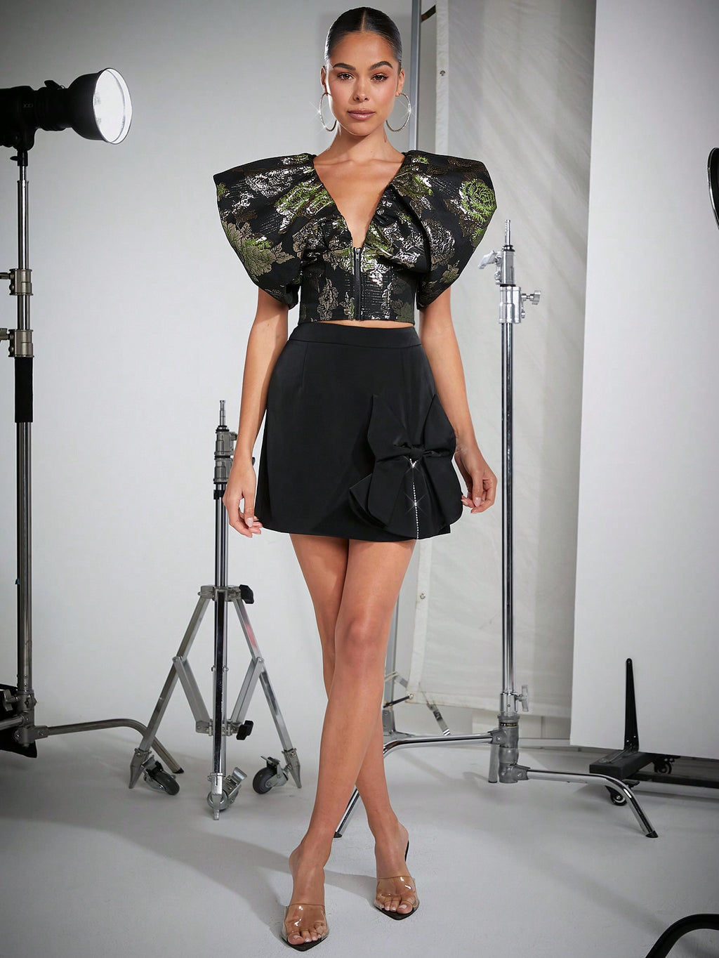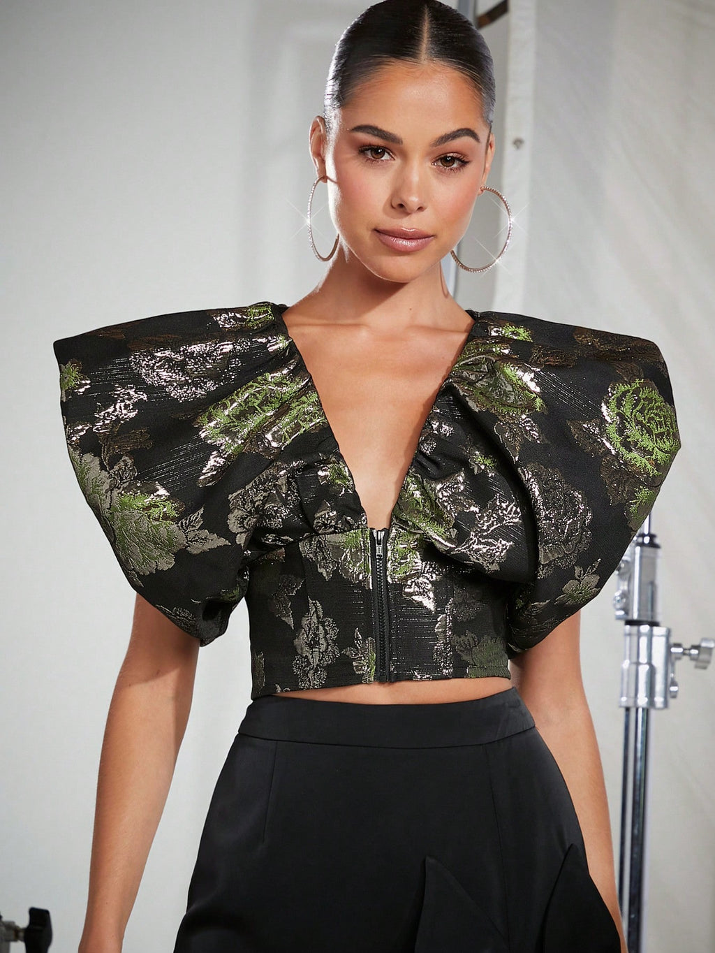 MIU Jacquard Exaggerated Sleeve Crop Top