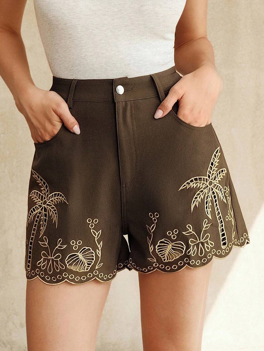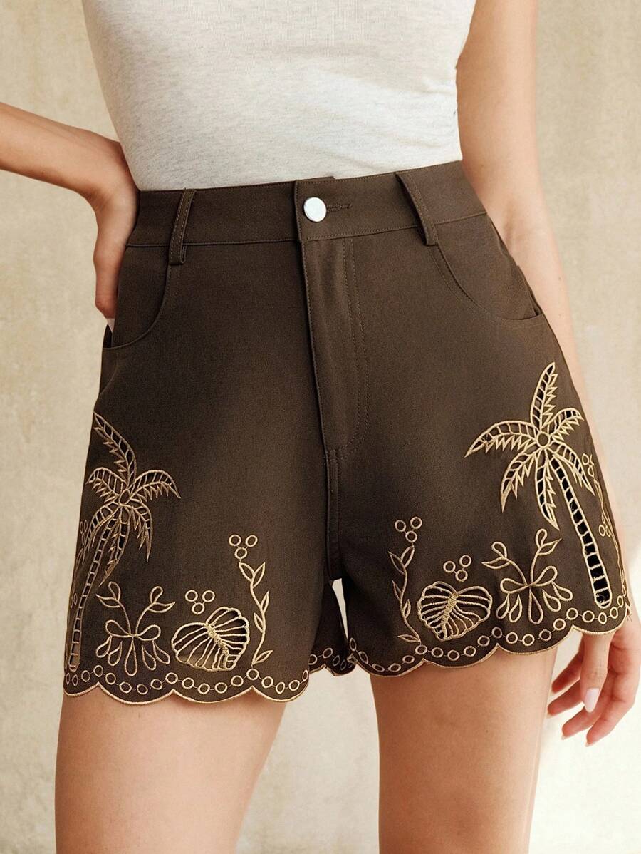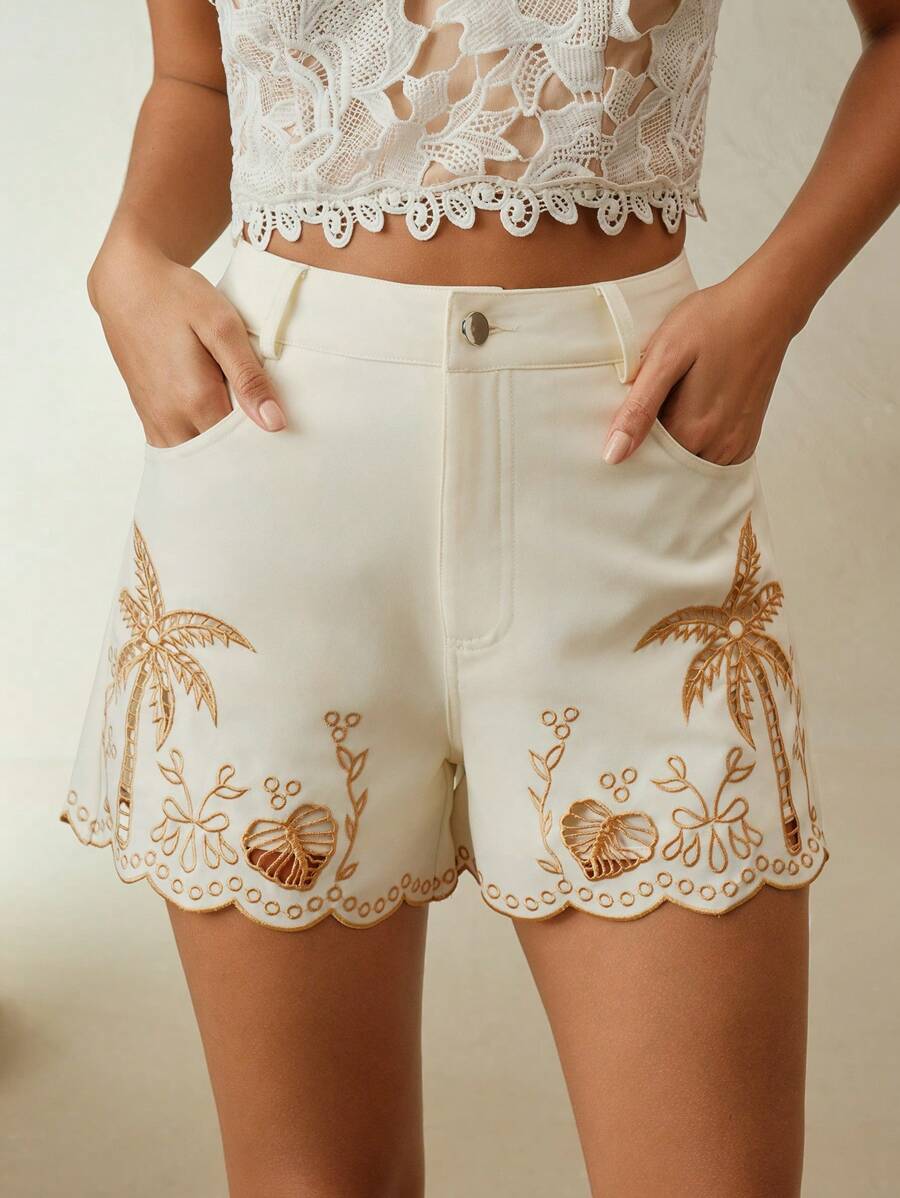 MIU Ladies' Spring And Summer Heavy Craftsmanship Laser Embroidery Coconut Tree Fashionable And Elegant Shorts Summer,Festival,Holiday,Vacation,Elegant,Casaul,Beach Outfits For Woman