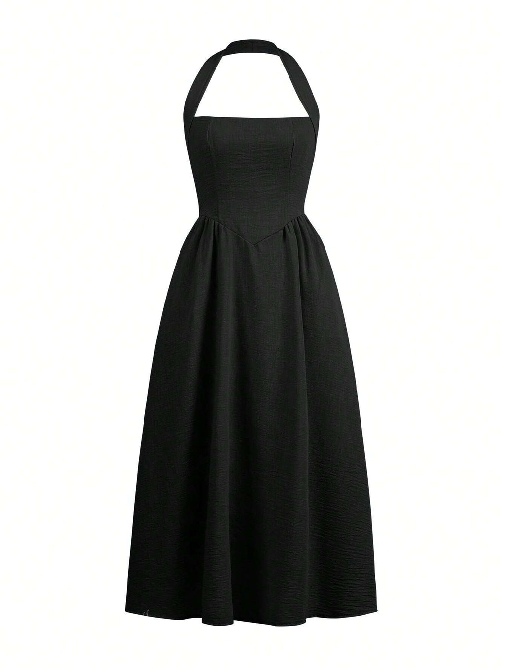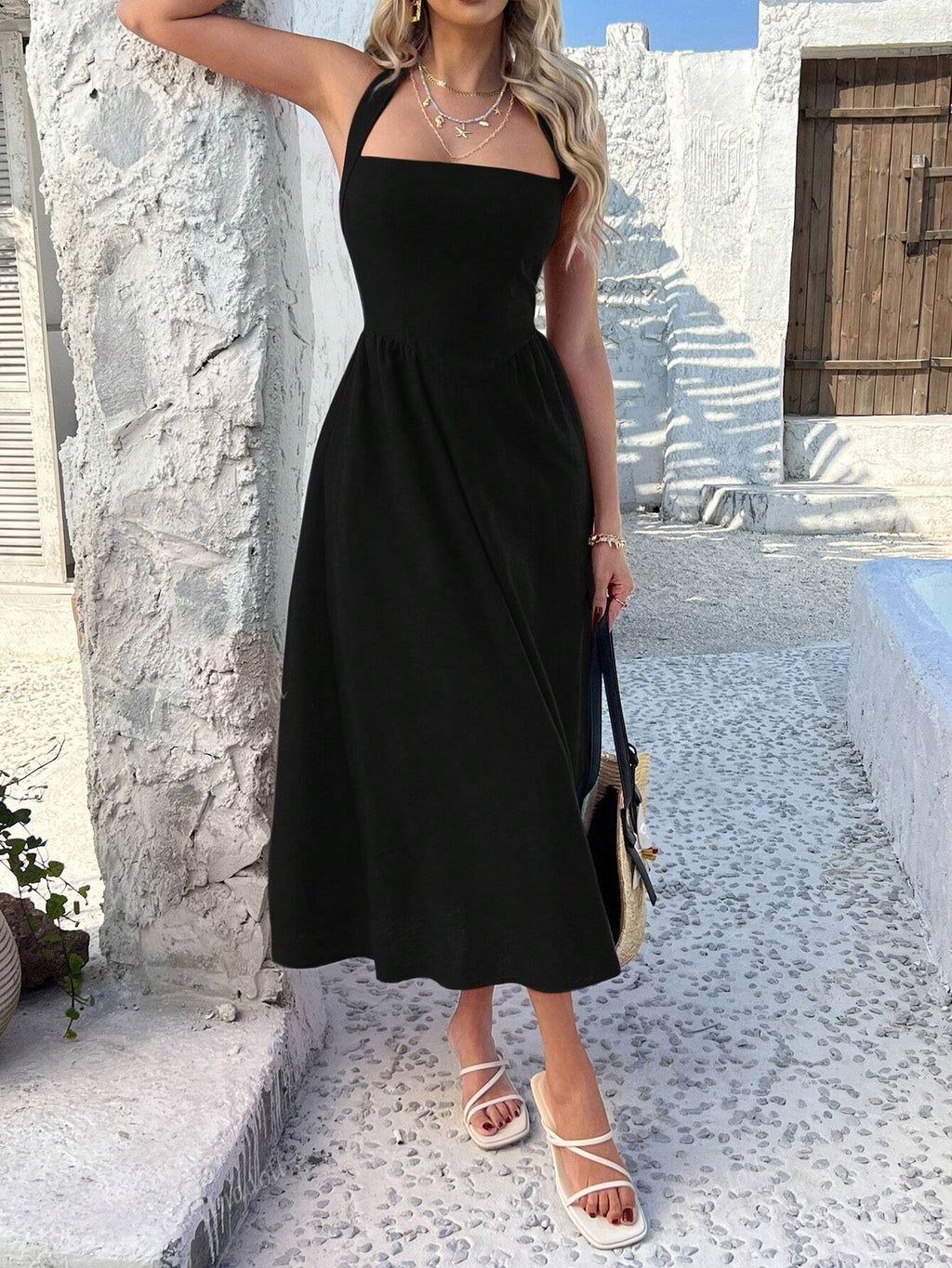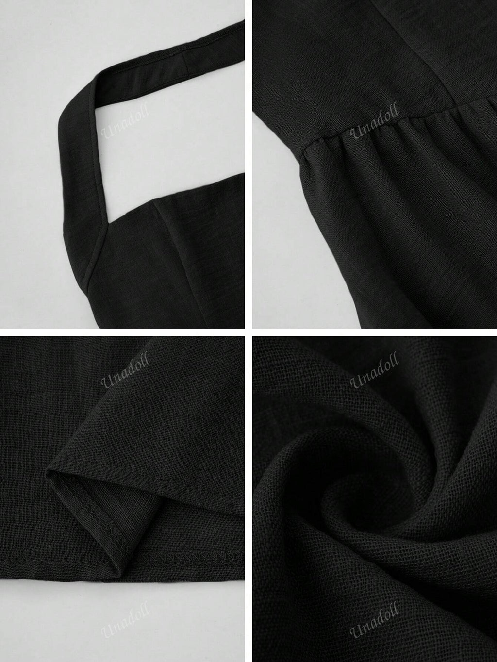 MIU AZRA Ženska Crna Crep Haljina sa Nabranom Ovratnikom i Rukavima u Zvonu