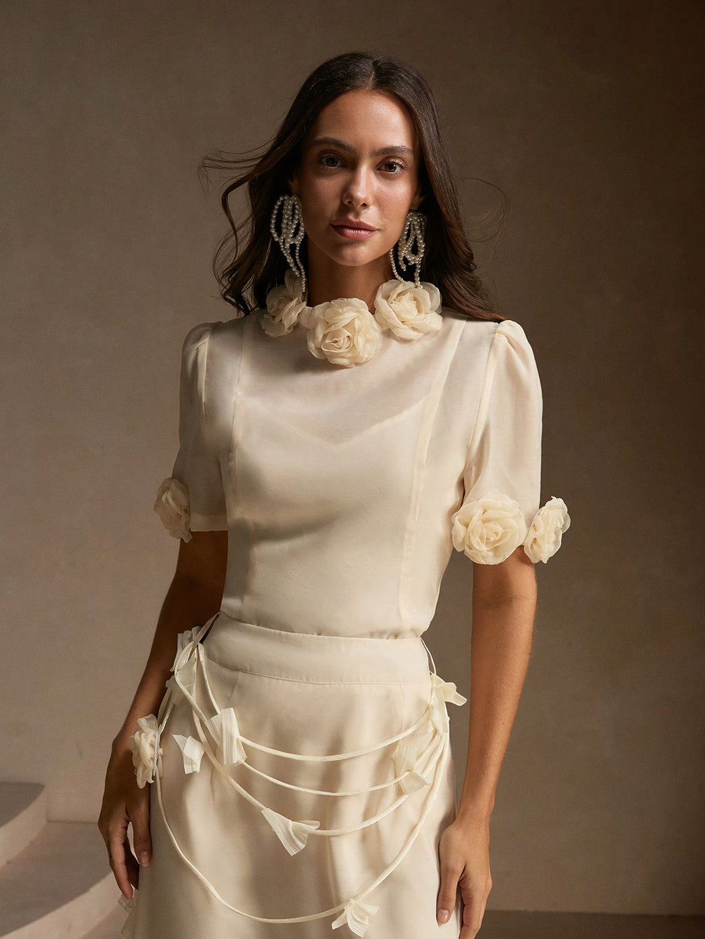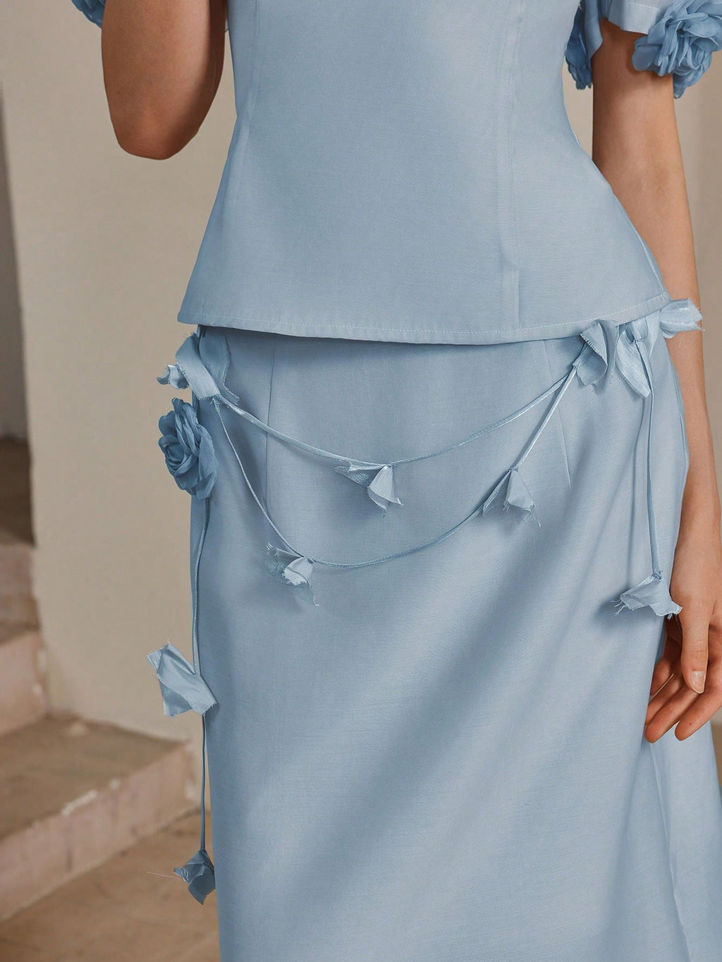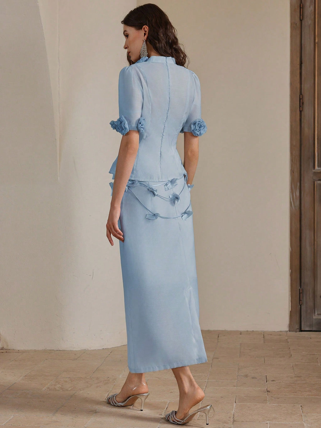 MIU Ladies' Summer 3D Floral V-Neck Dress With Short Sleeve Elegant Two-Piece Set