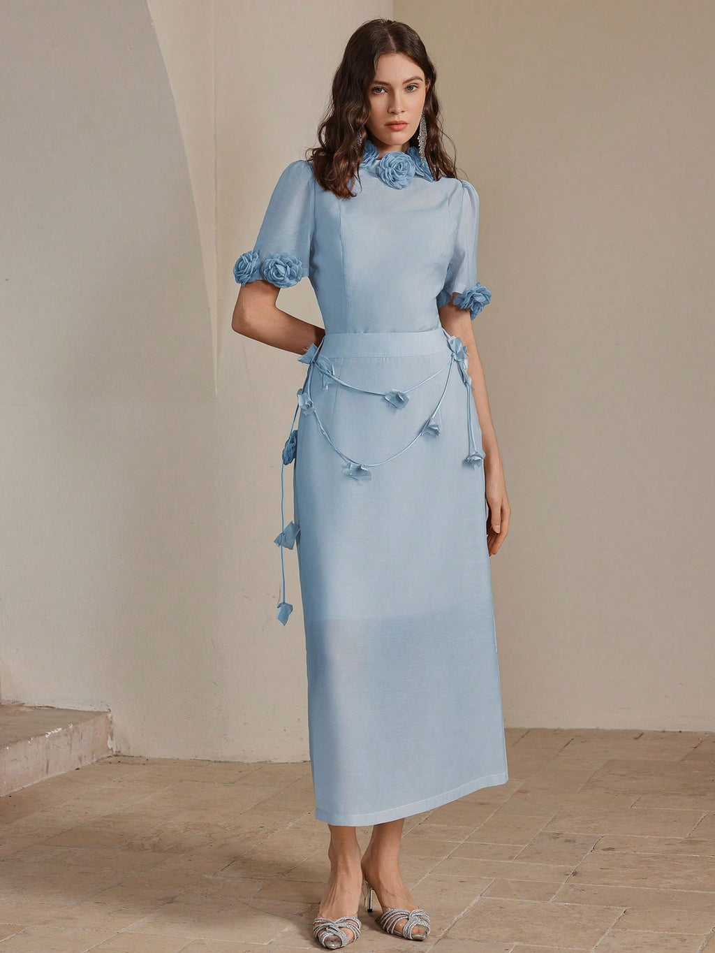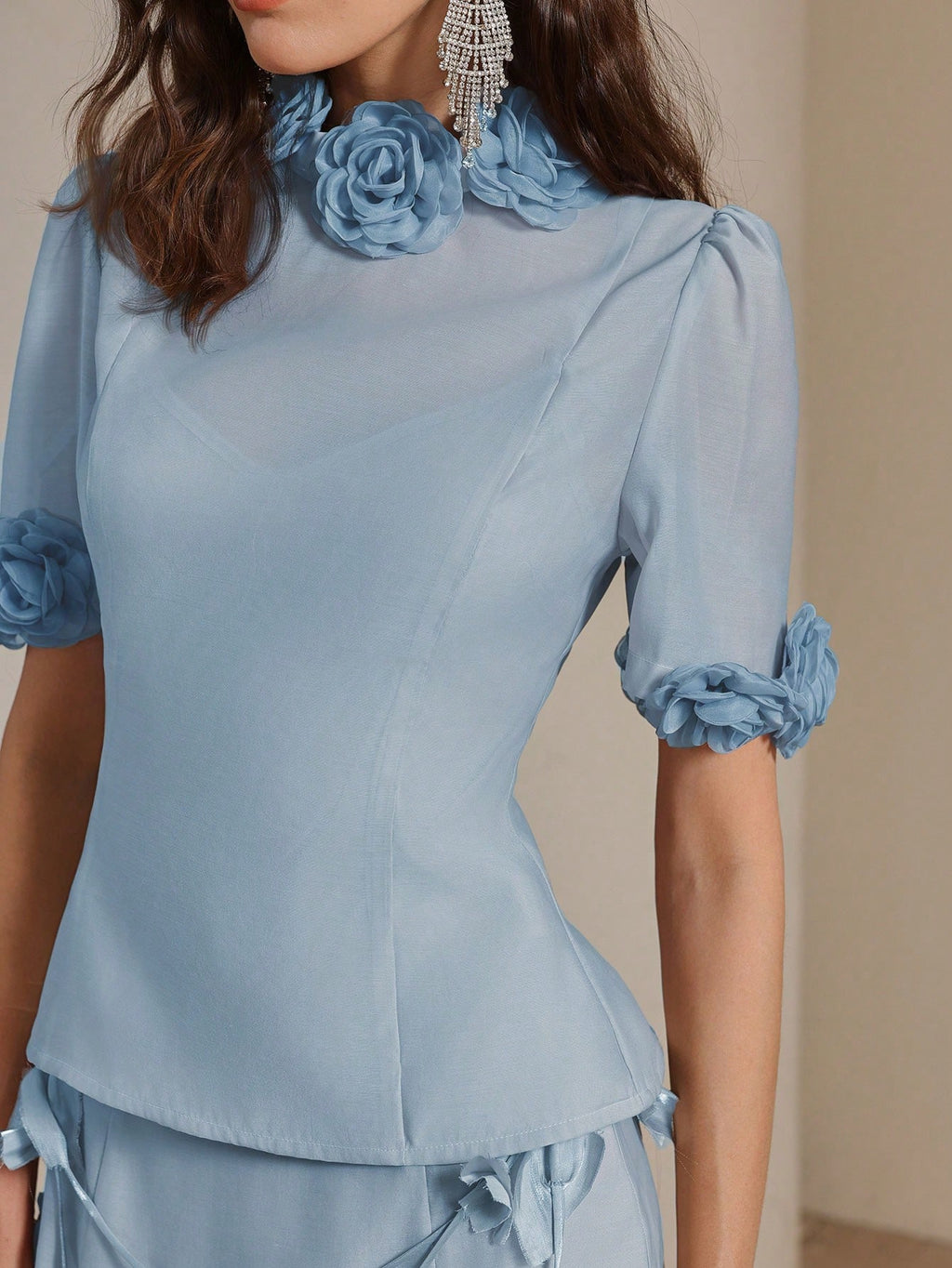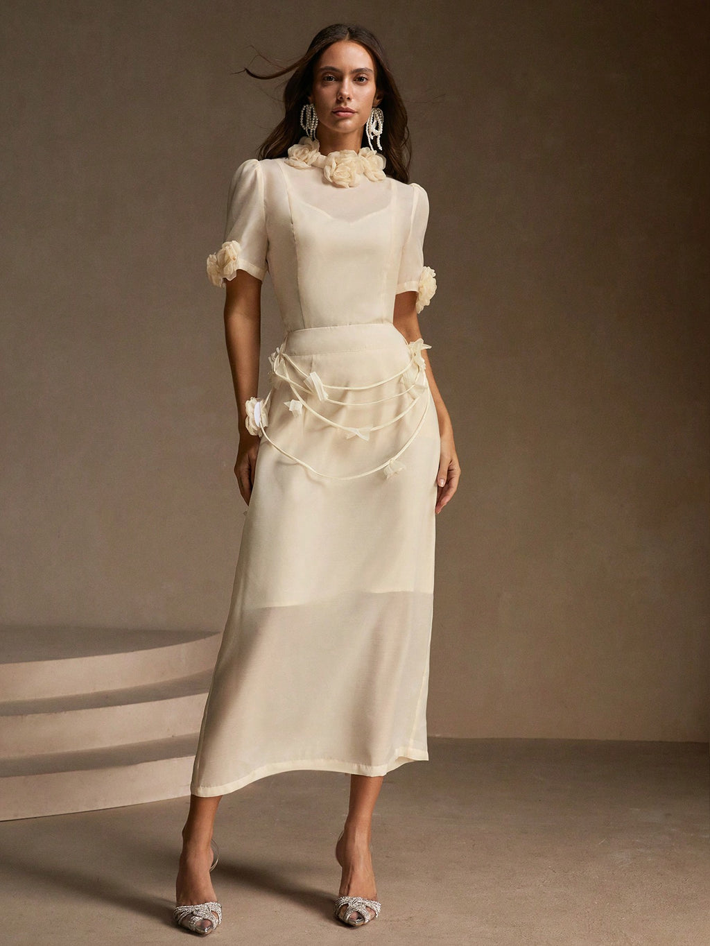MIU Ladies' Summer 3D Floral V-Neck Dress With Short Sleeve Elegant Two-Piece Set