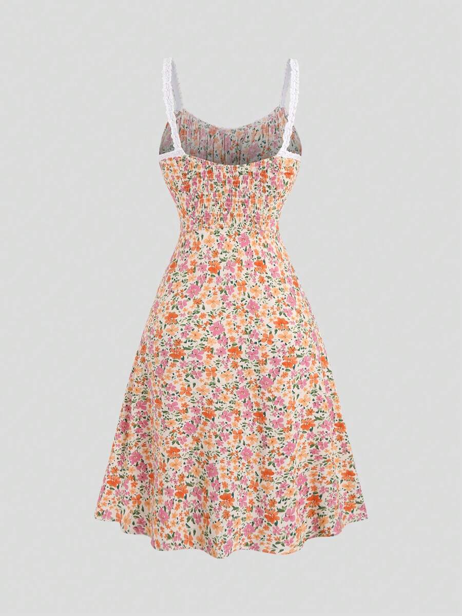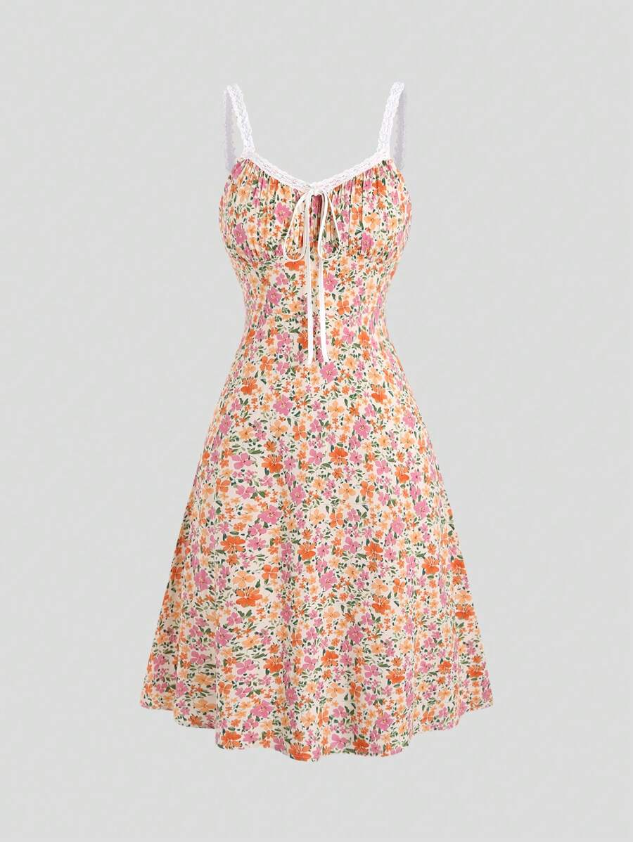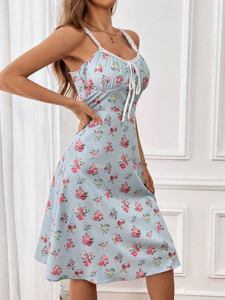 MIU Ladies' Summer Contrast Lace Floral Print Vacation Style Dress Maxi Women Outfit
