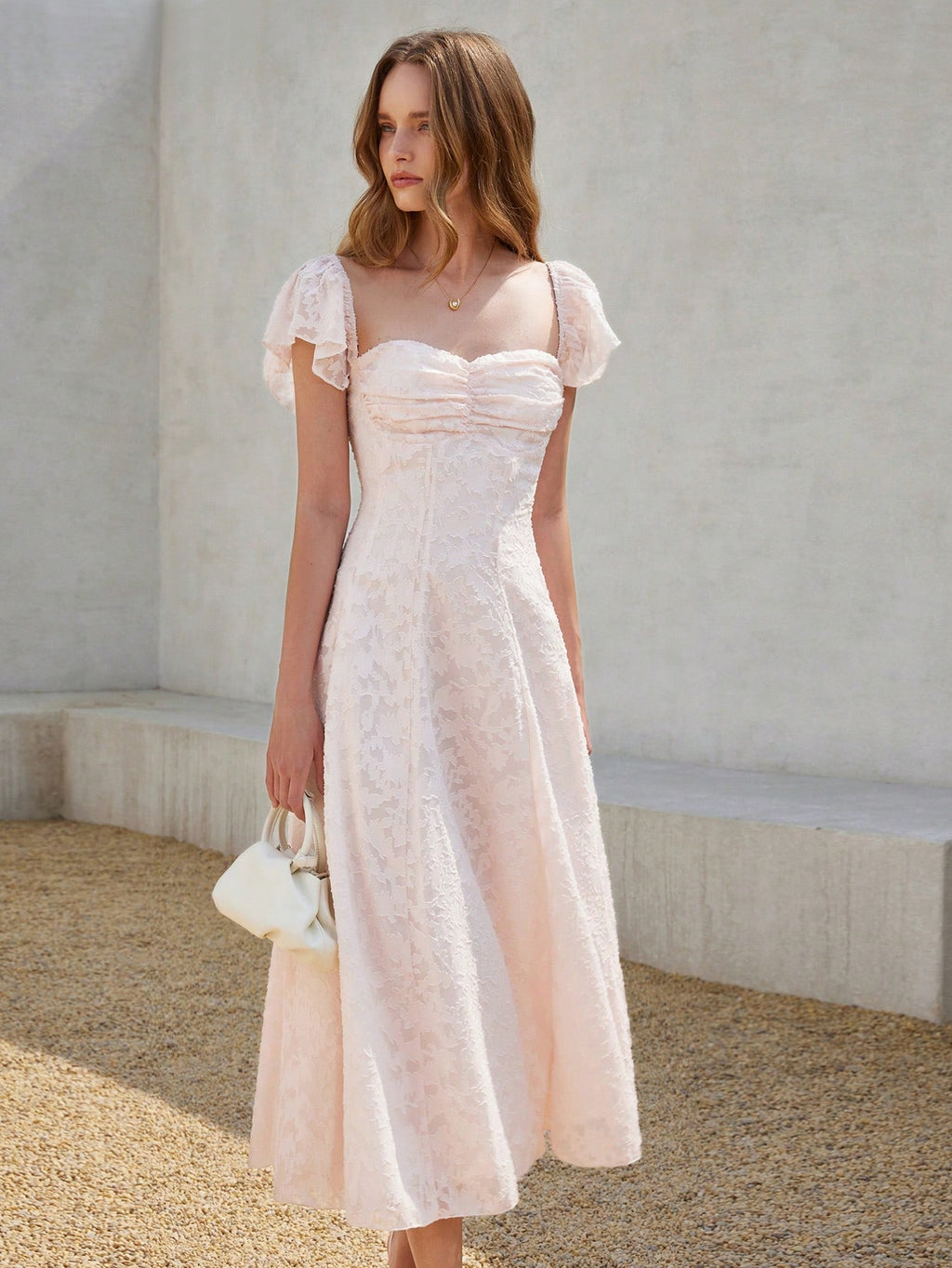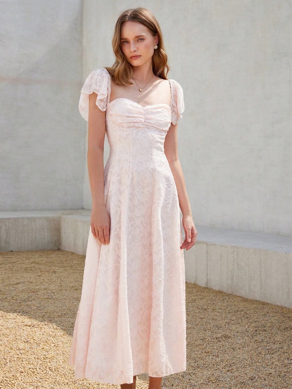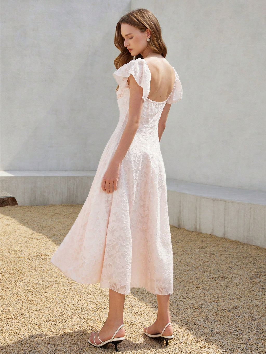 MIU Long Jacquard Cutout Ruffle Sleeve Summer Dress, French Fashion Style Elegant FashionableOld Money Style