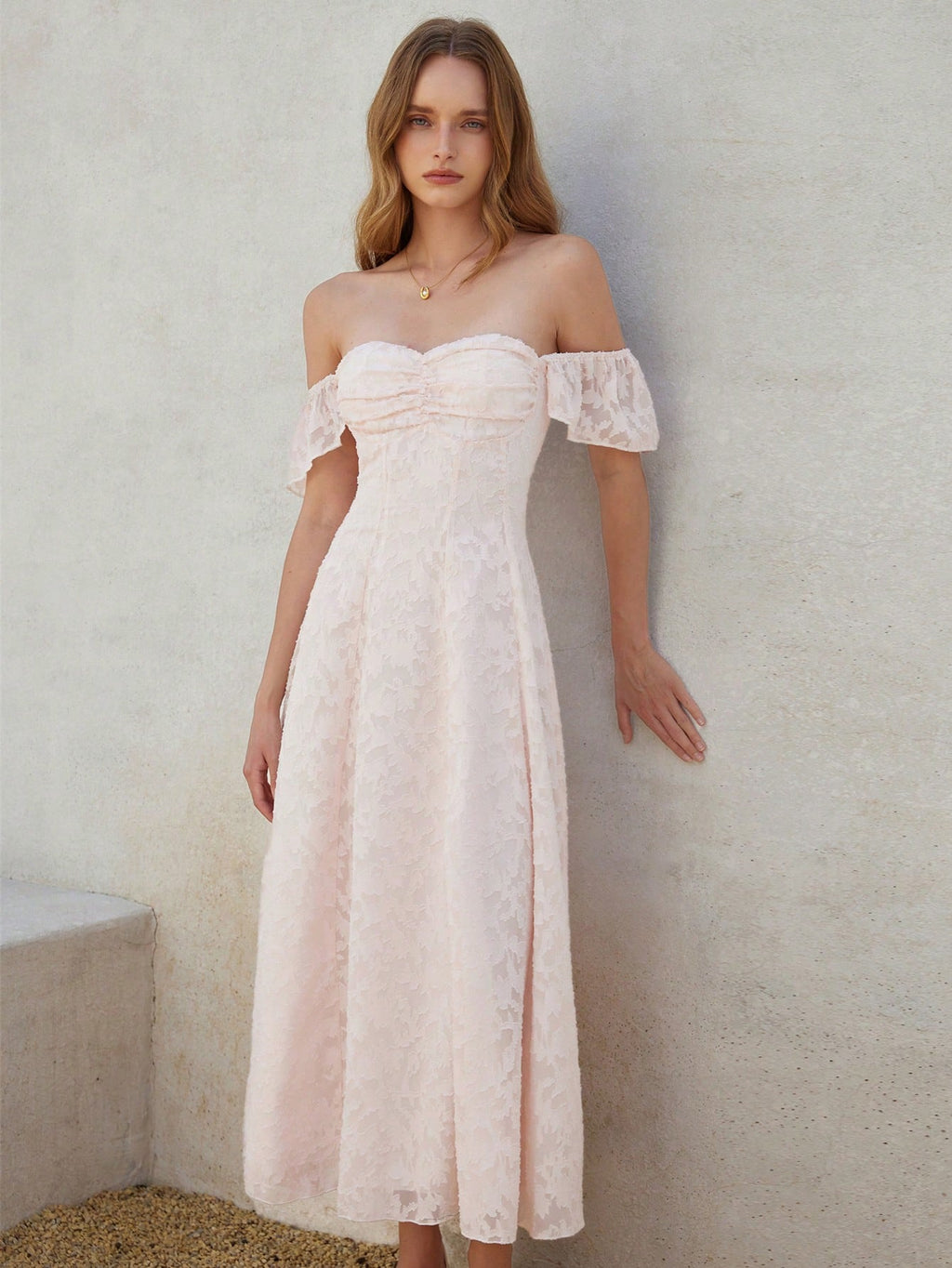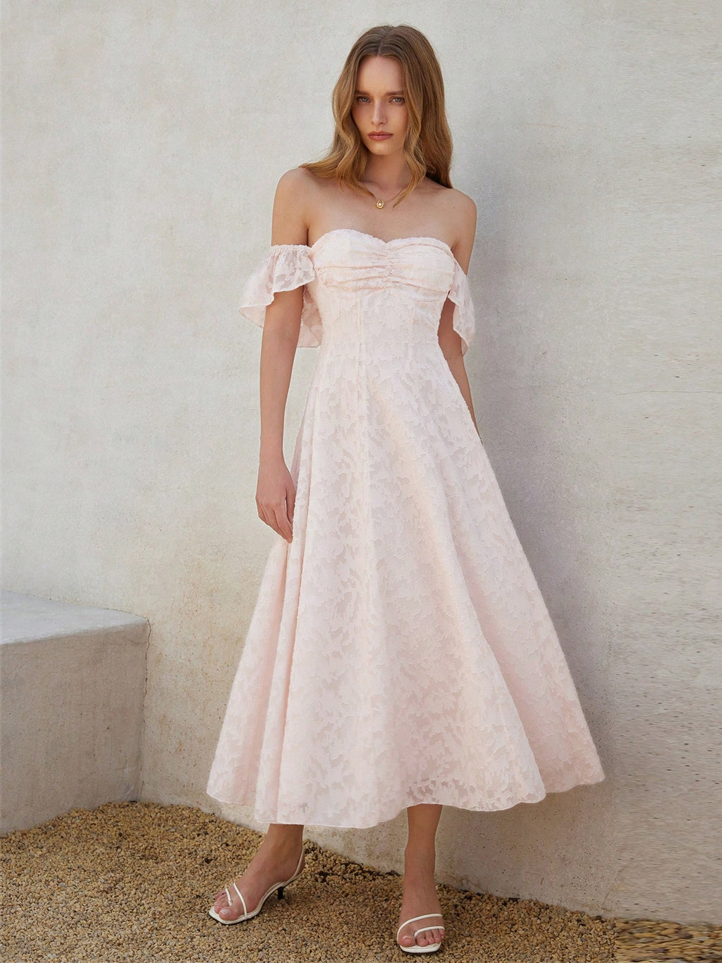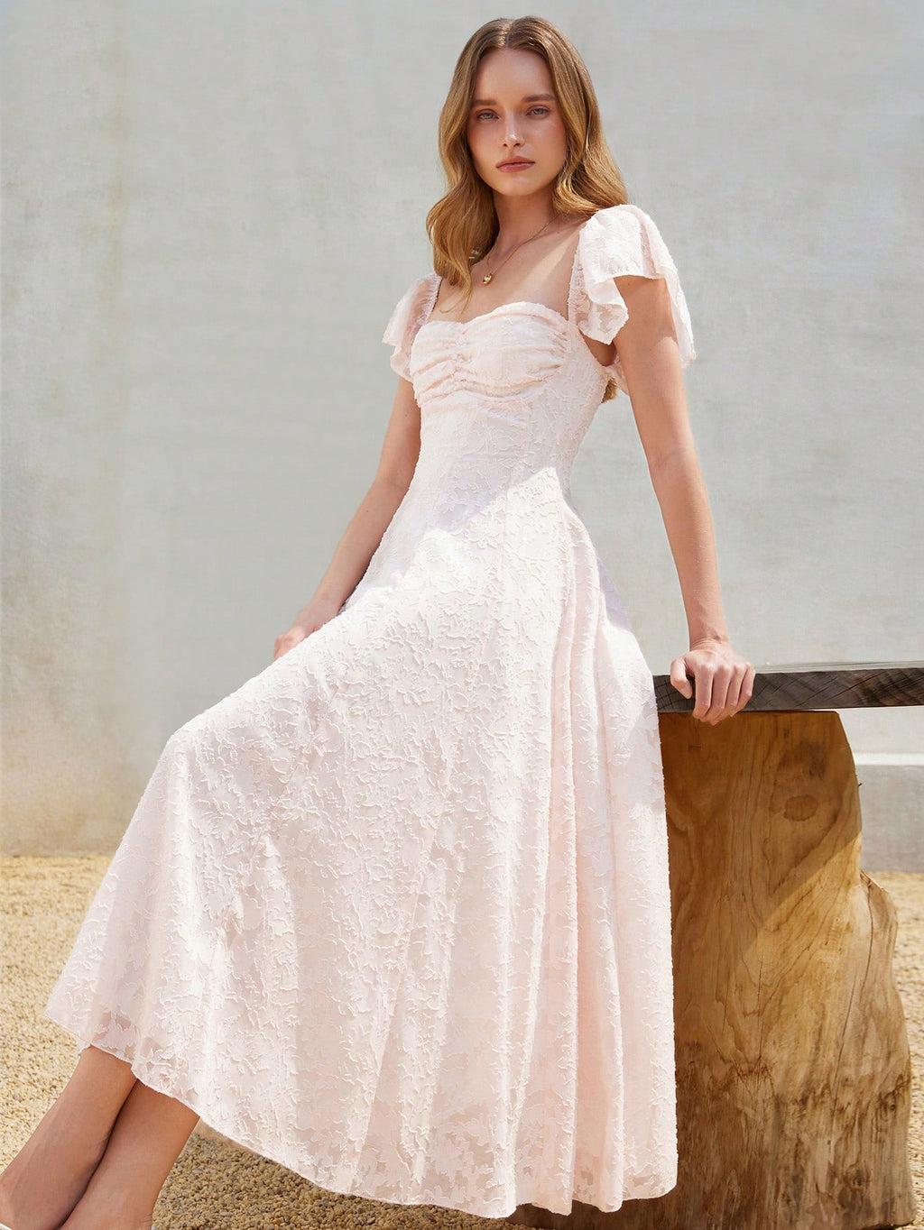 MIU Long Jacquard Cutout Ruffle Sleeve Summer Dress, French Fashion Style Elegant FashionableOld Money Style