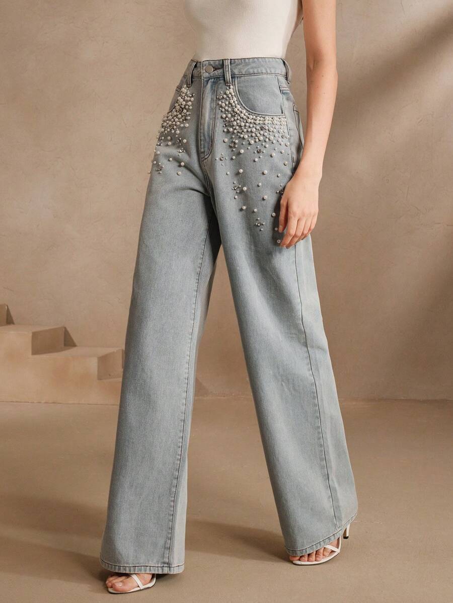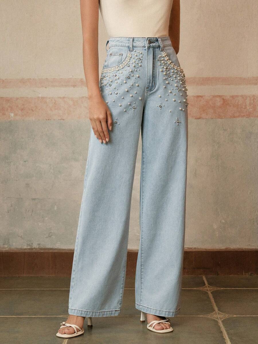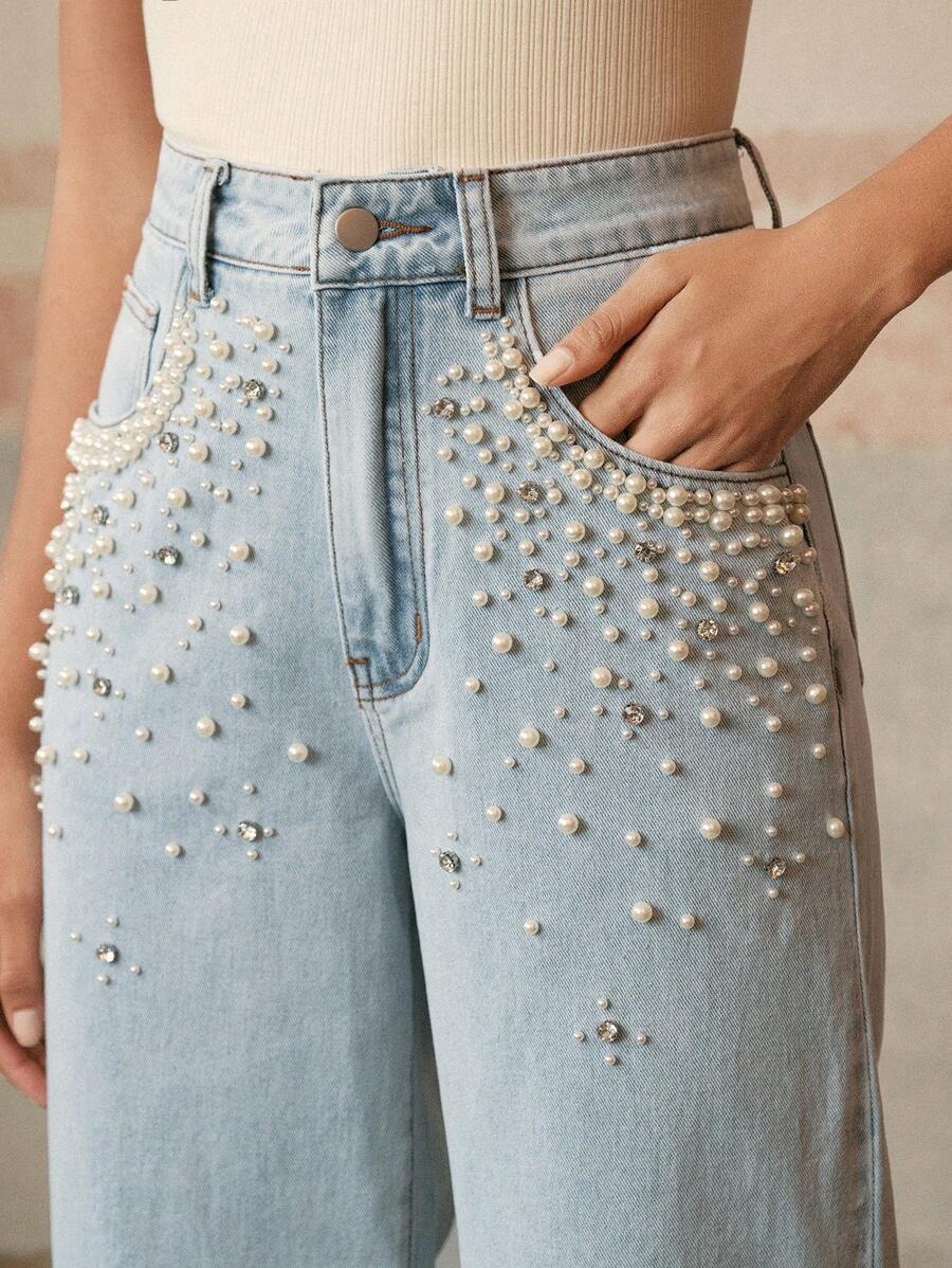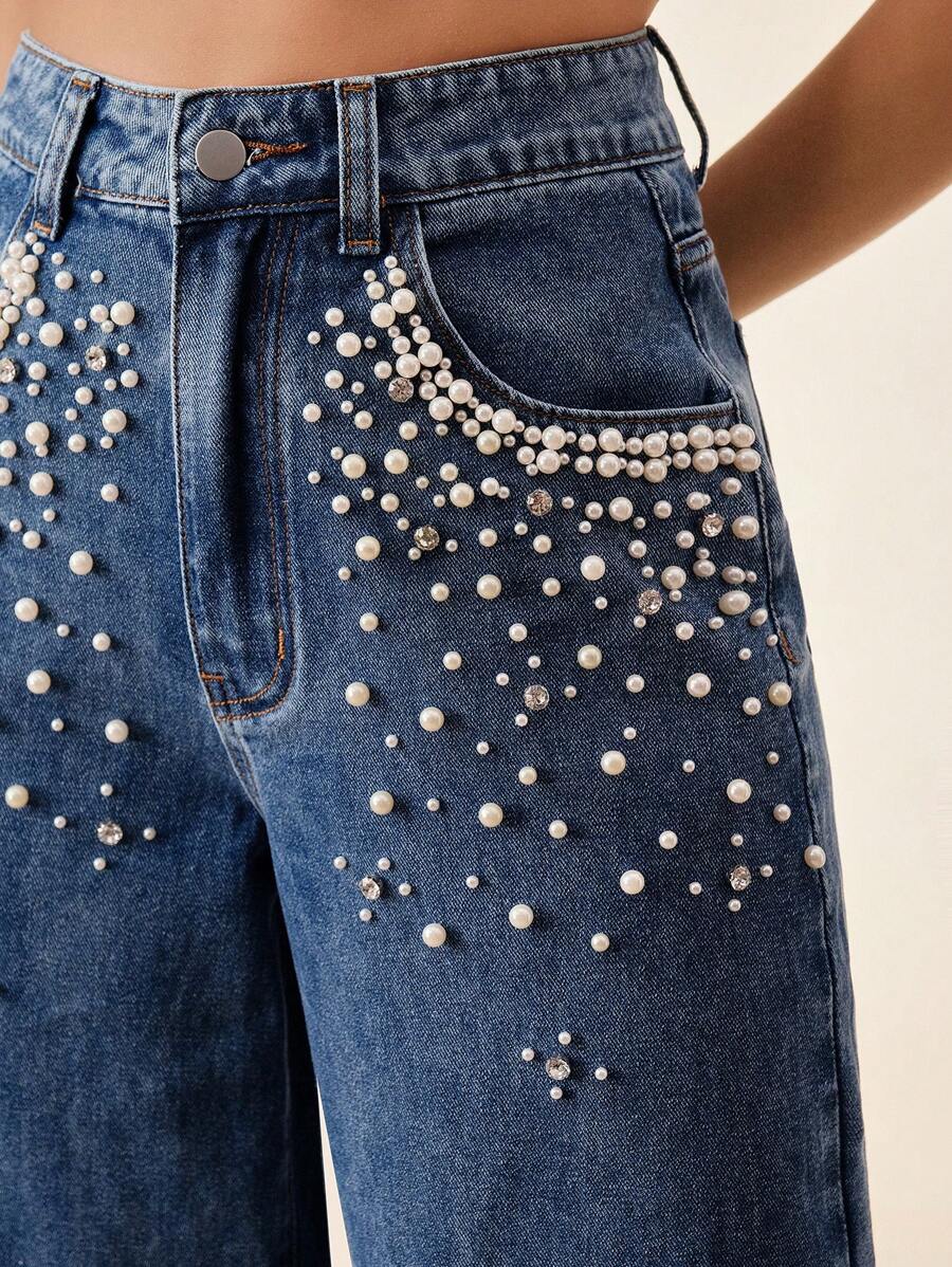 MIU Loose Fit Beaded Decorated Wide-Leg Jeans Pants For Women