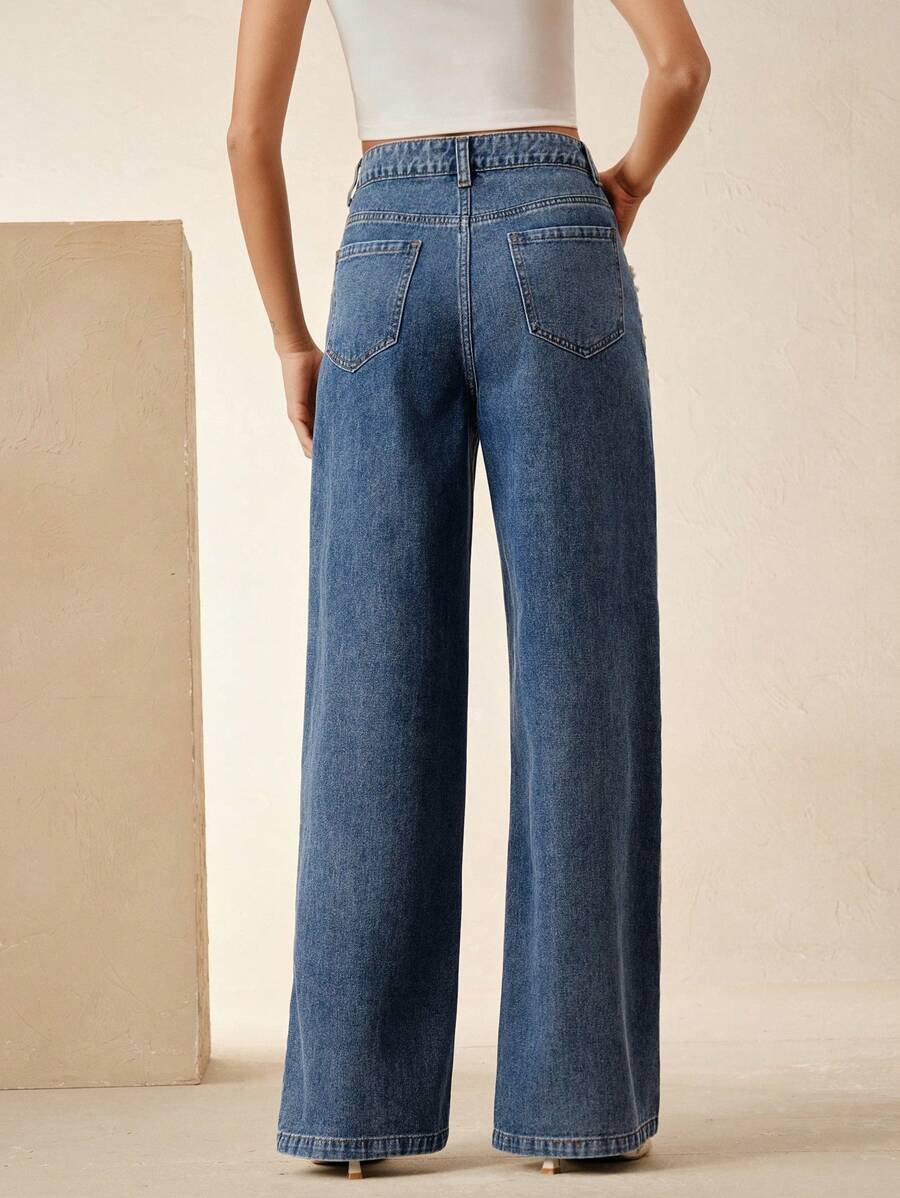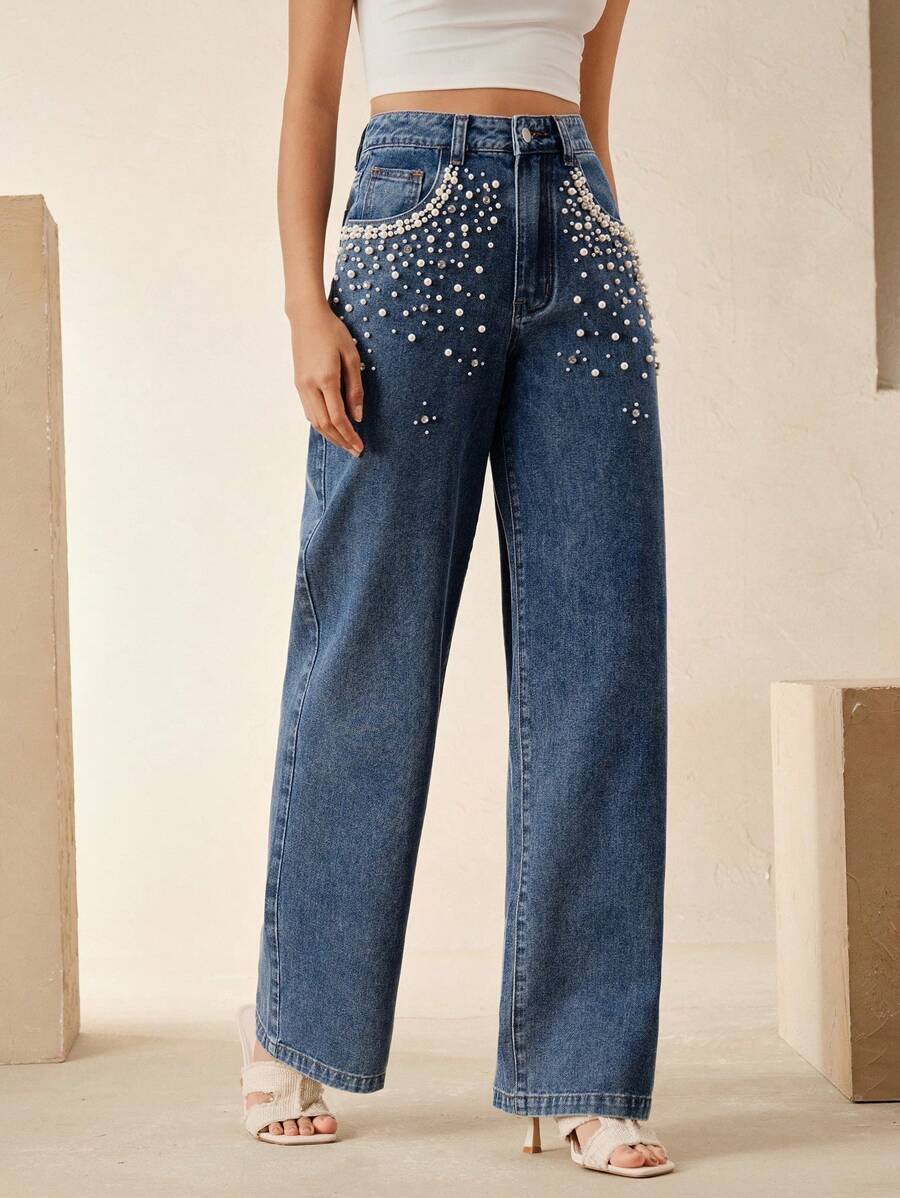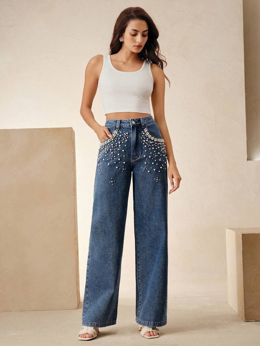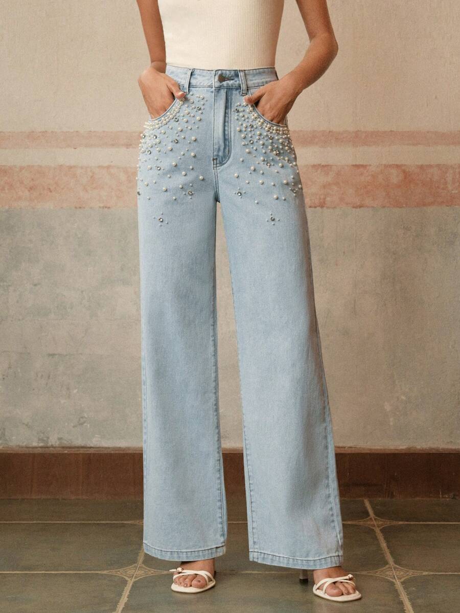 MIU Loose Fit Beaded Decorated Wide-Leg Jeans Pants For Women