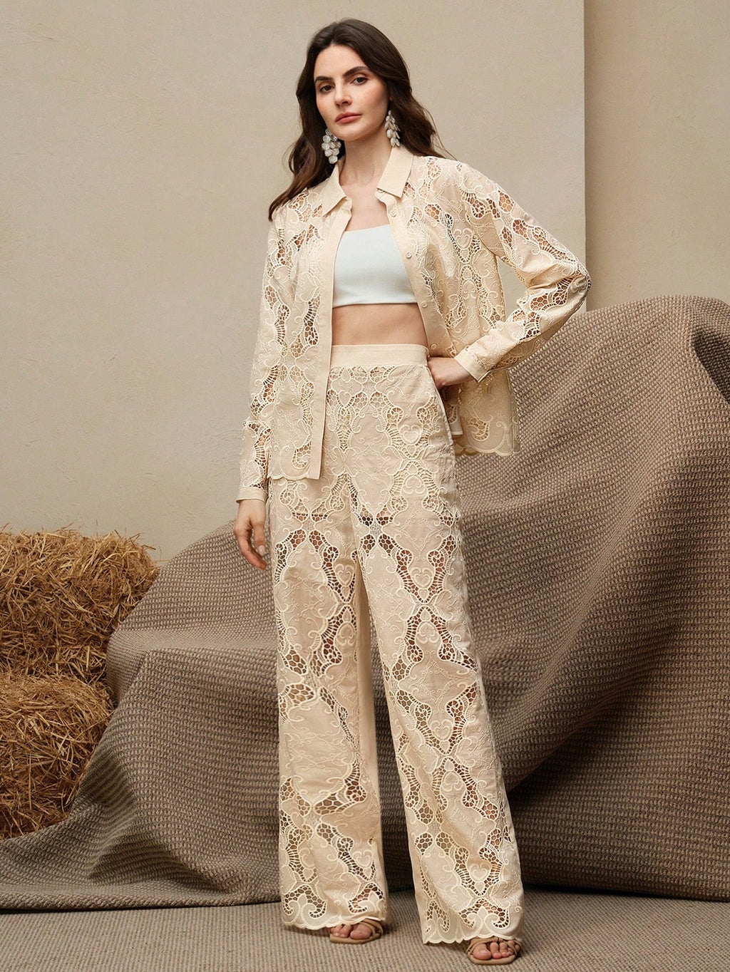 MIU Luxury Perforated Embroidery Sleeveless Blouse And Wide Leg Pants Set, Spring/Summer