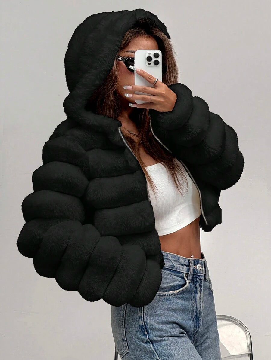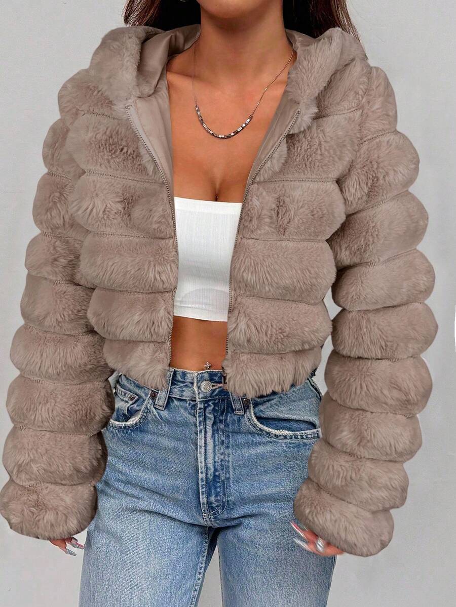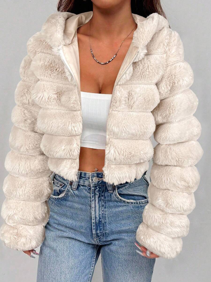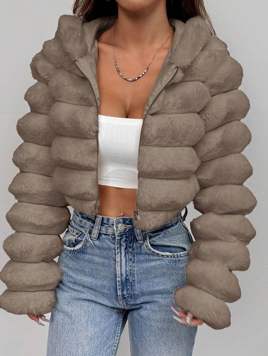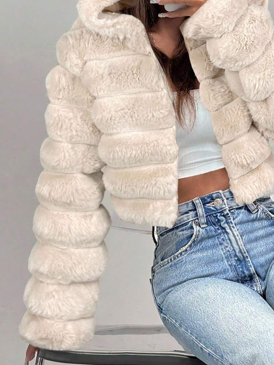 MIU MAJA EZwear ženska moderna kratka jakna s kapuljačom i pahuljastom (fluffy) teksturom, u jednobojnom dizajnu, idealna za jesen i zimu