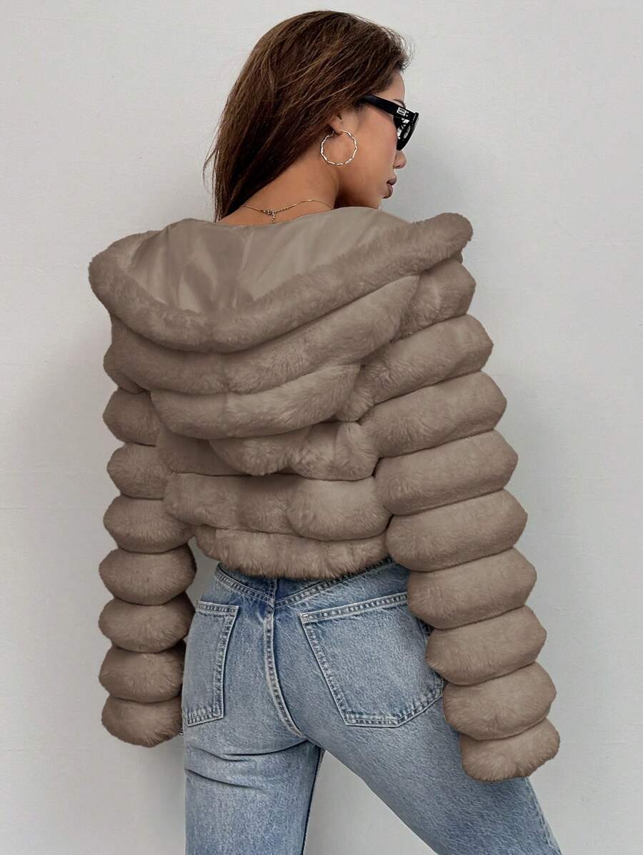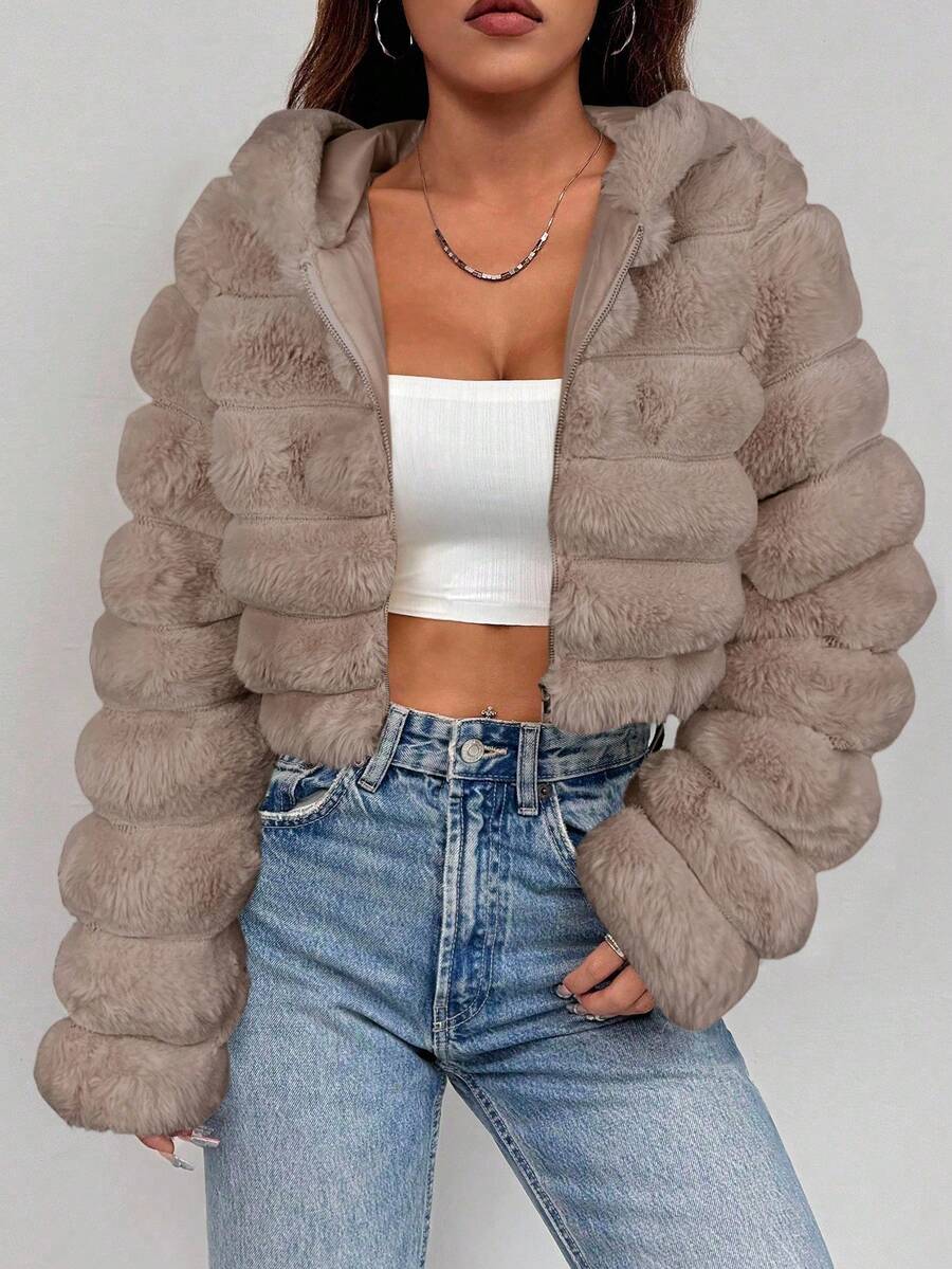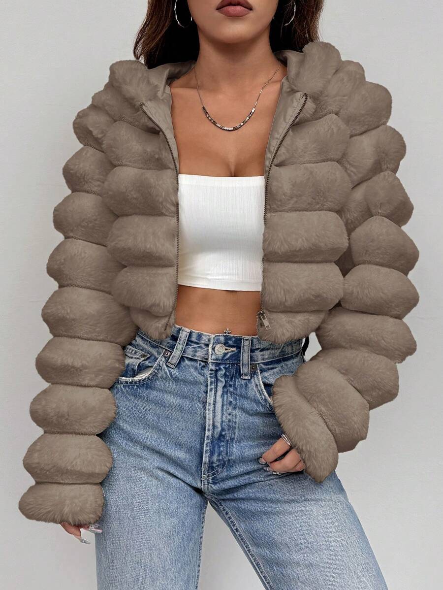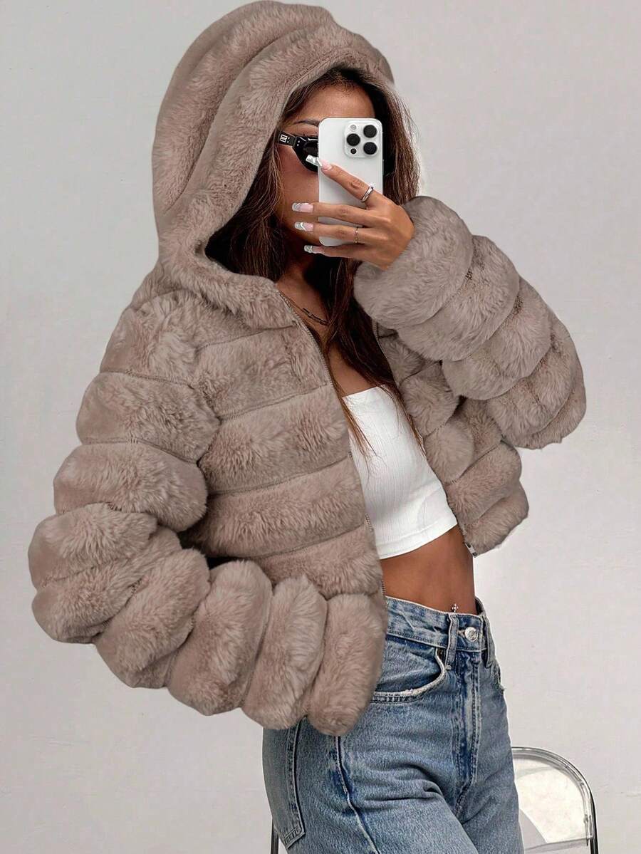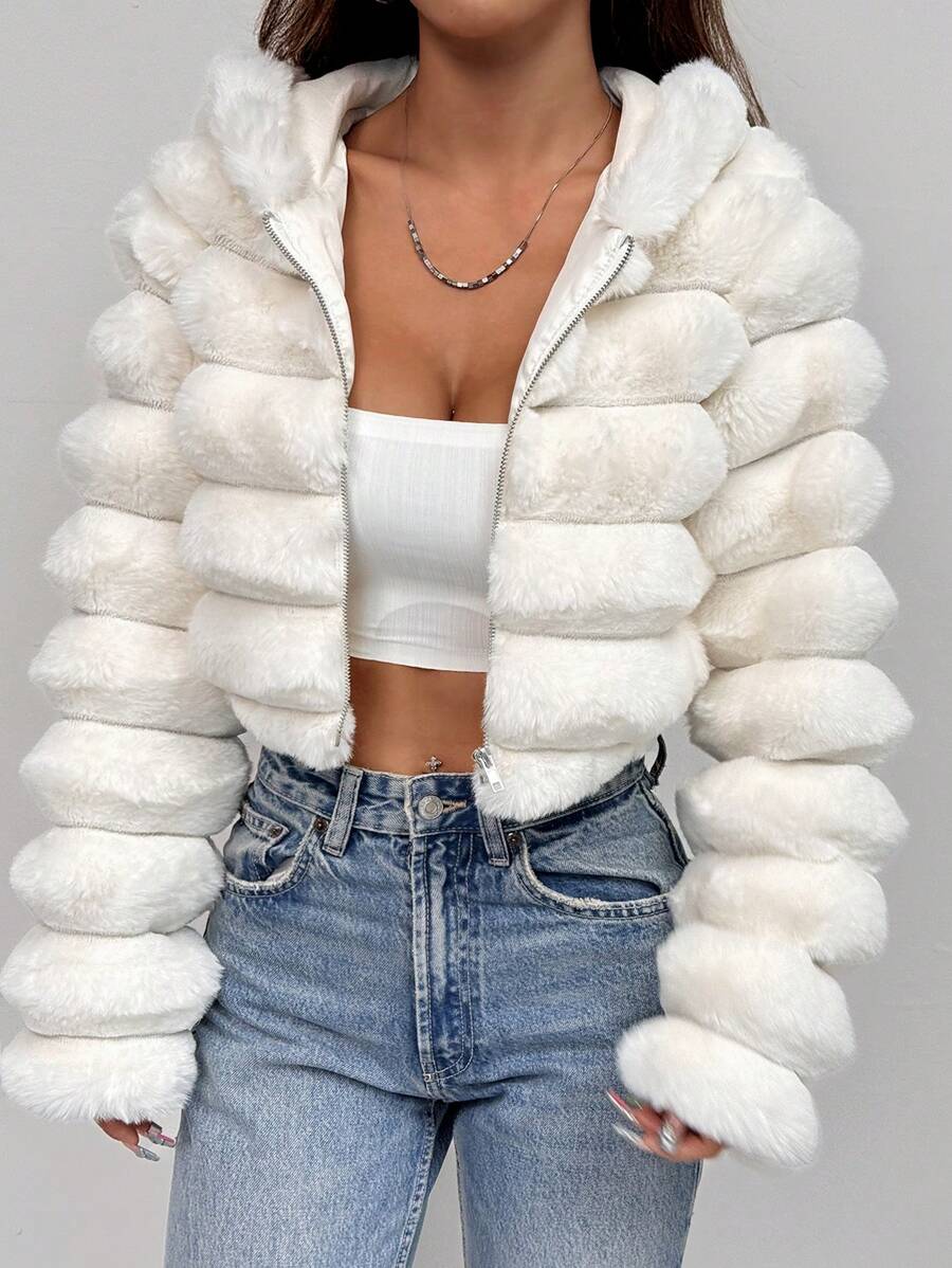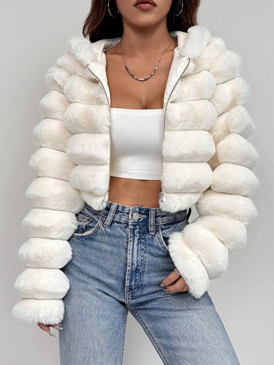 MIU MAJA EZwear ženska moderna kratka jakna s kapuljačom i pahuljastom (fluffy) teksturom, u jednobojnom dizajnu, idealna za jesen i zimu