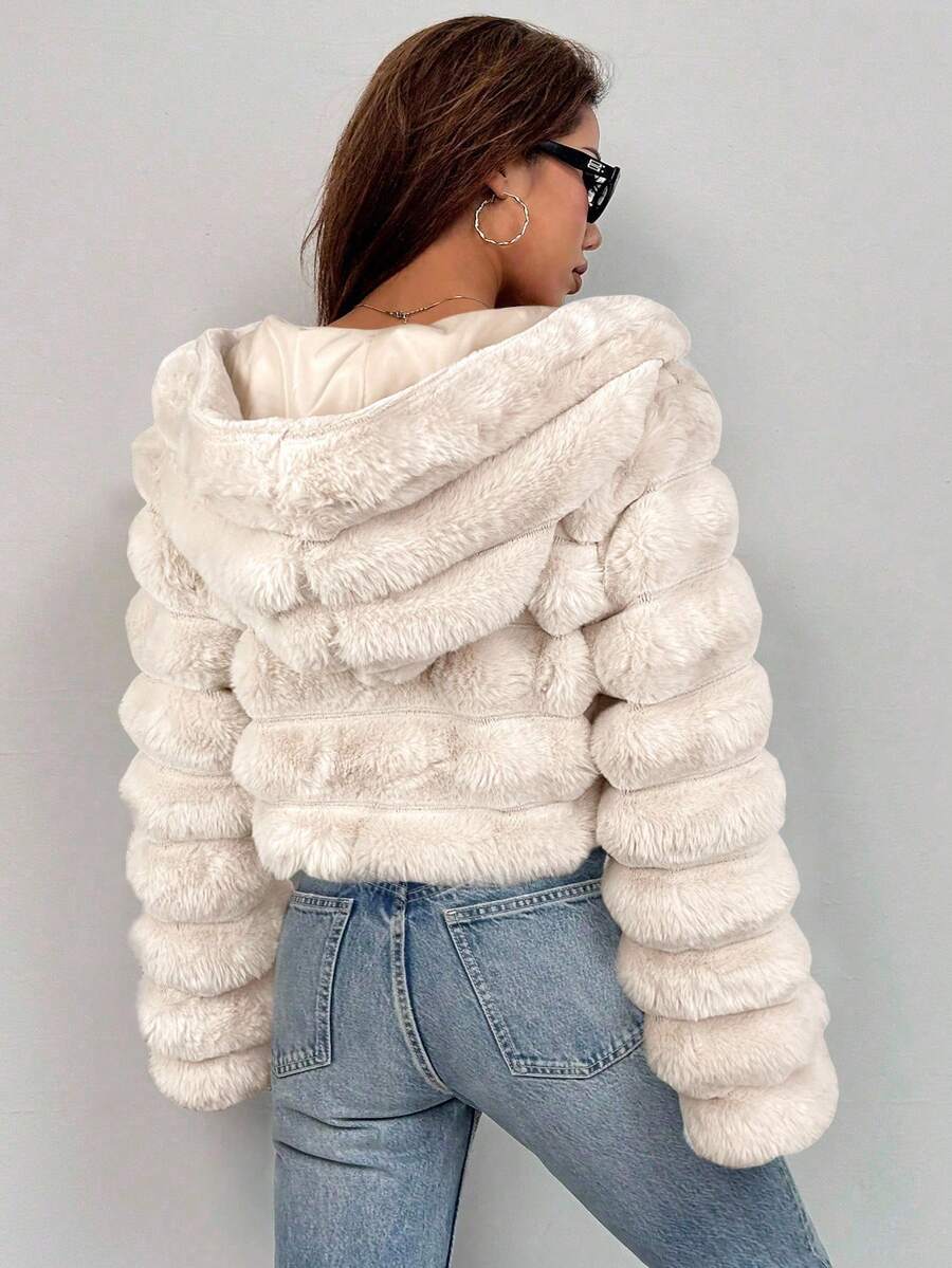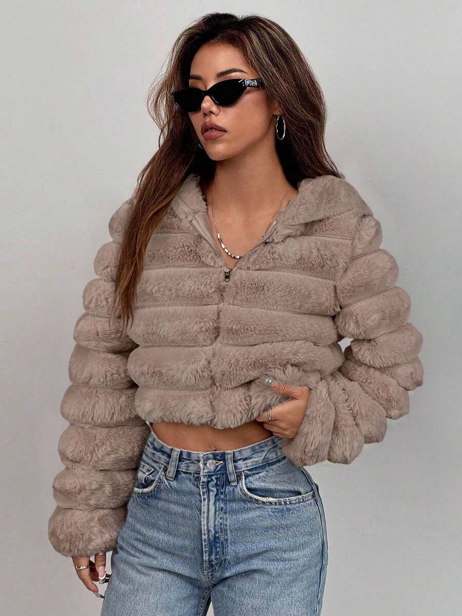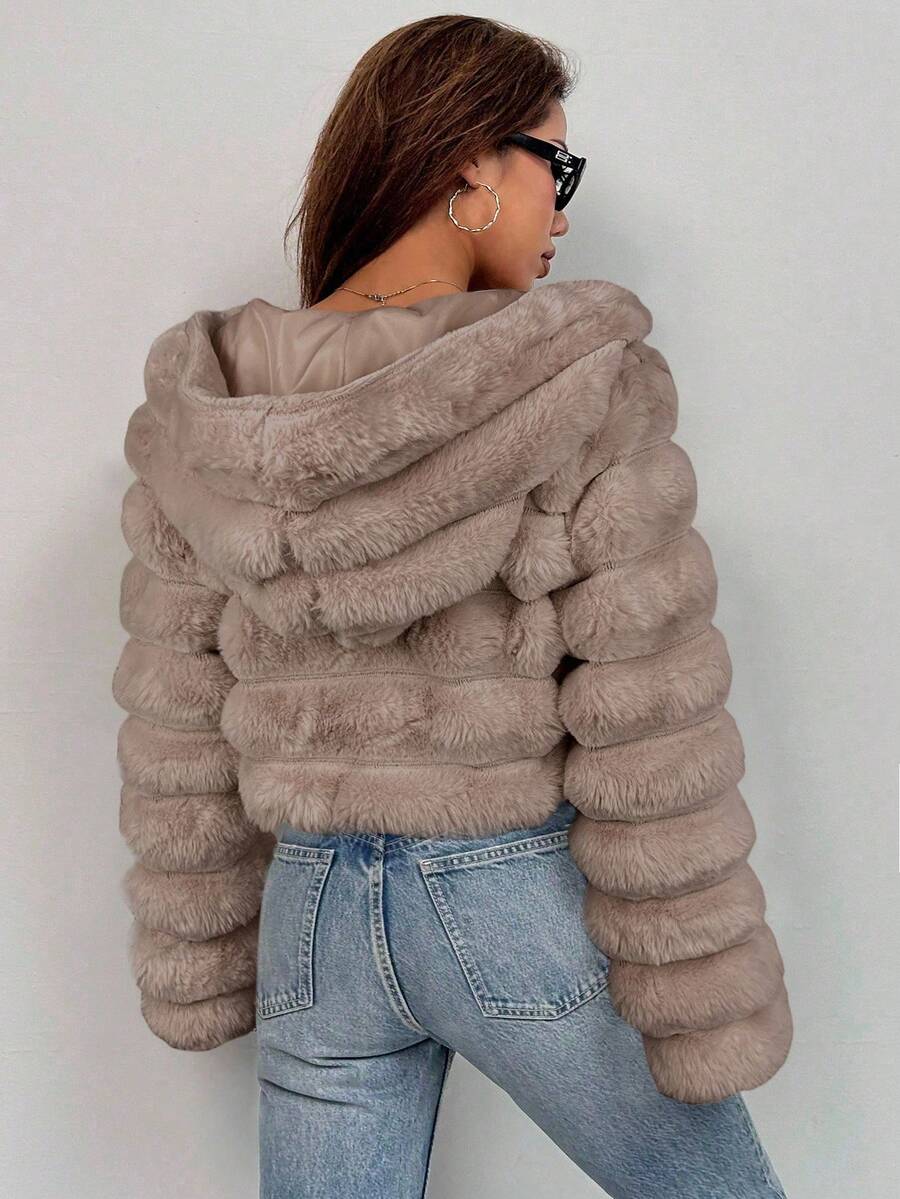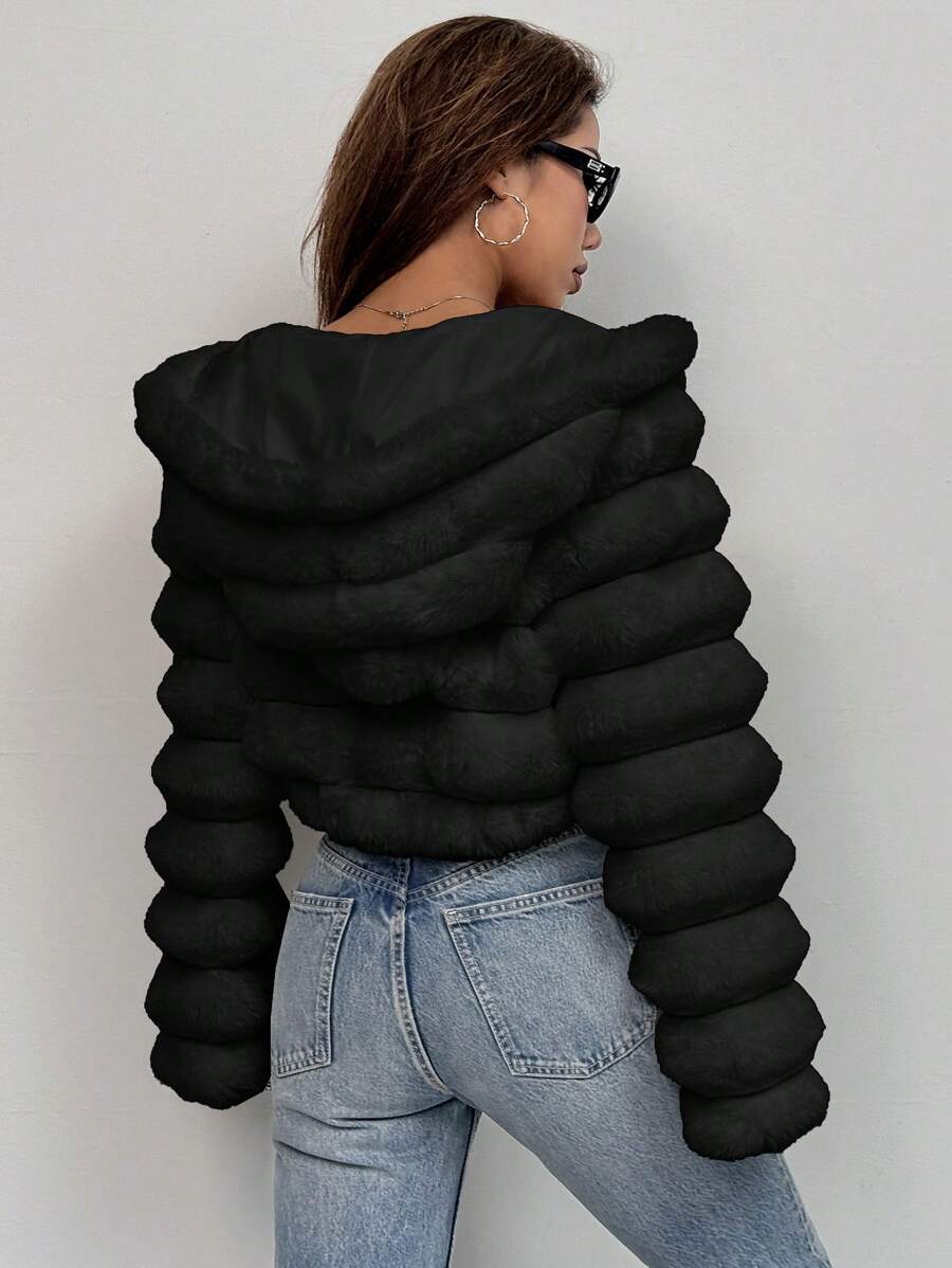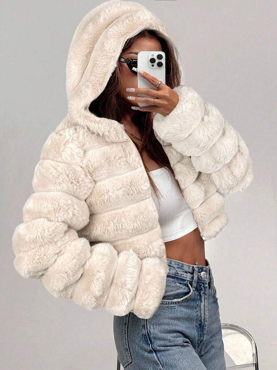 MIU MAJA EZwear ženska moderna kratka jakna s kapuljačom i pahuljastom (fluffy) teksturom, u jednobojnom dizajnu, idealna za jesen i zimu
