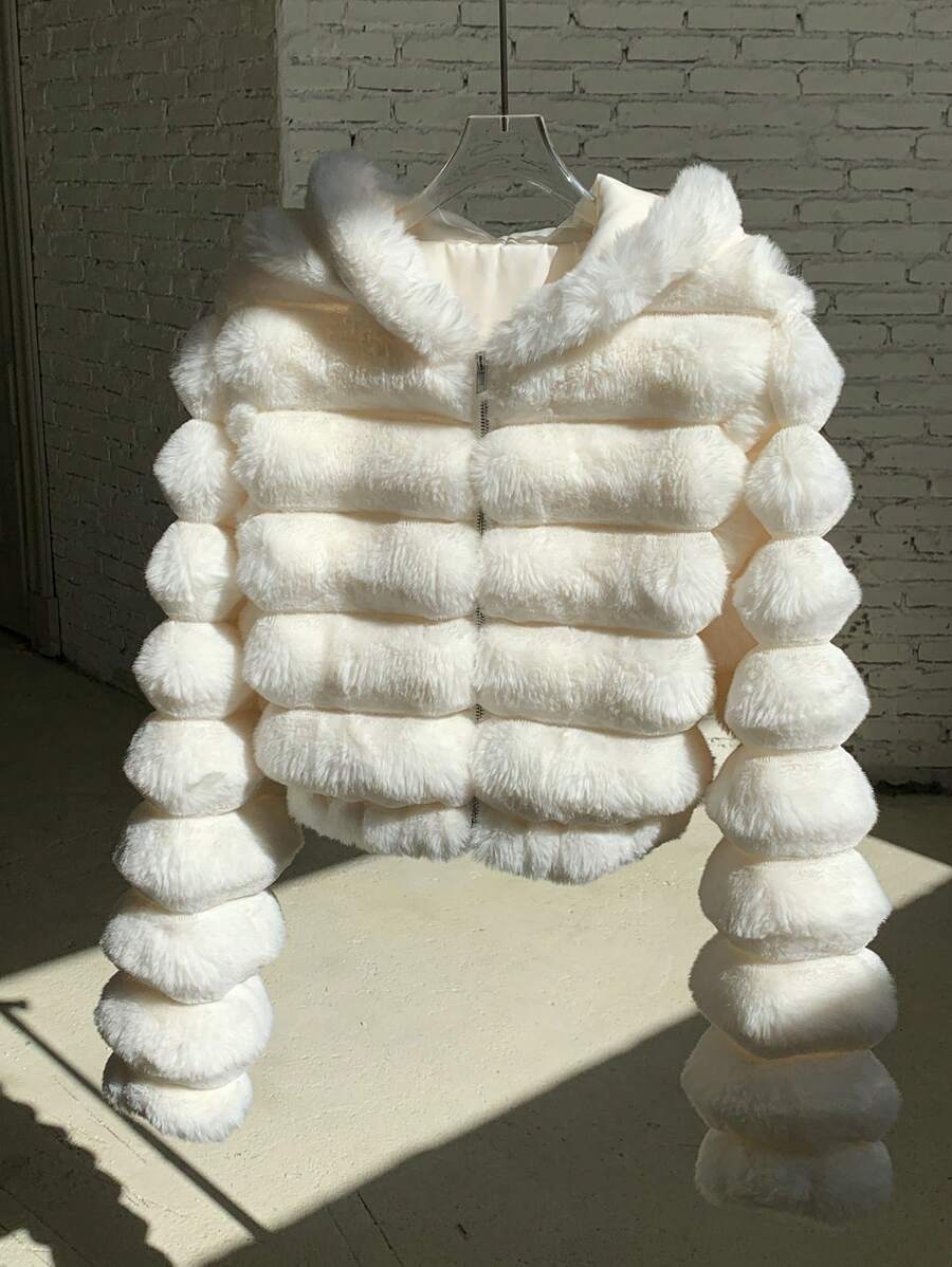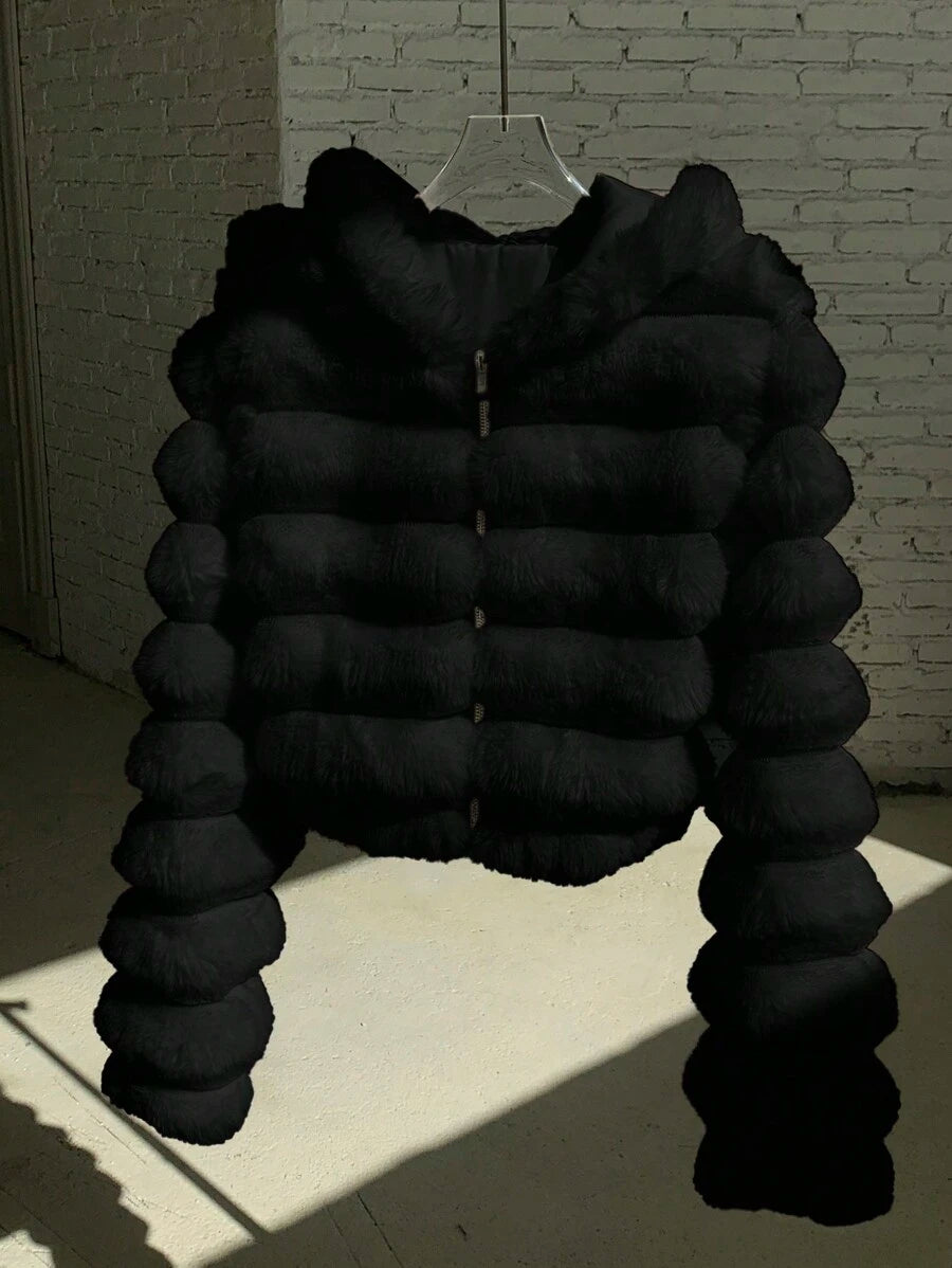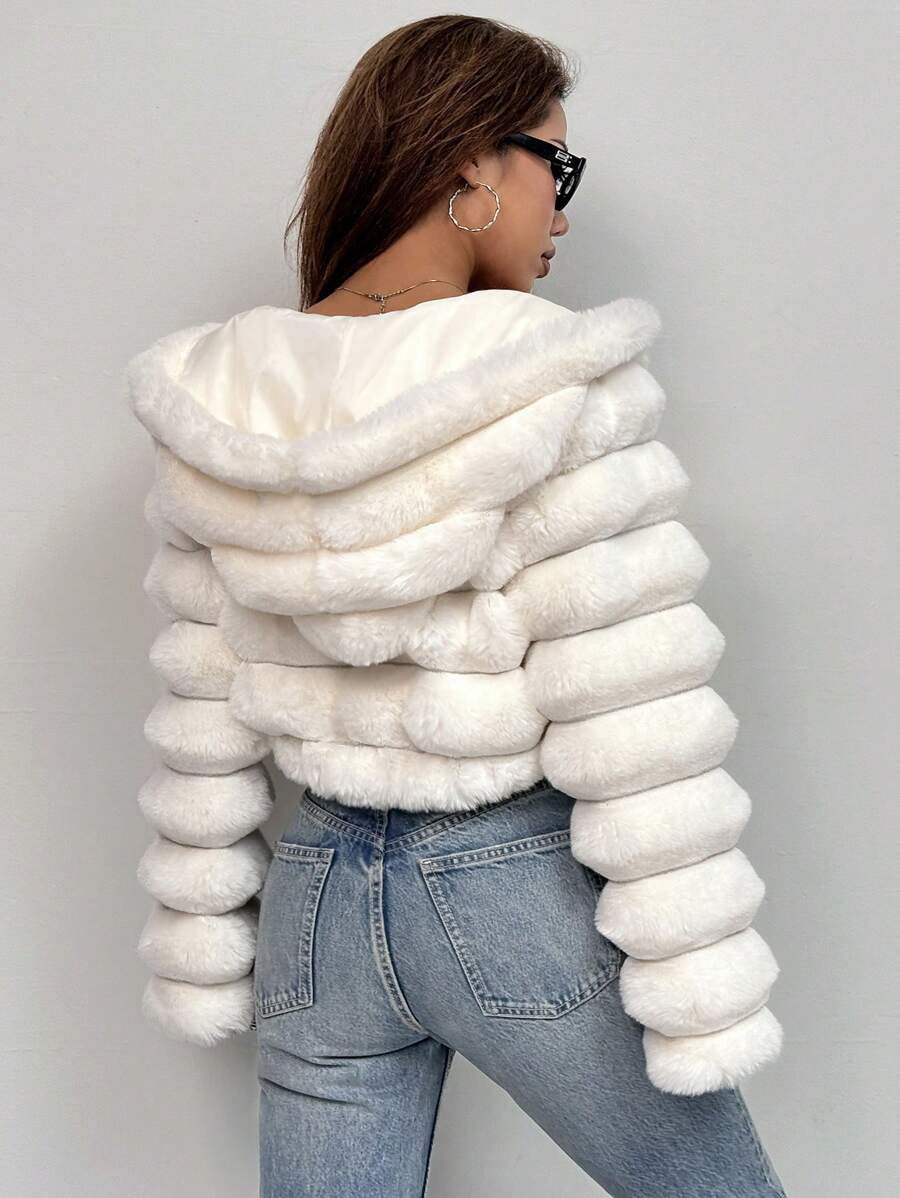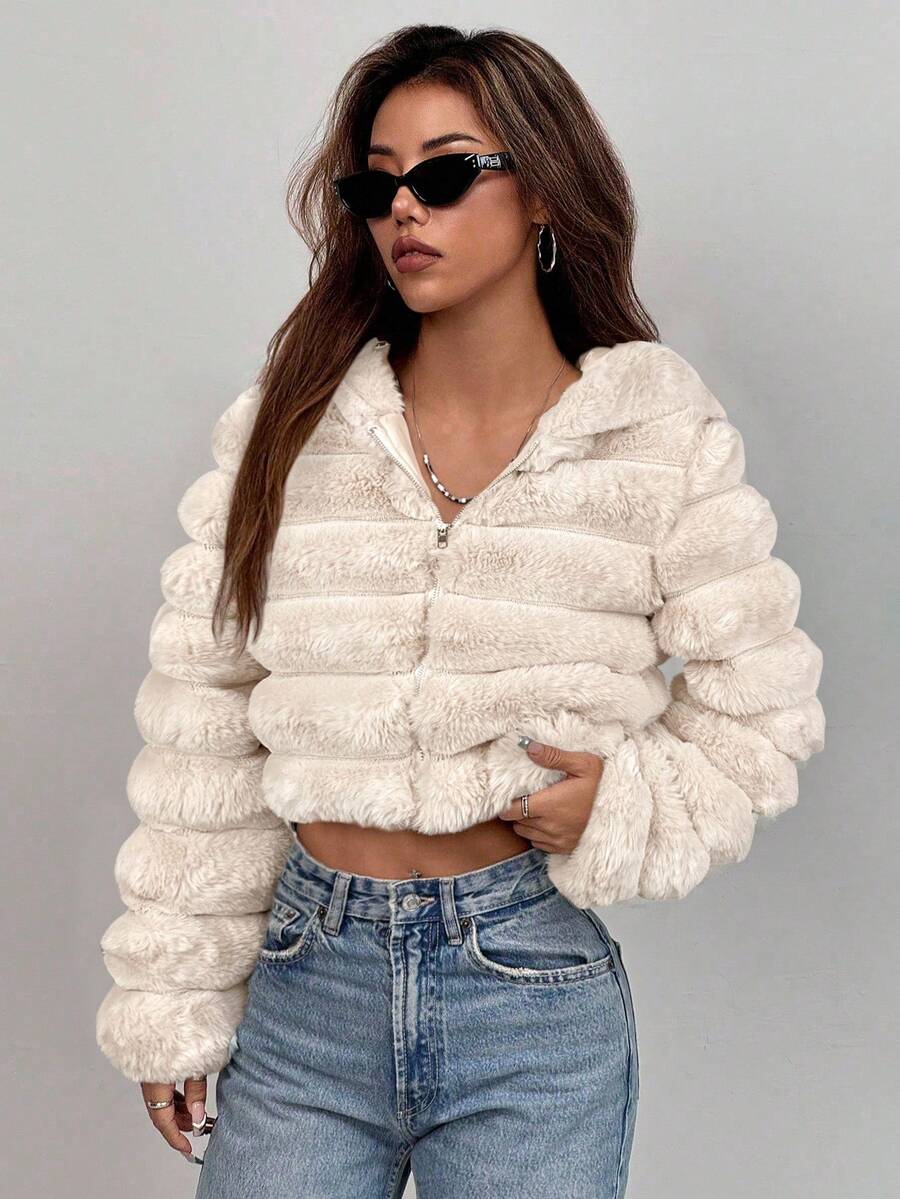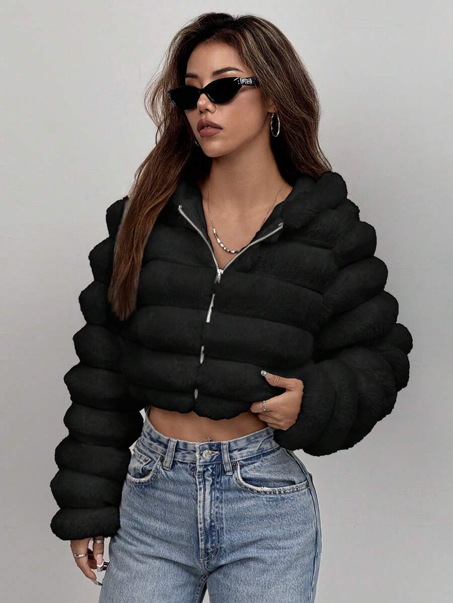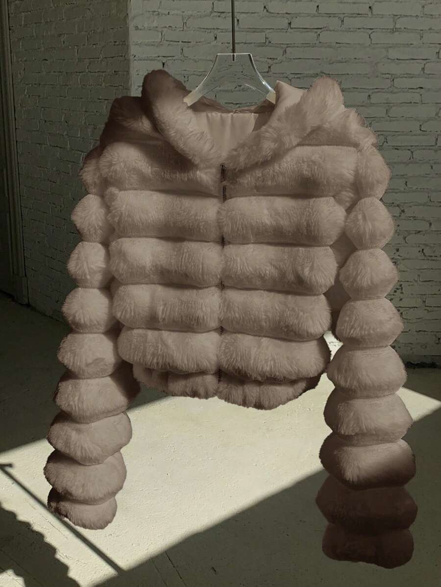 MIU MAJA EZwear ženska moderna kratka jakna s kapuljačom i pahuljastom (fluffy) teksturom, u jednobojnom dizajnu, idealna za jesen i zimu