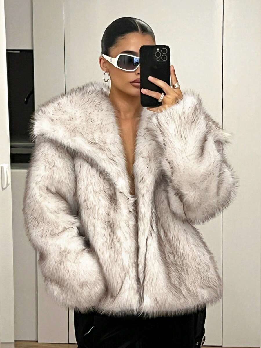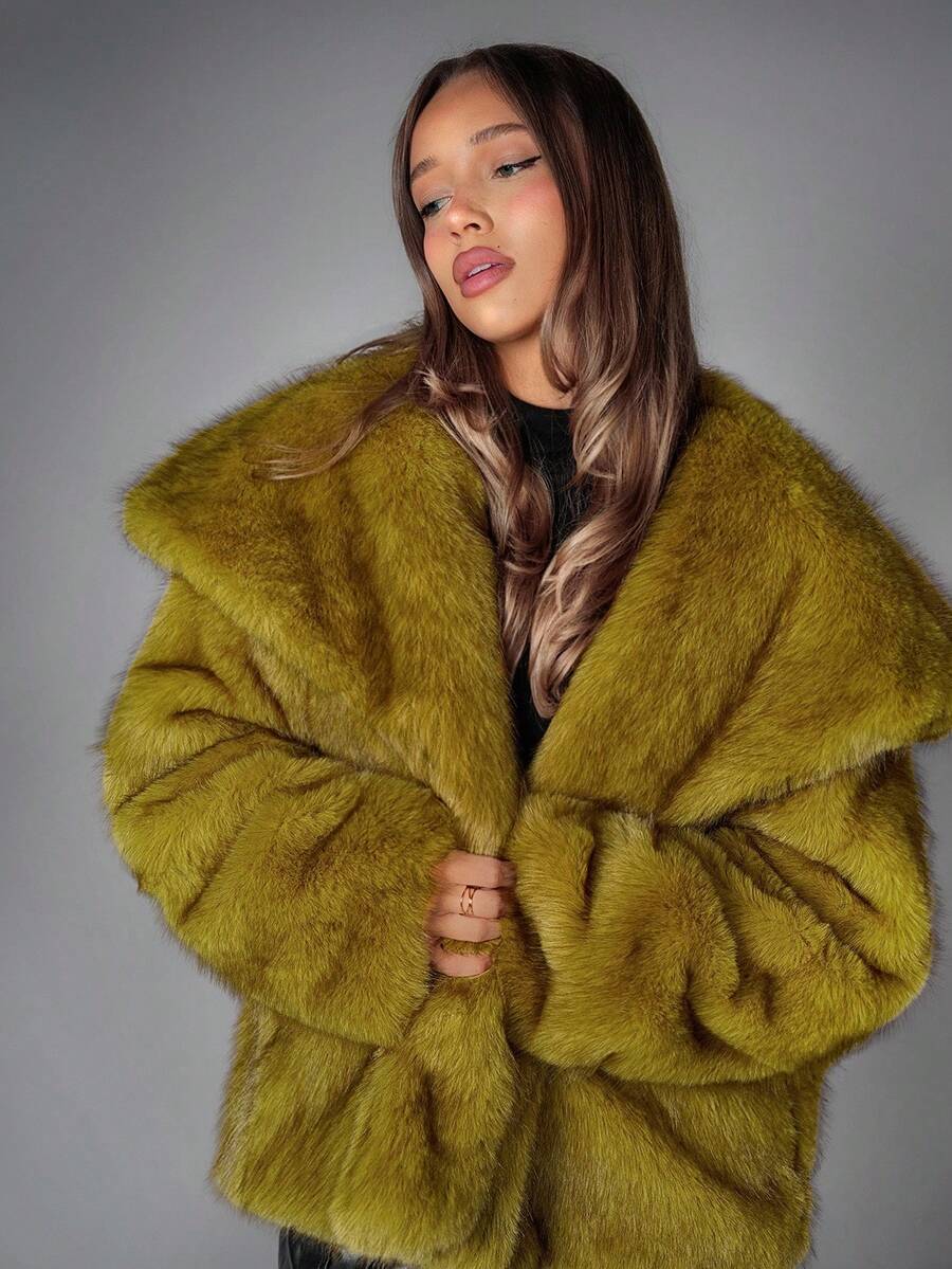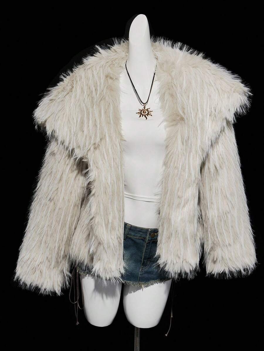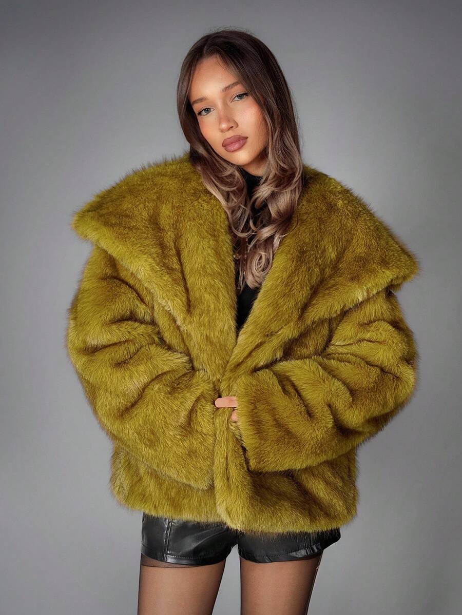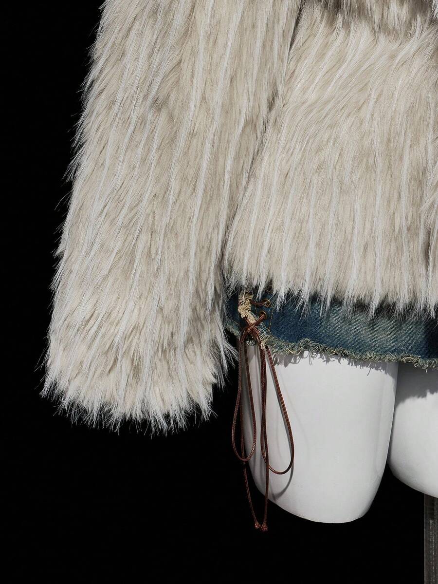 MIU MAJA ICON ženska zimska jakna od umjetnog krzna s rever kragnom i otvorenim prednjim dijelom, mekane i pahuljaste teksture, idealna za elegantan i udoban zimski izgled