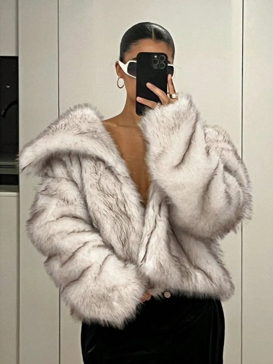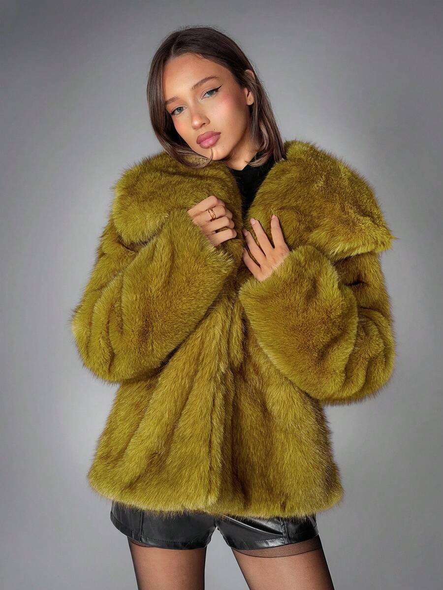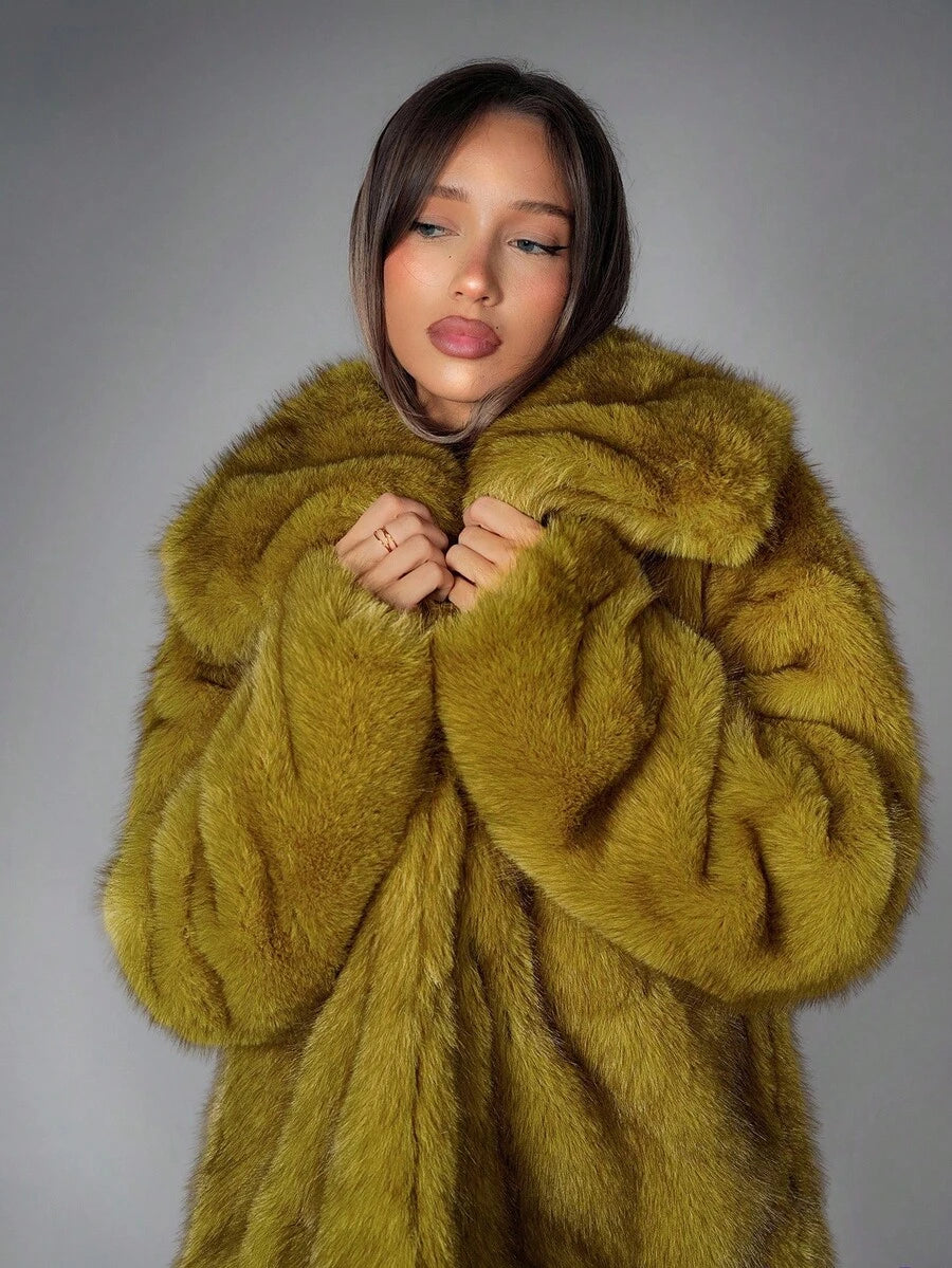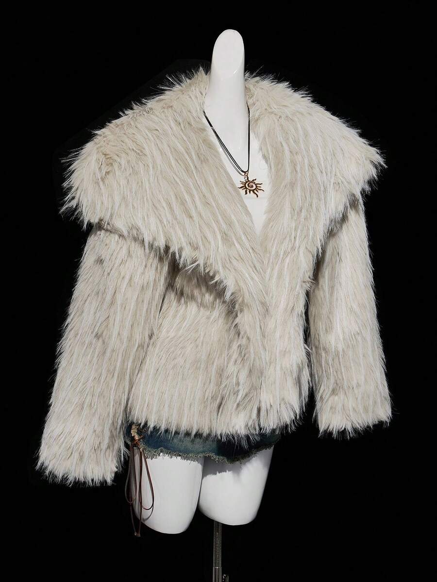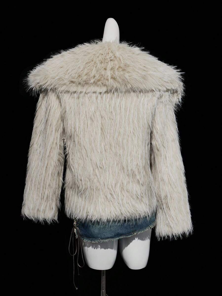MIU MAJA ICON ženska zimska jakna od umjetnog krzna s rever kragnom i otvorenim prednjim dijelom, mekane i pahuljaste teksture, idealna za elegantan i udoban zimski izgled