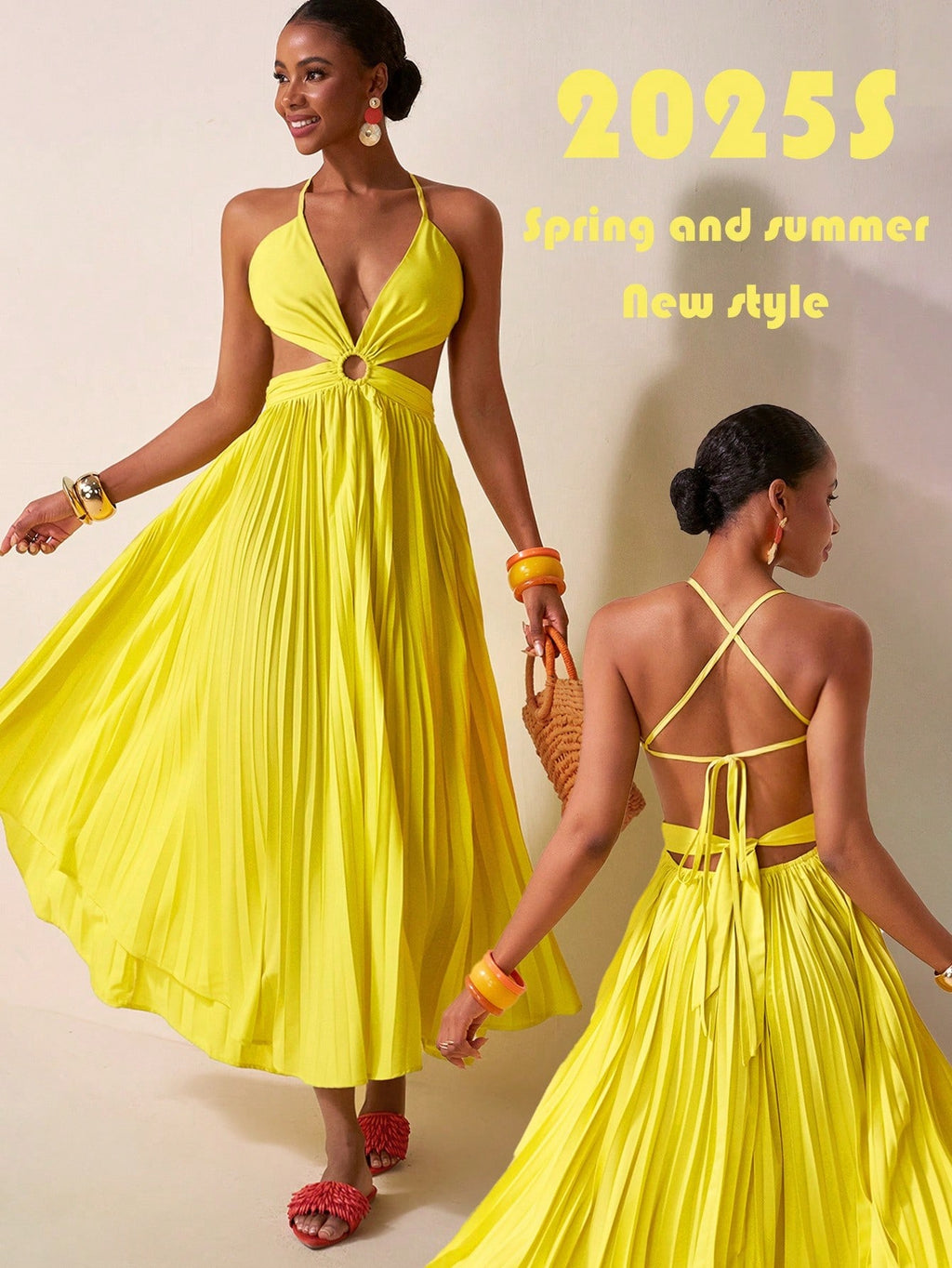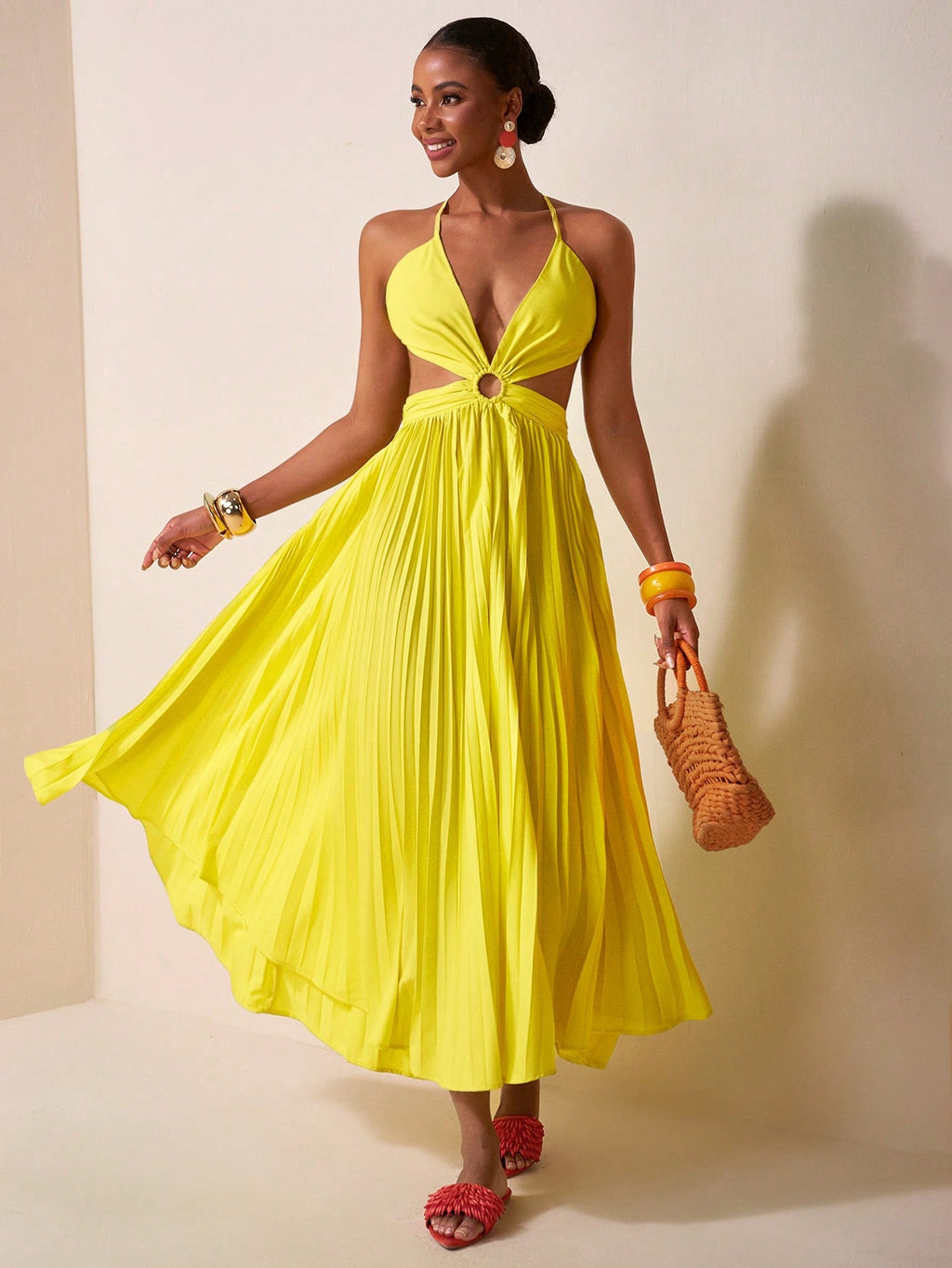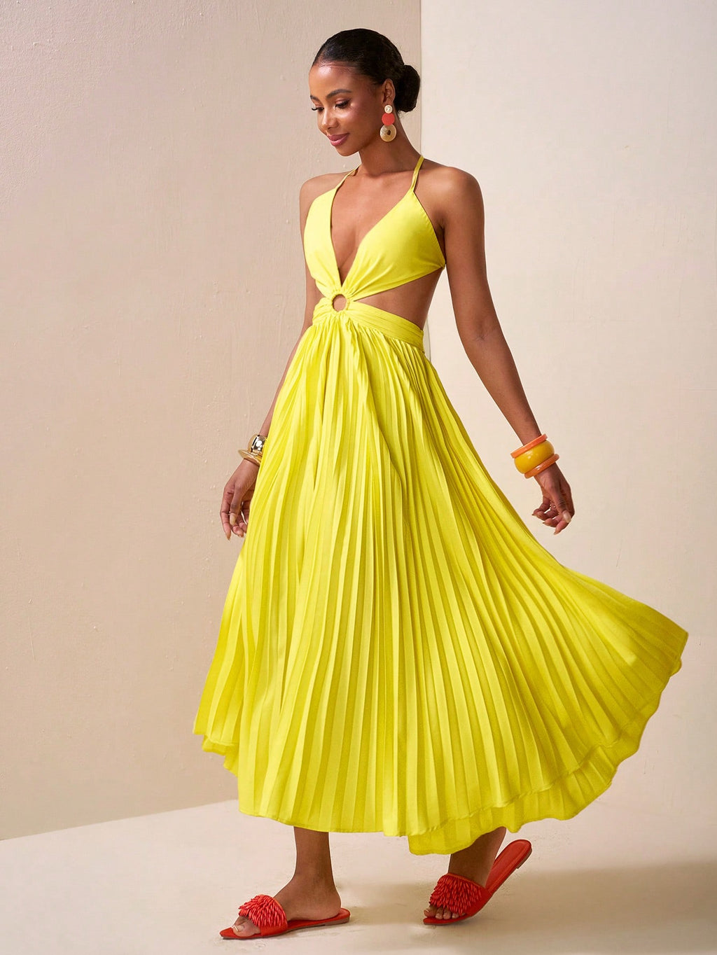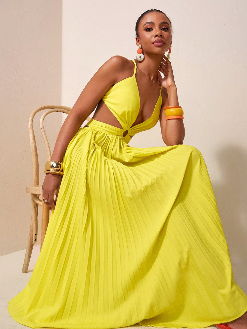 MIU New Arrival Summer Holiday Casual Spaghetti Strap Lace-Up Hollow Circular Ring Decor Pleated Asymmetrical Hem Long Dress, Yellow Color