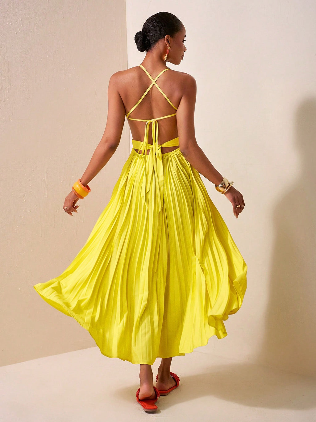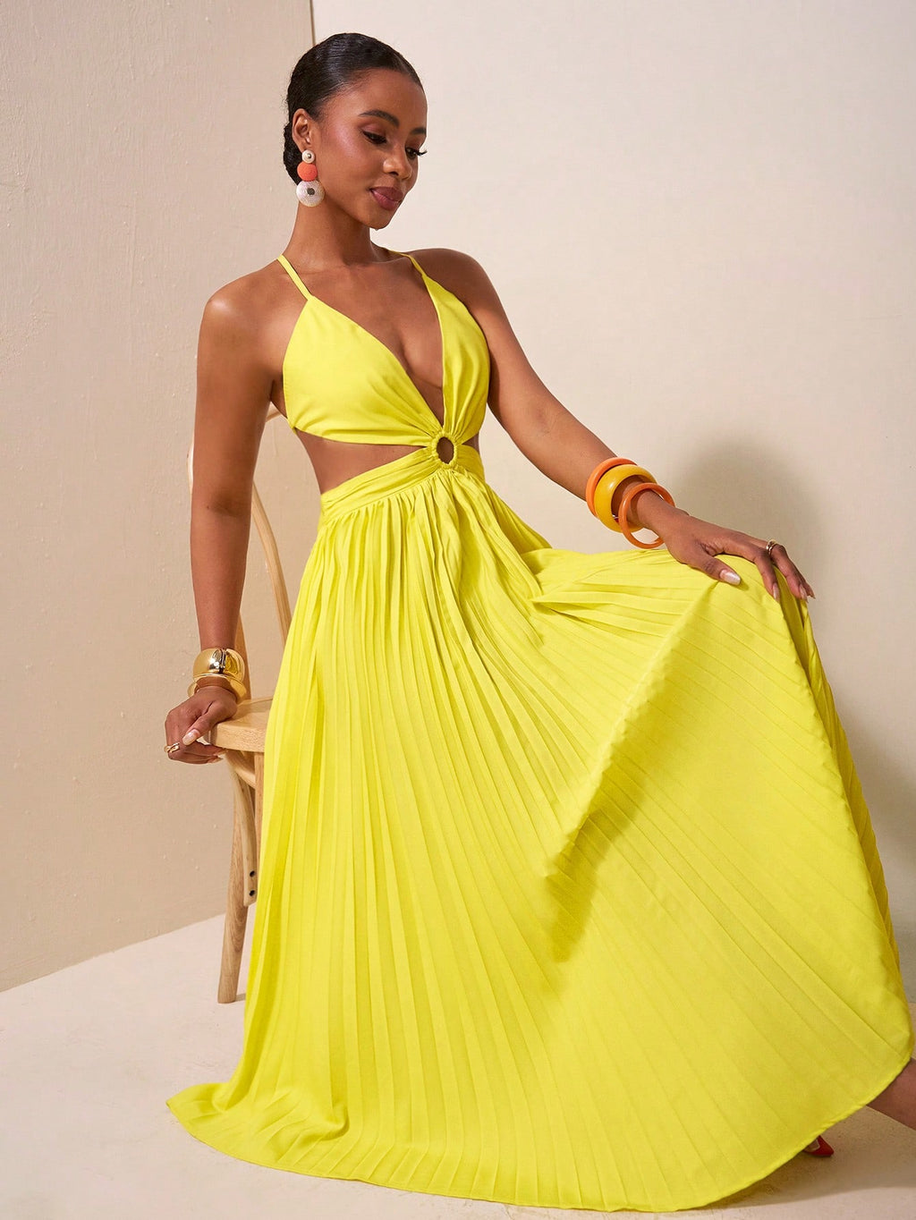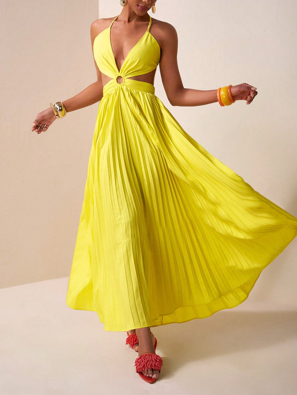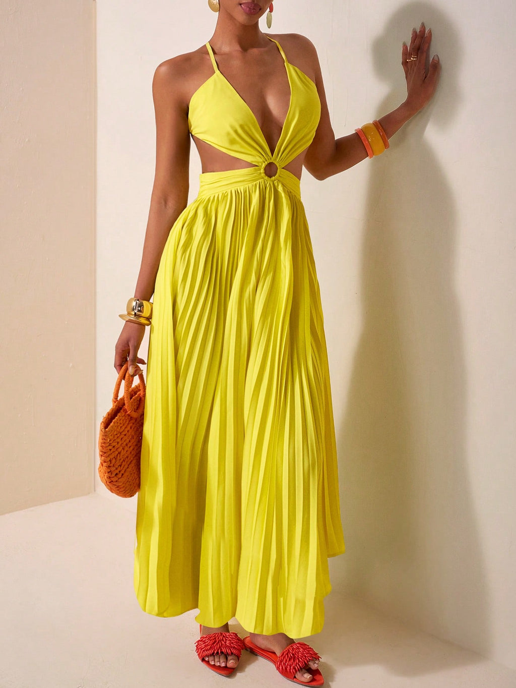 MIU New Arrival Summer Holiday Casual Spaghetti Strap Lace-Up Hollow Circular Ring Decor Pleated Asymmetrical Hem Long Dress, Yellow Color