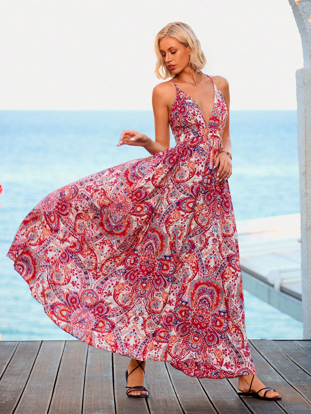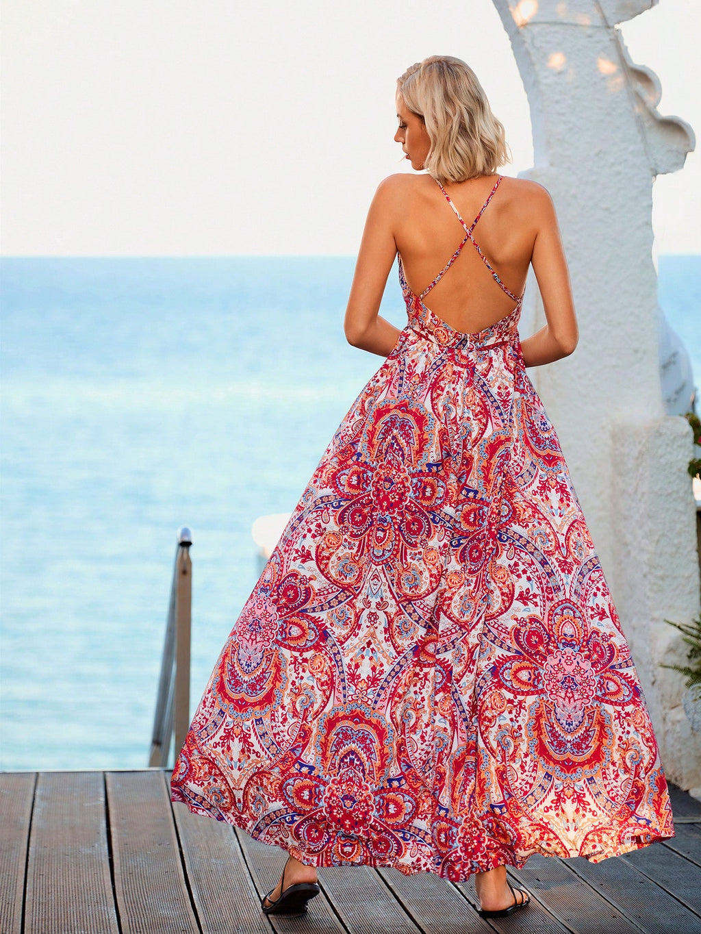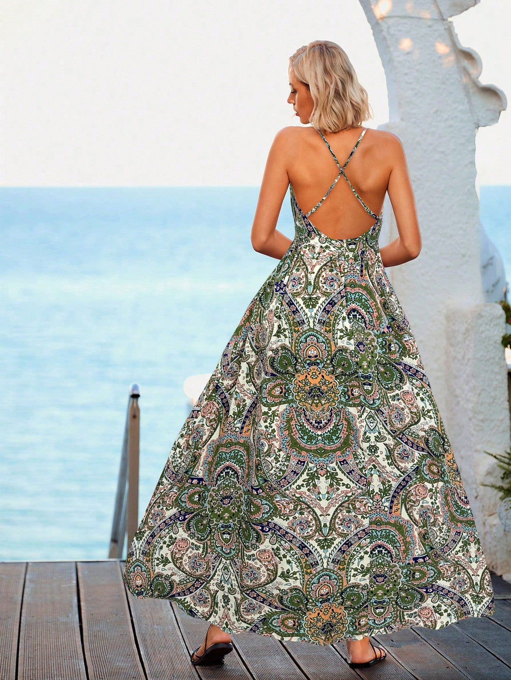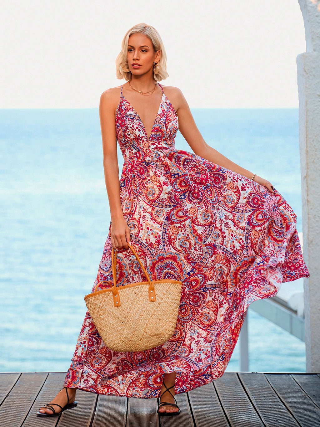 MIU Paisley Print Criss Cross Backless Cami Dress,Summer Clothing,Vacation Style,For Beach Vacation