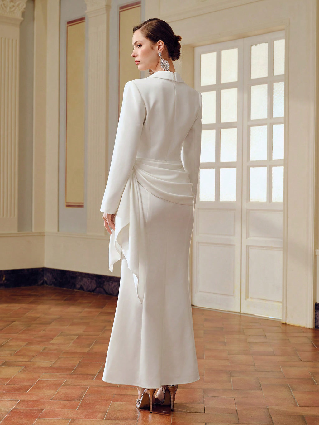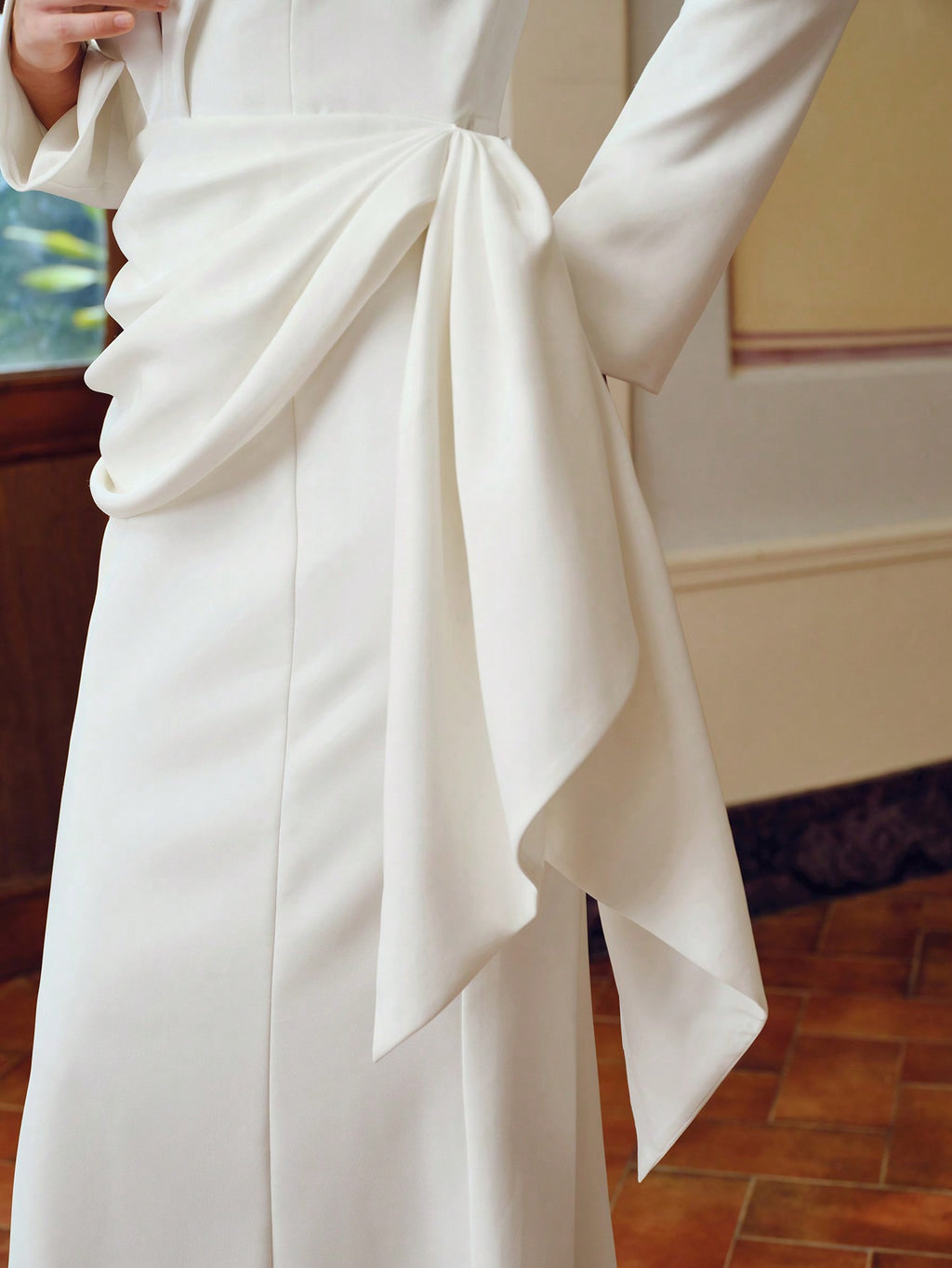 MIU PEAK COLLAR RUCHED DRAPED WAIST LONG DRESS