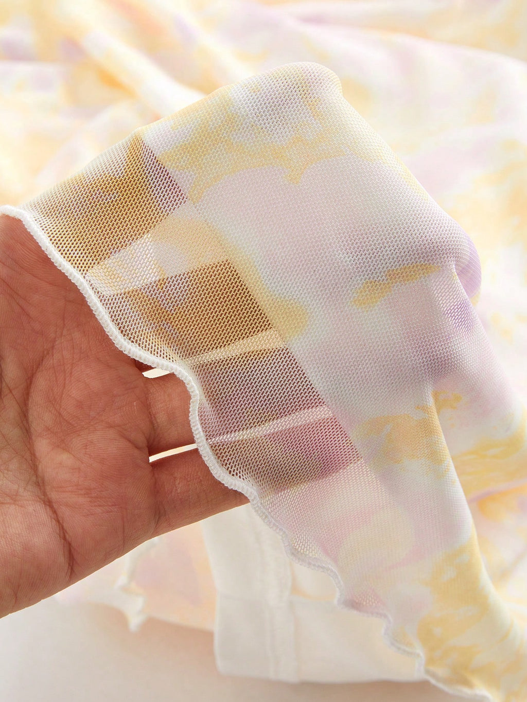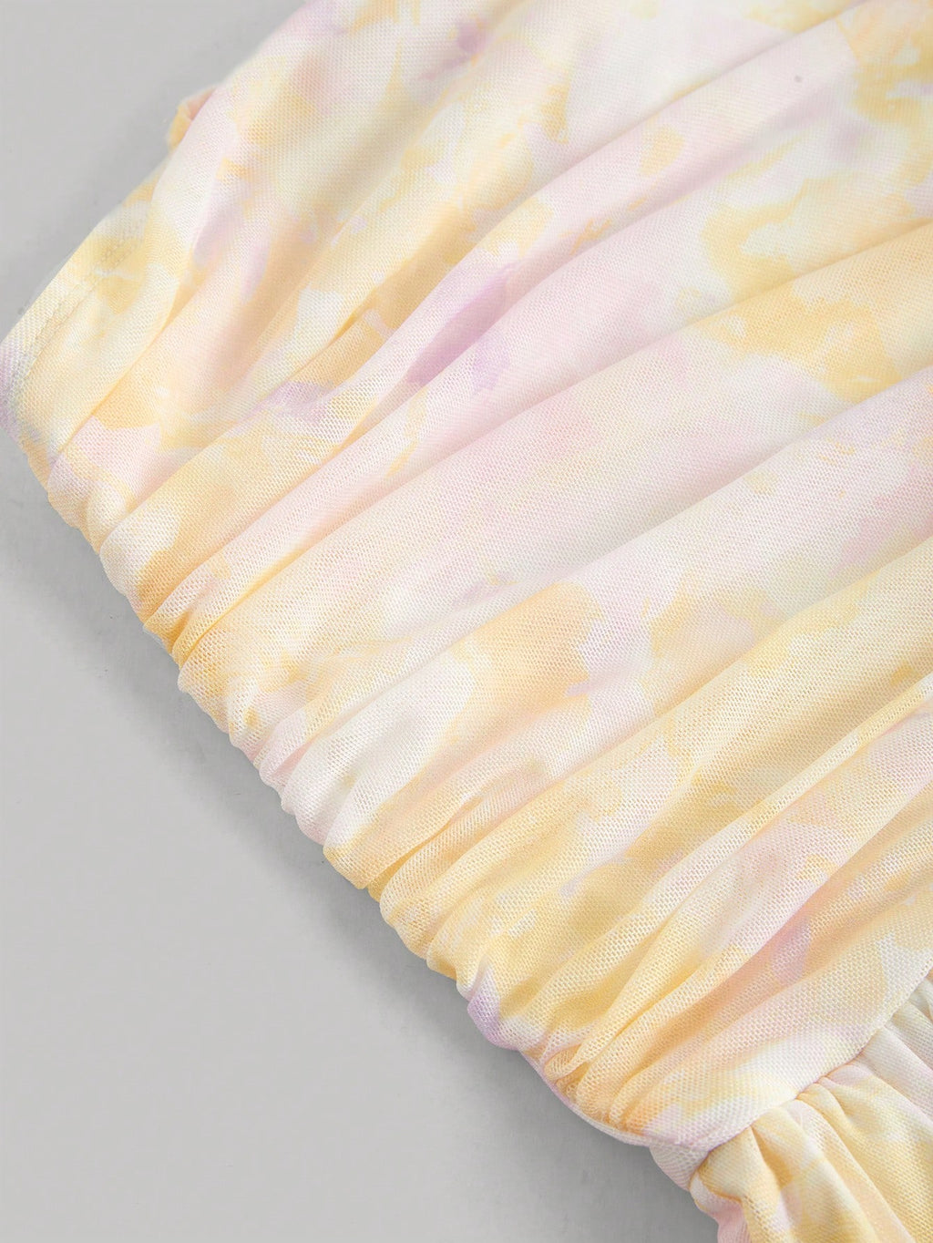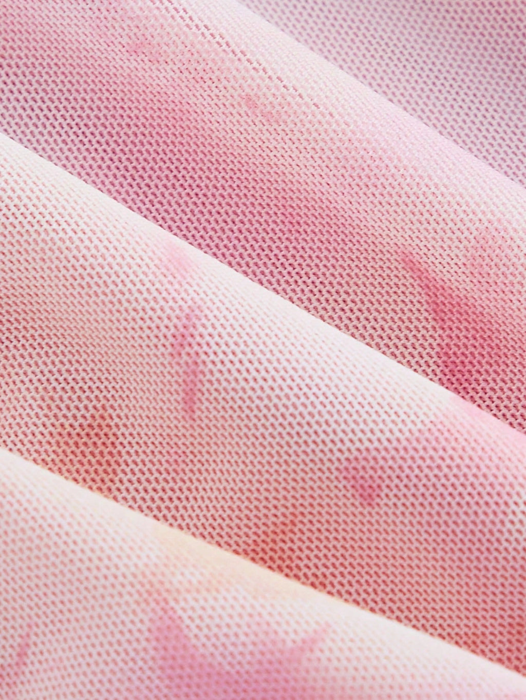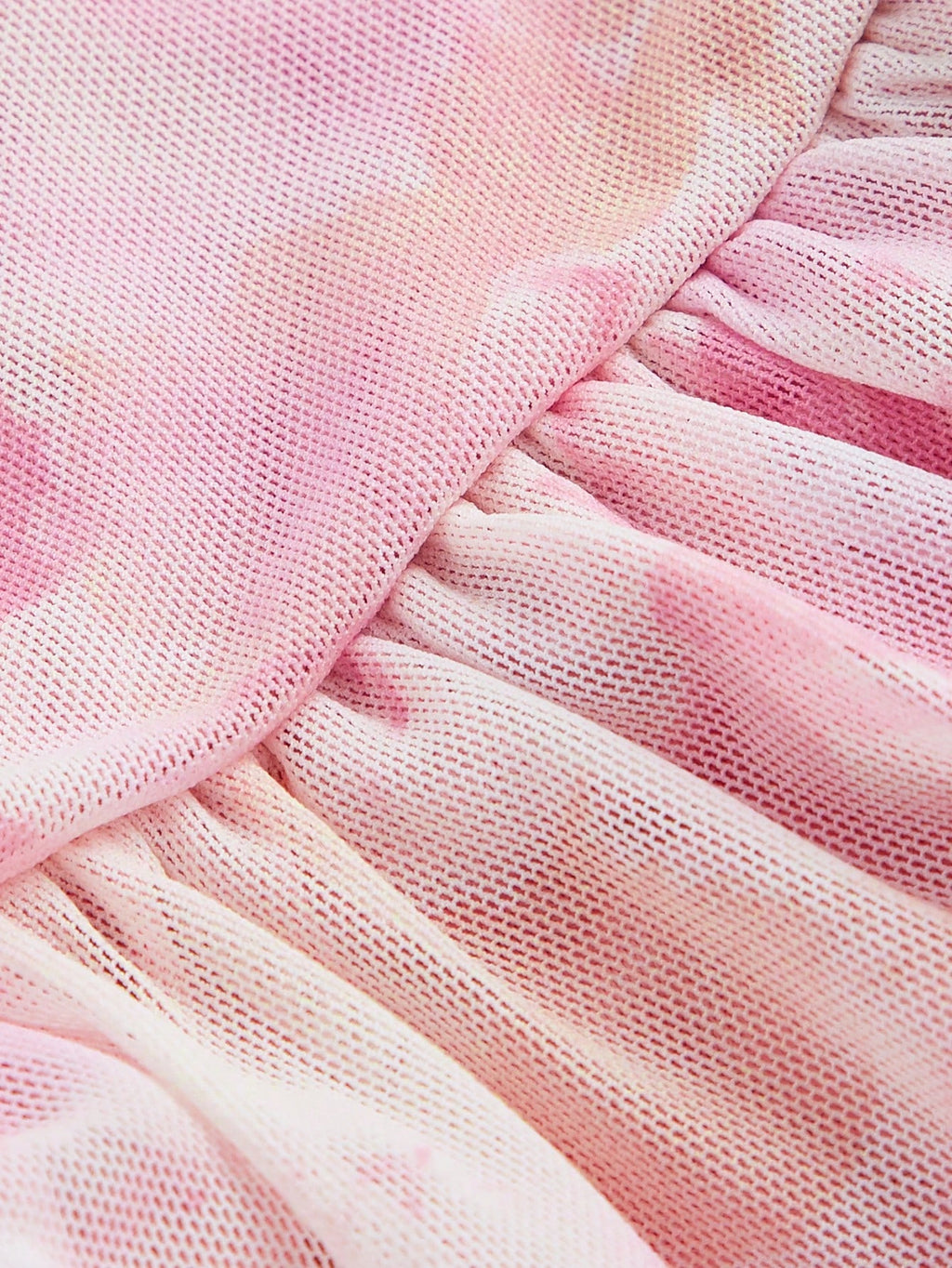 MIU Pink Elastic Mesh Tie Dye Printed Front Pleated Summer Women Dress,Summer Dresses For Women,Tea Party Dress,Pastel Dresses For Women