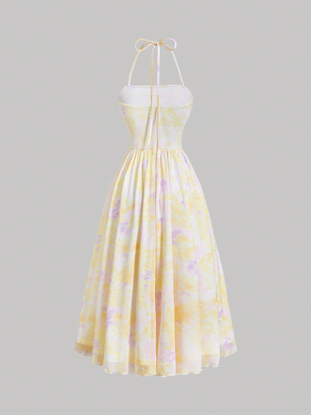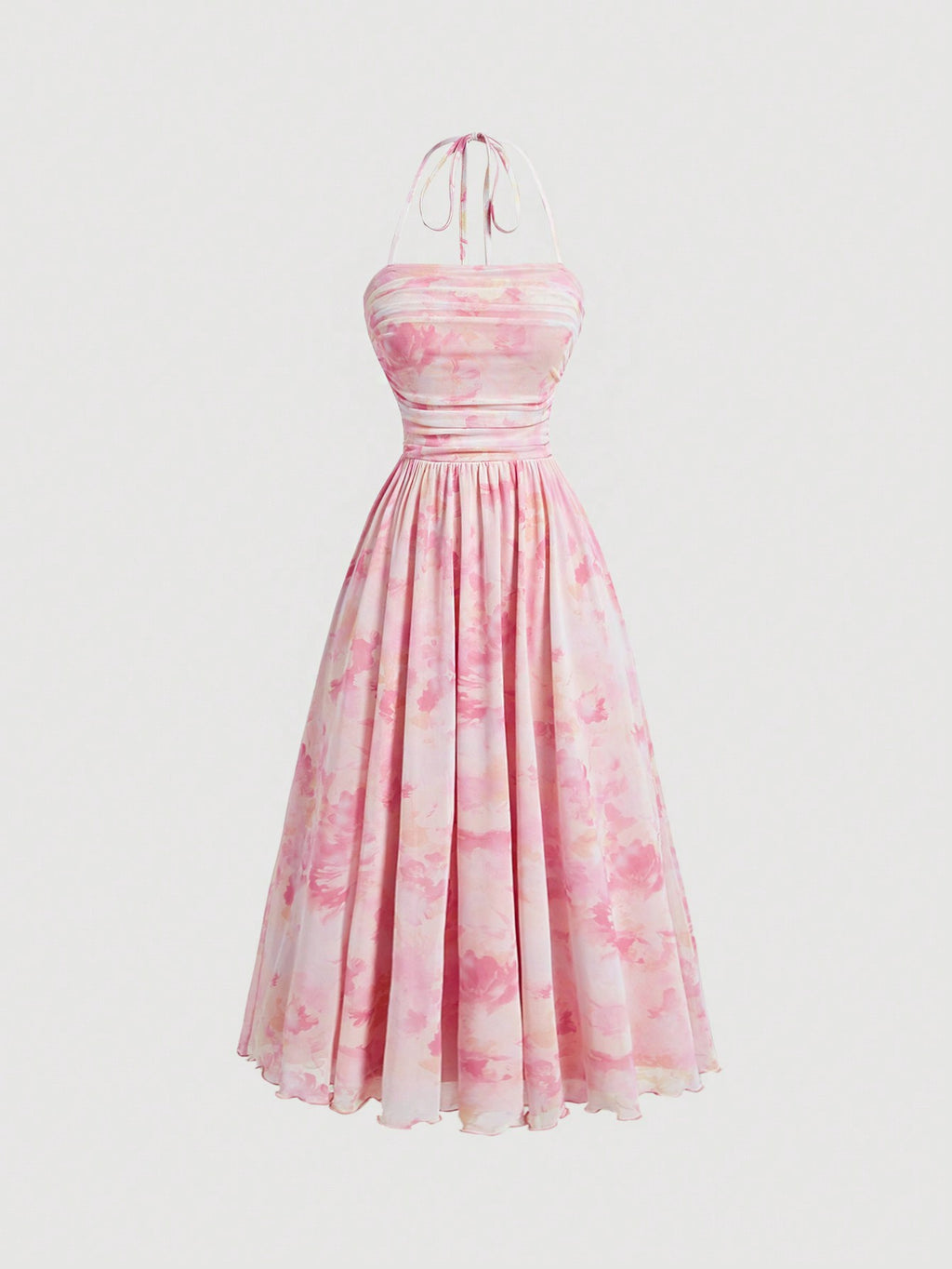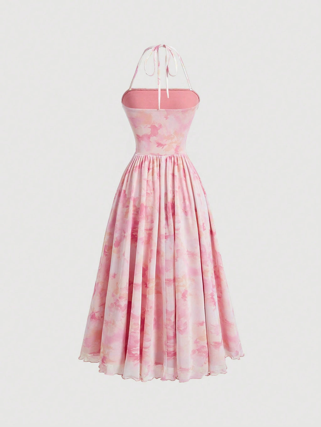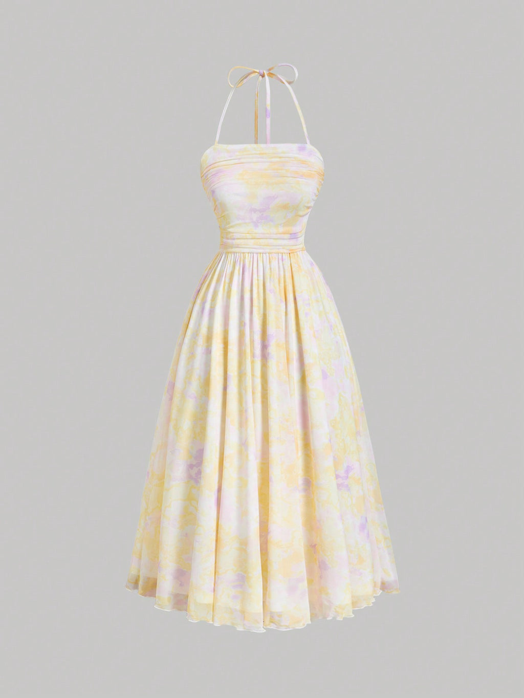 MIU Pink Elastic Mesh Tie Dye Printed Front Pleated Summer Women Dress,Summer Dresses For Women,Tea Party Dress,Pastel Dresses For Women