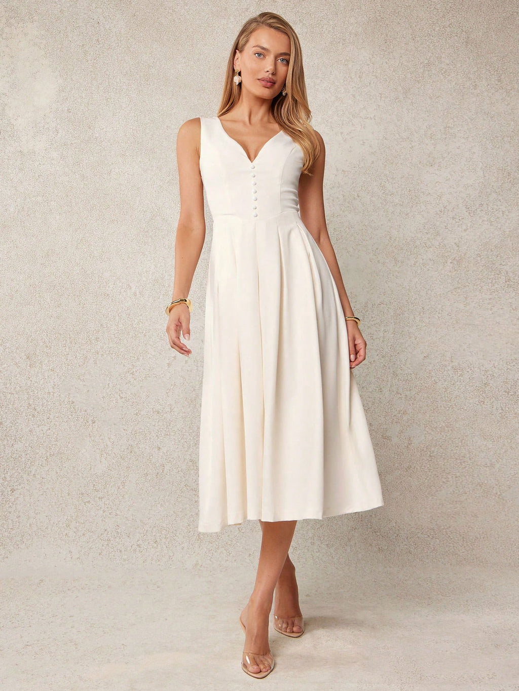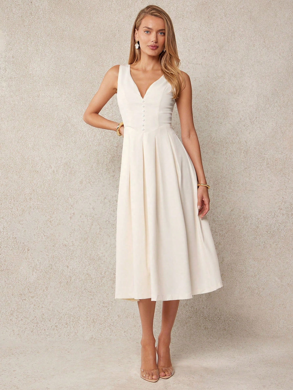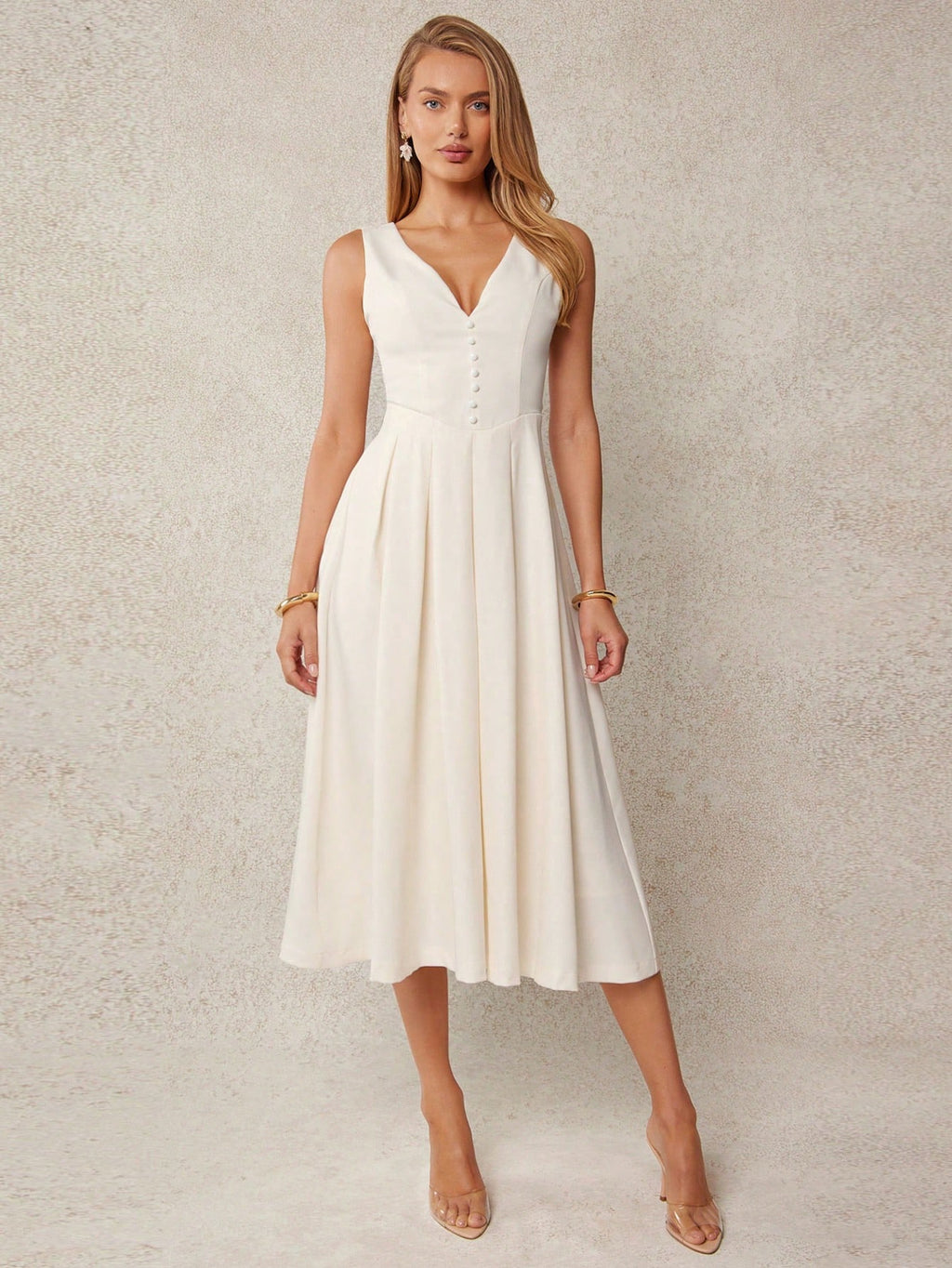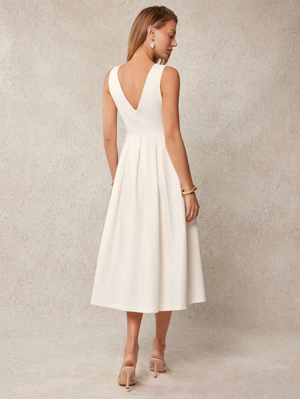 MIU Plain V-Neck Pleated Sleeveless Elegant Commuter Dress, Summer