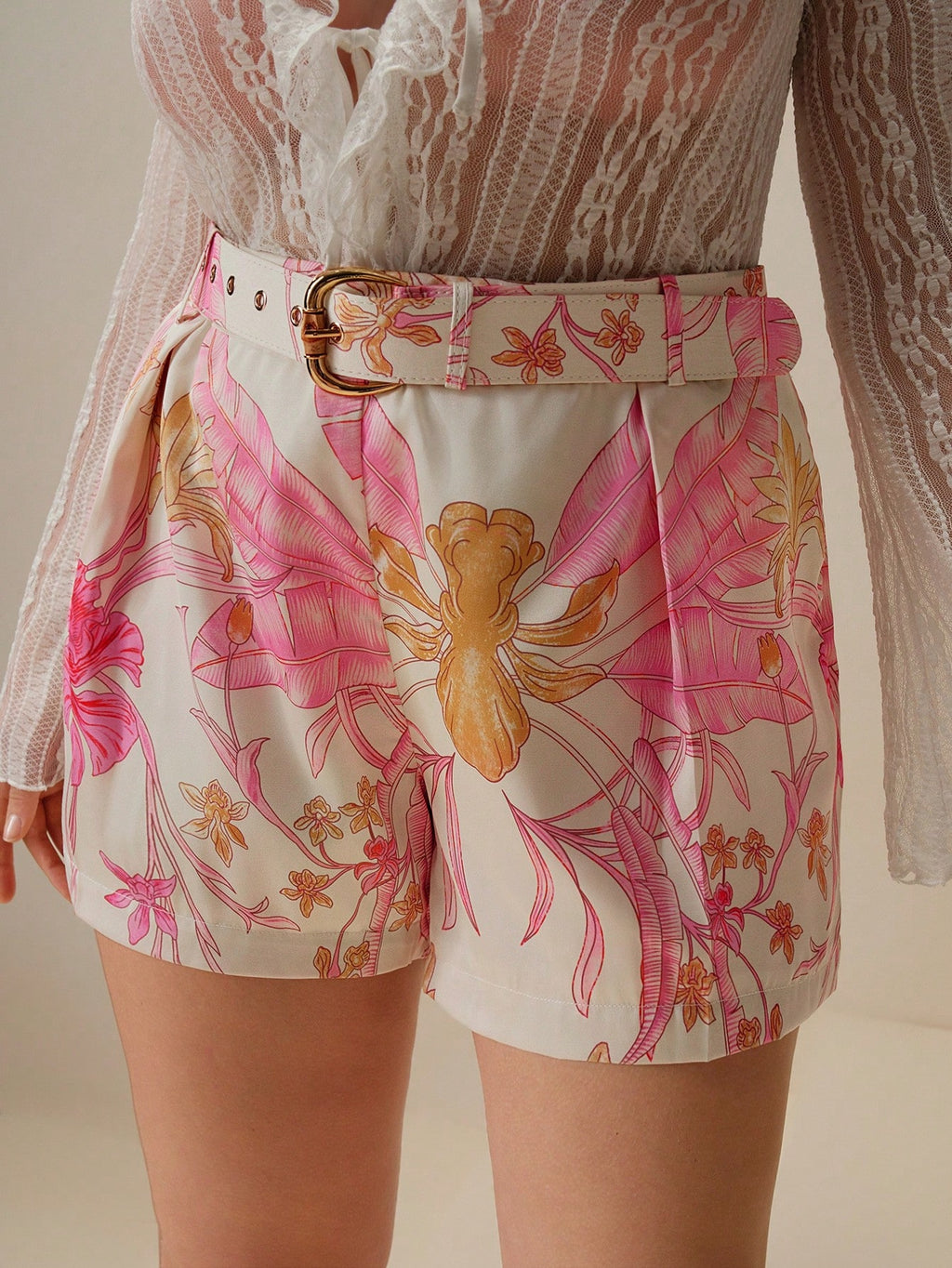 MIU Plus Size Women High Waist Pink Floral Print Casual Shorts With Belt, Elegant, Summer