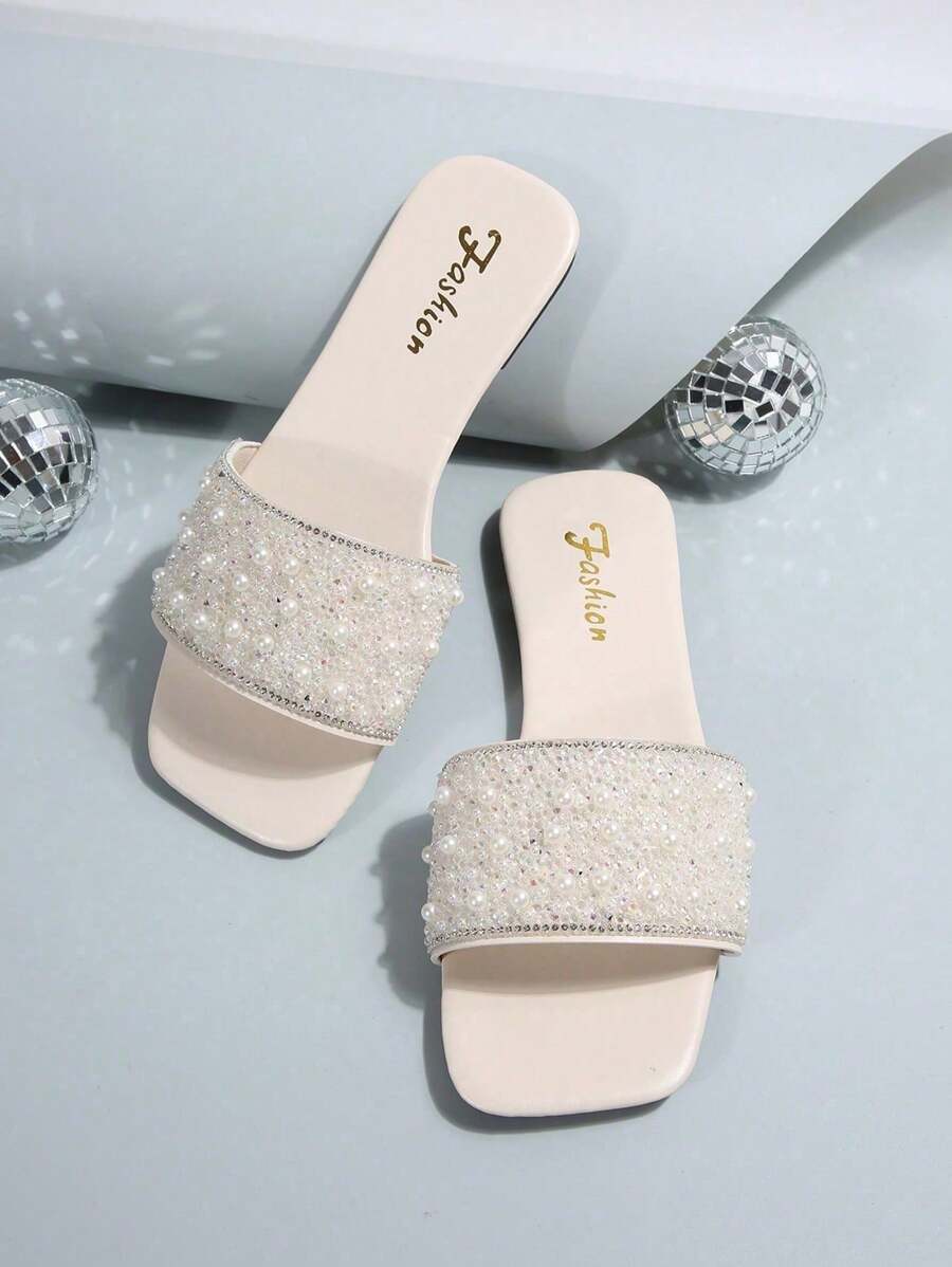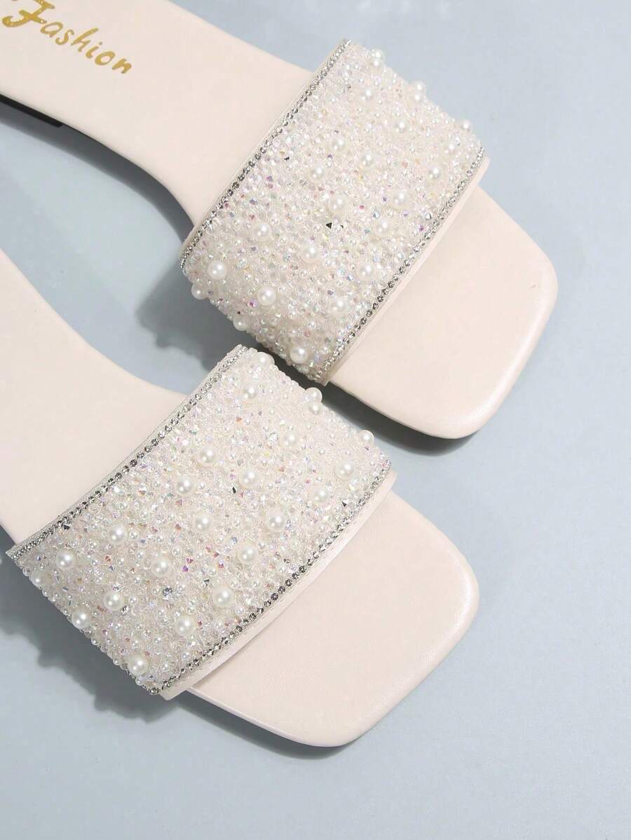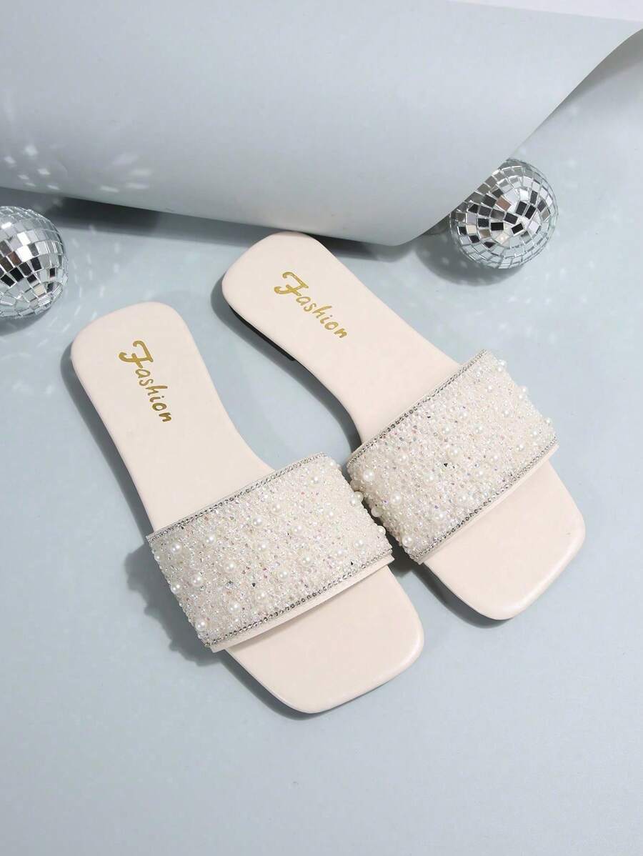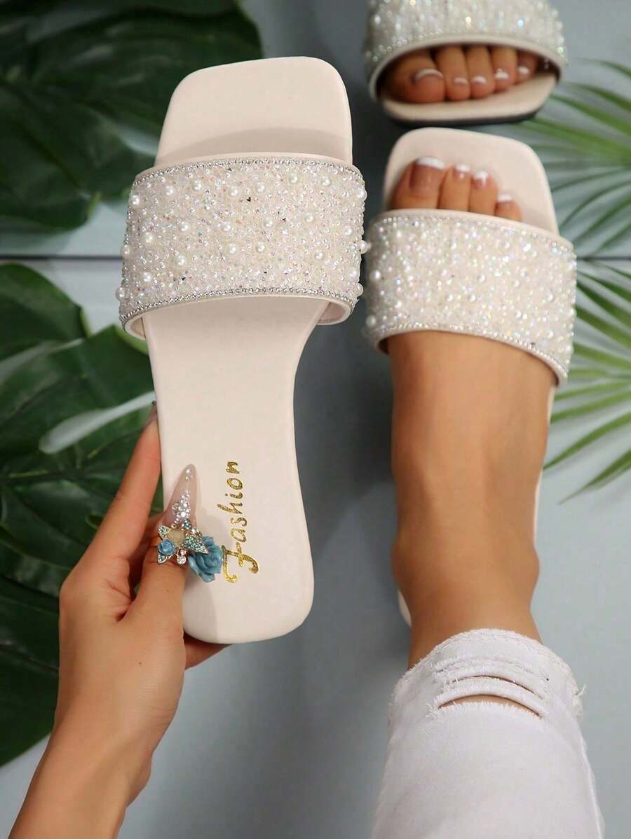 MIU Plus Size Women's Rhinestone Slip-On Sandals, Casual Outdoor Plastic Flat Sandals For Women