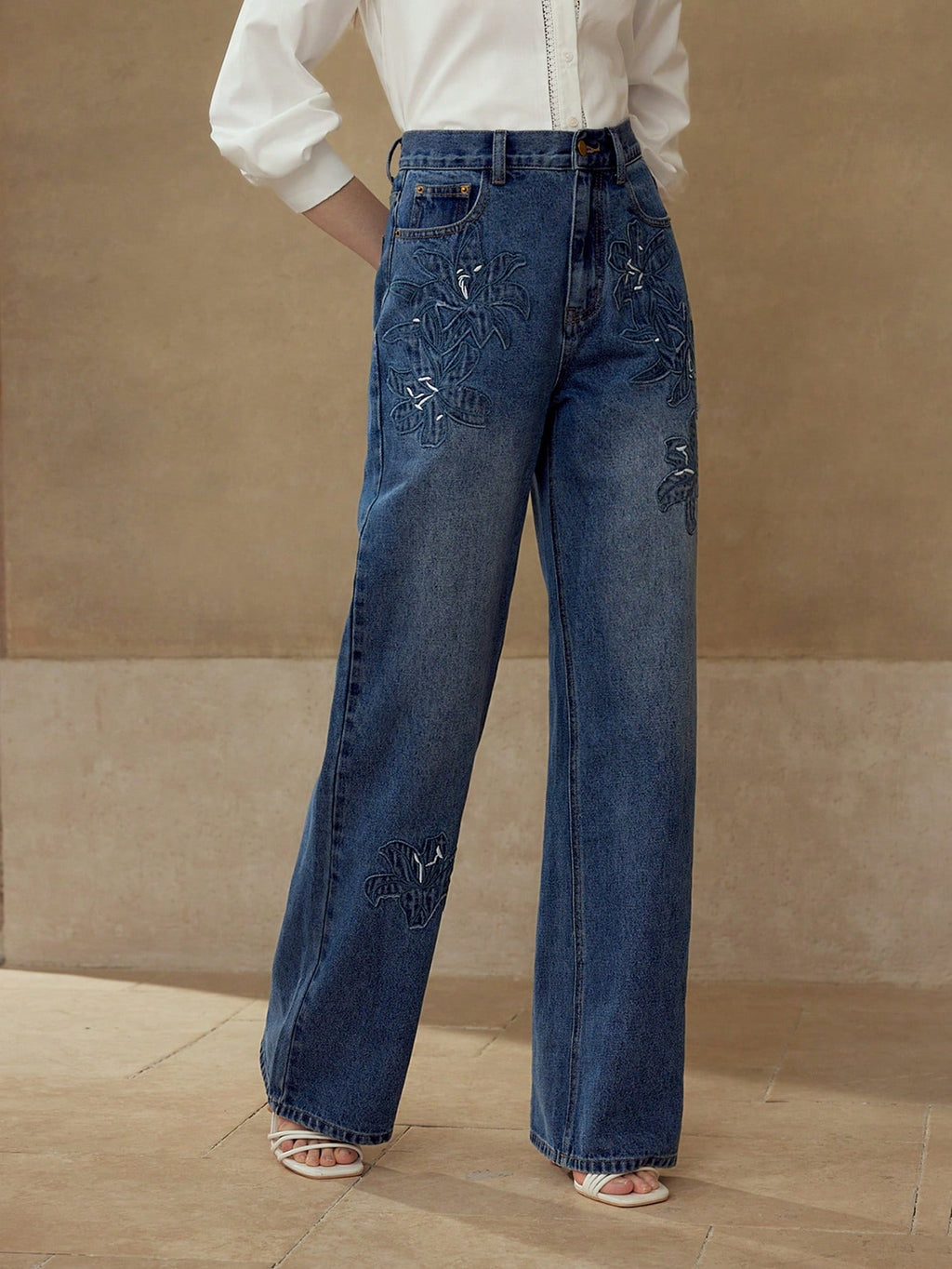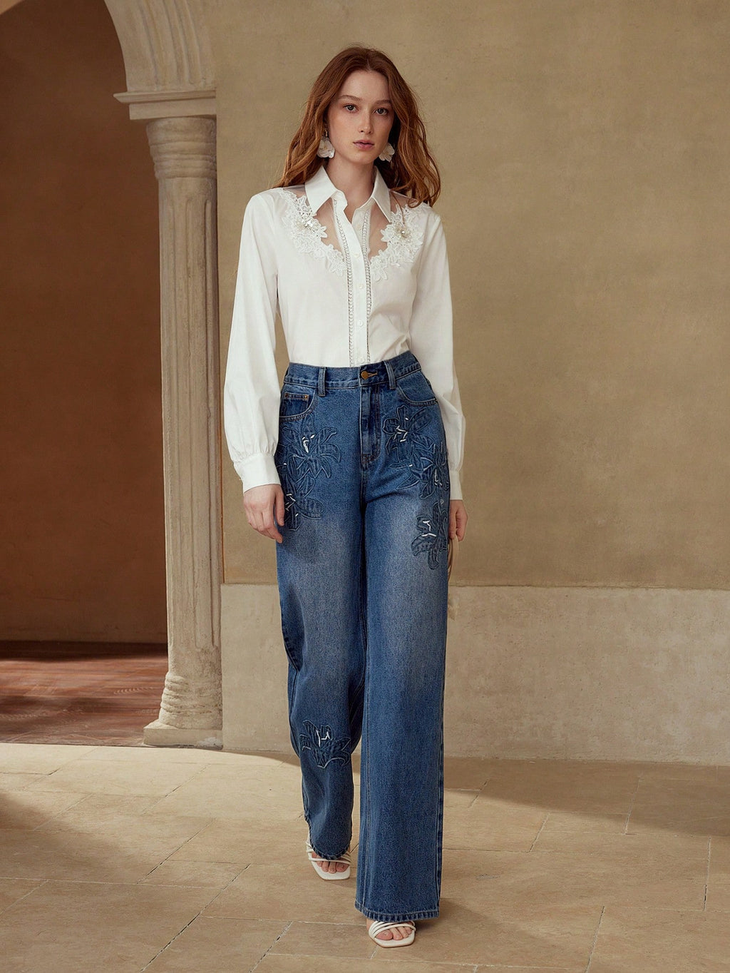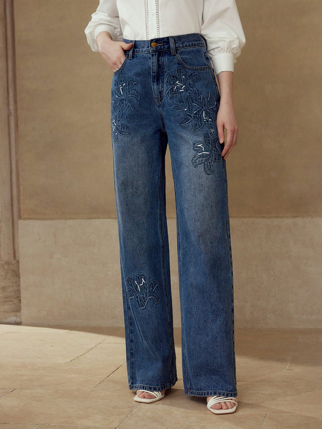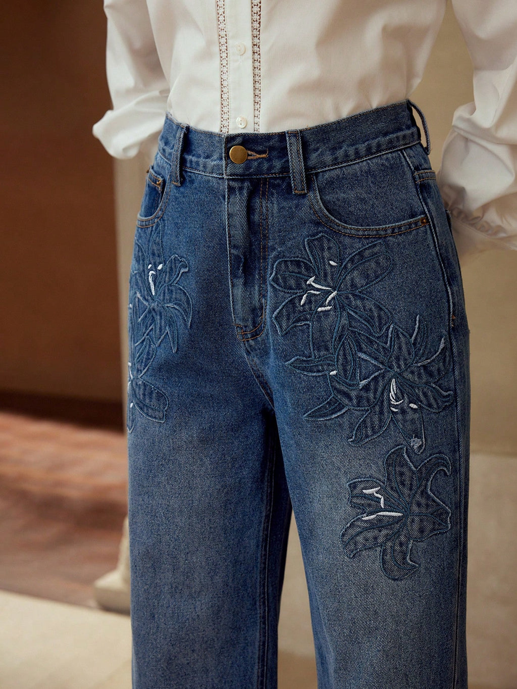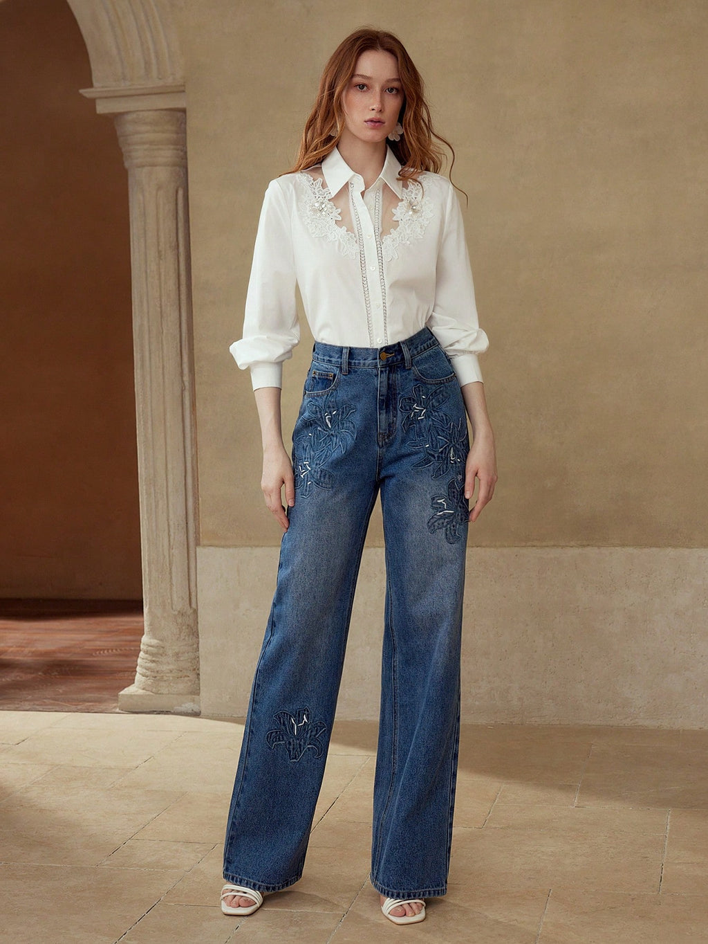 MIU PREMIUM FLORAL EMBROIDERY STRAIGHT LEG JEANS