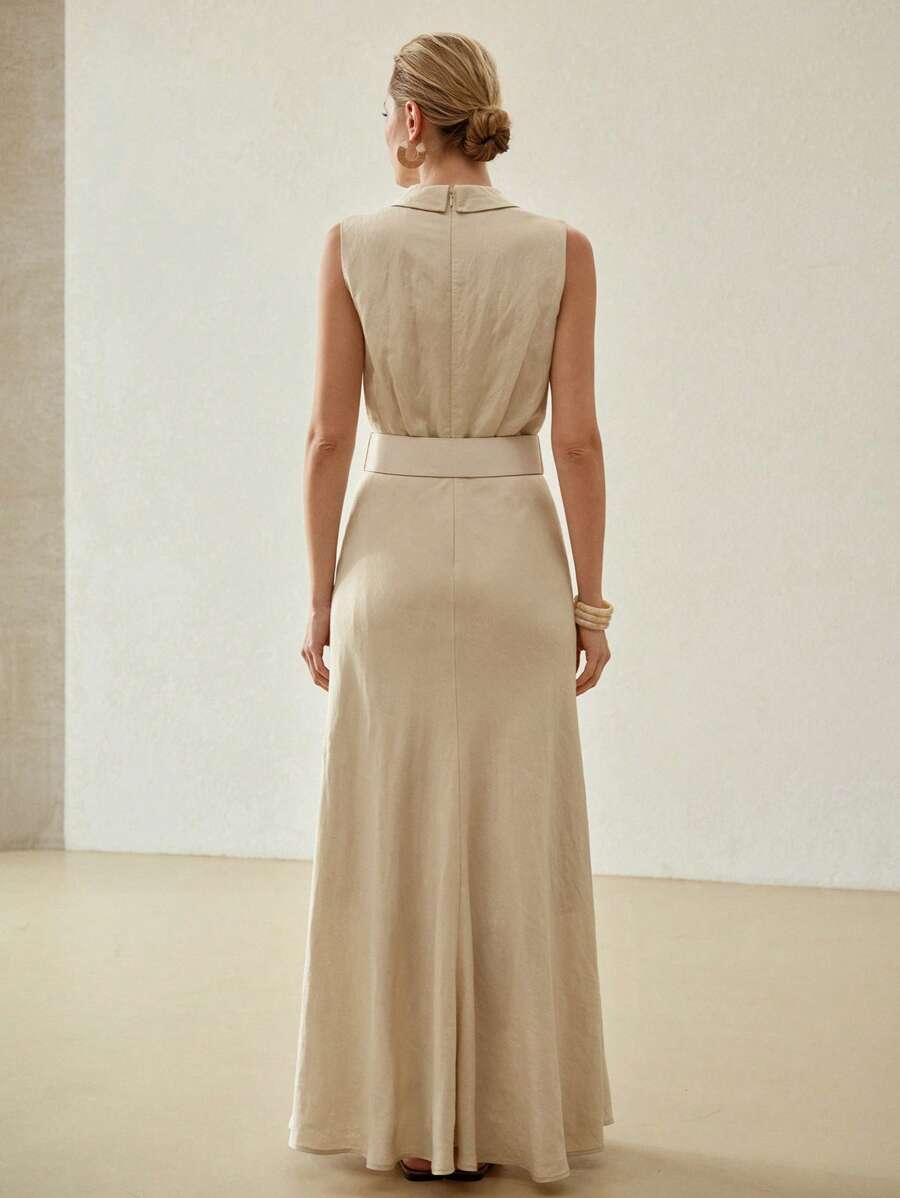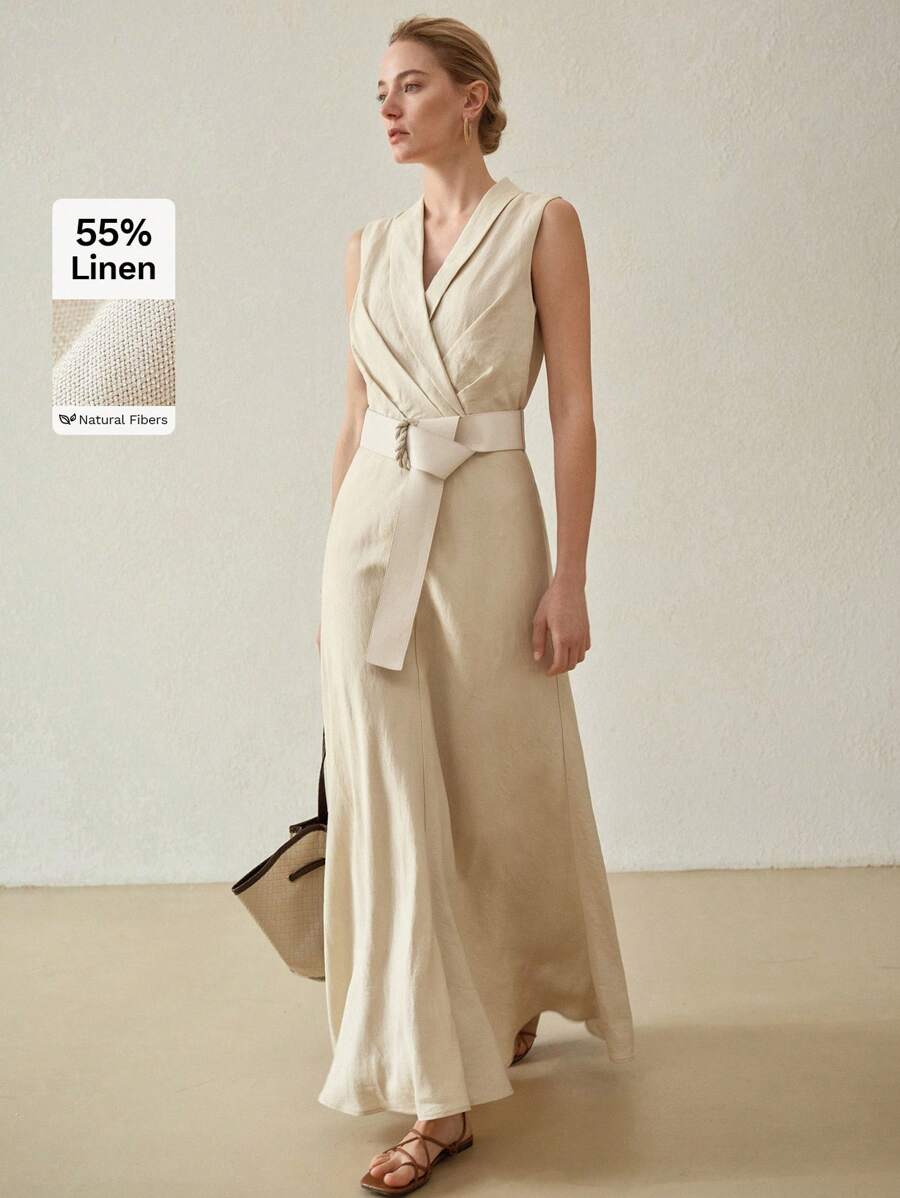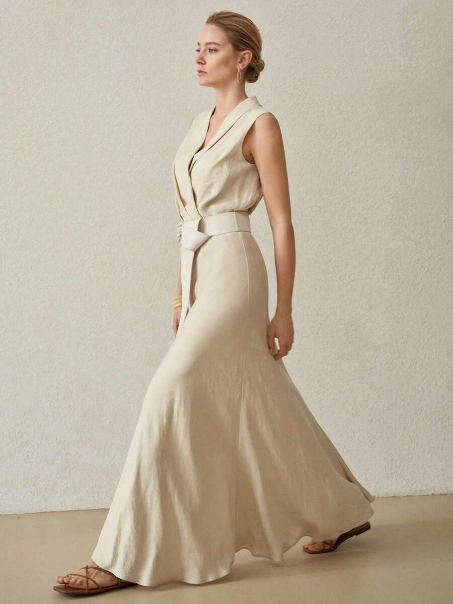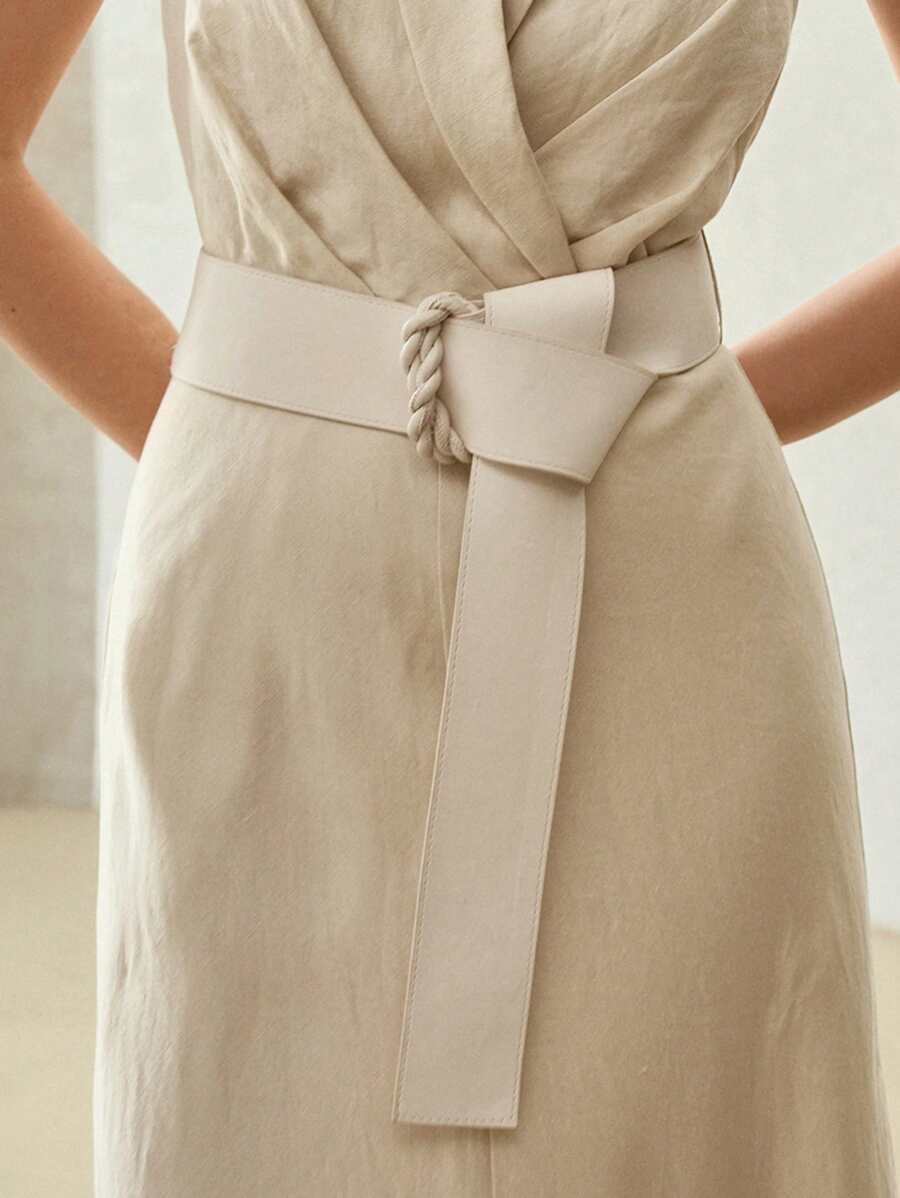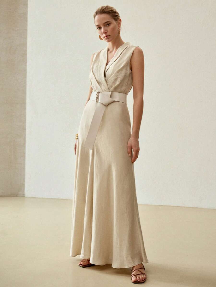 MIU PREMIUM LINEN BELTED BIAS CUT DRESS