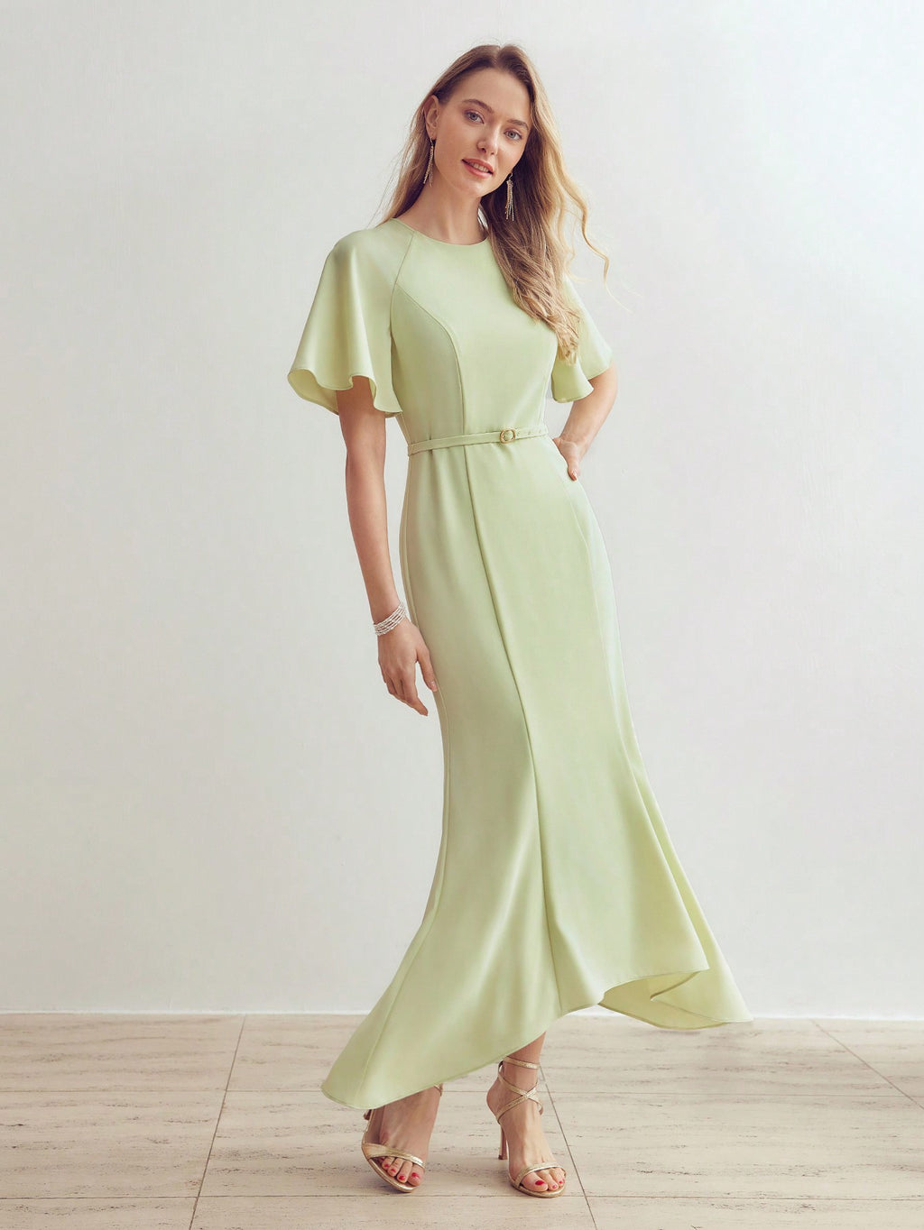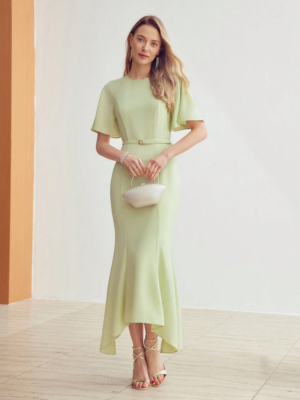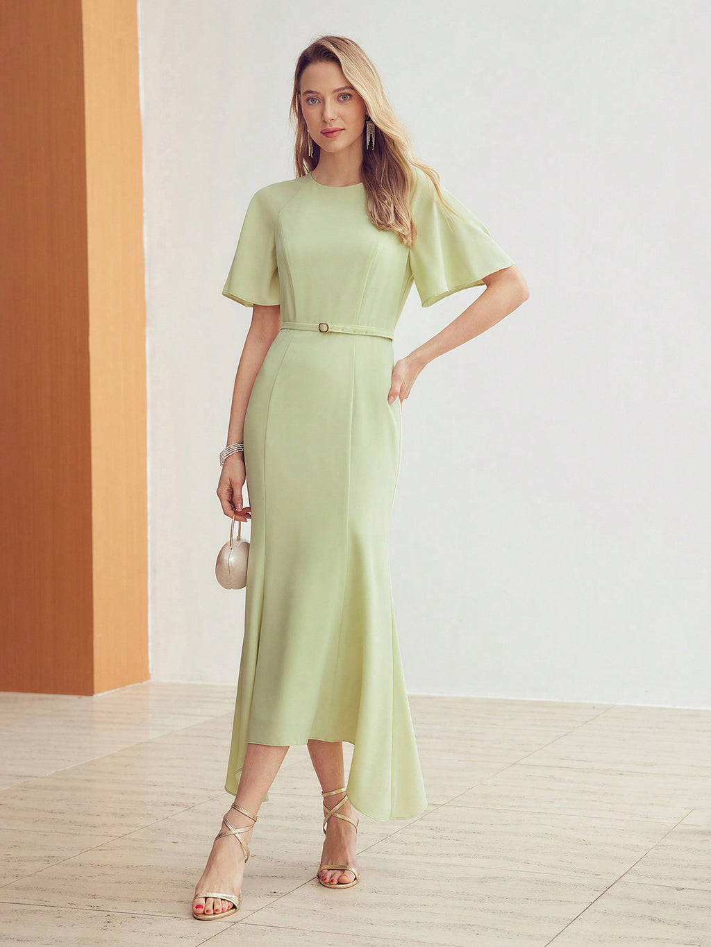 MIU PREMIUM SOLID RAGLAN SLEEVE MERMAID HEM BELTED DRESS,SUMMER OUTFITS