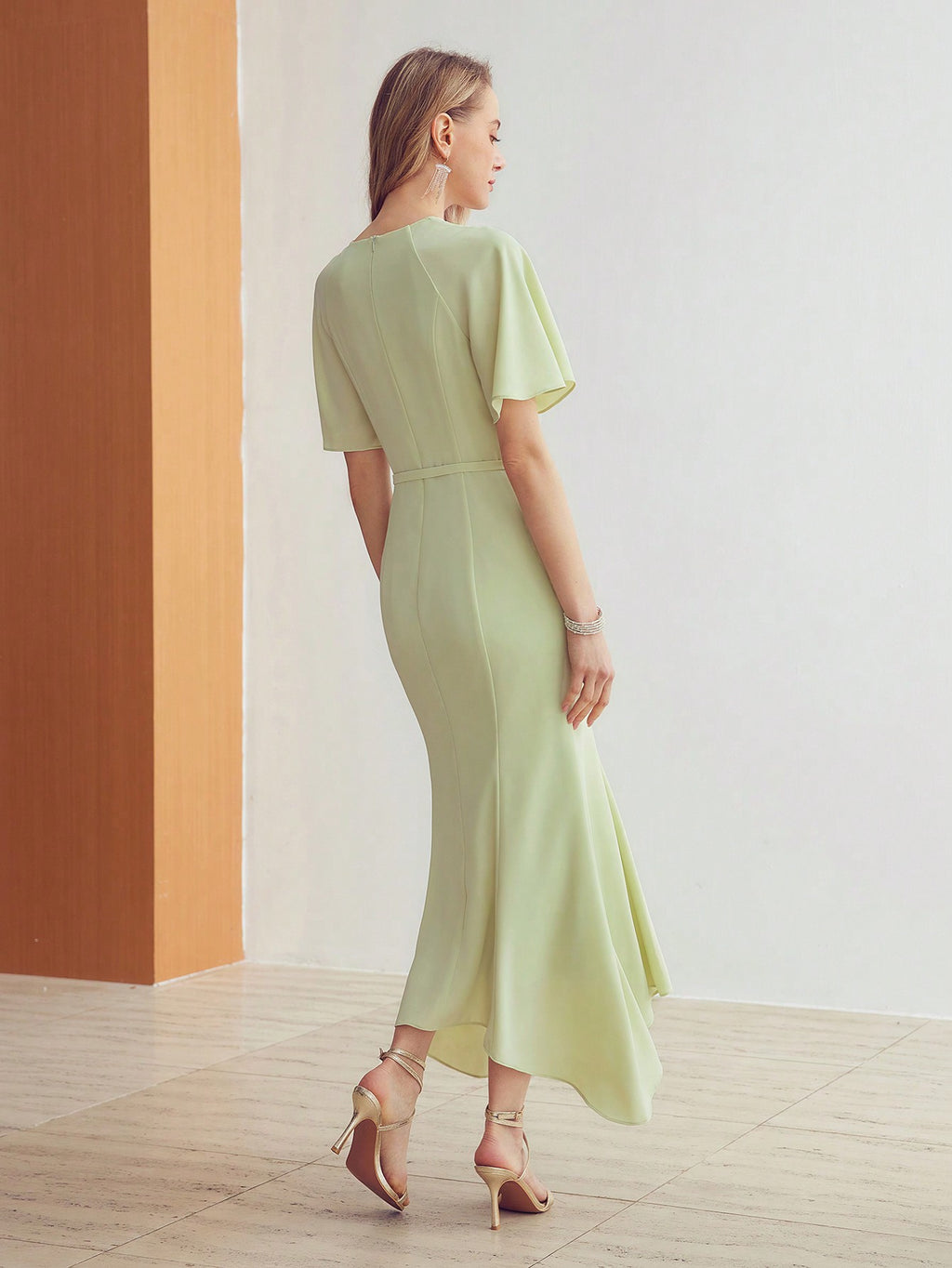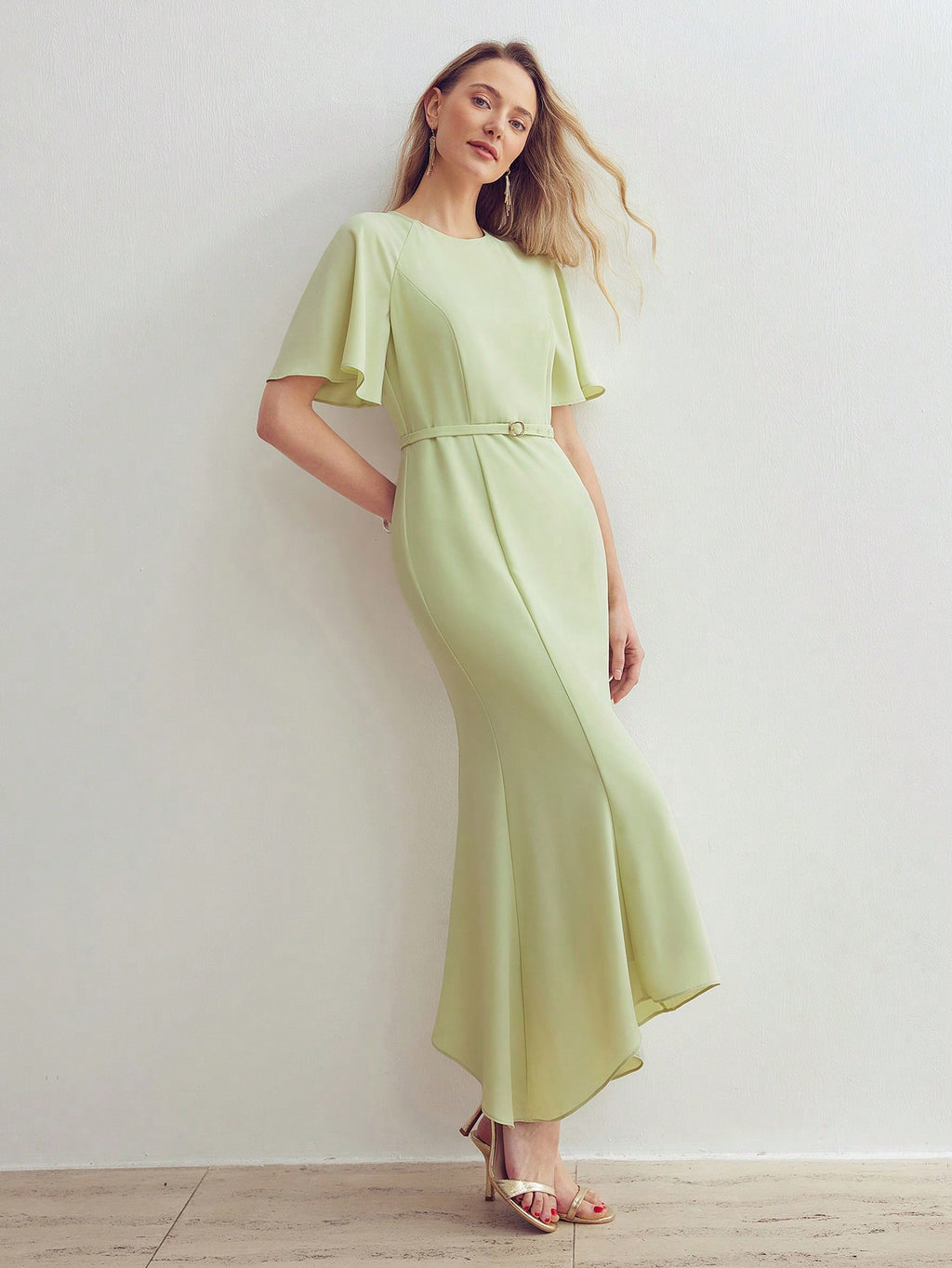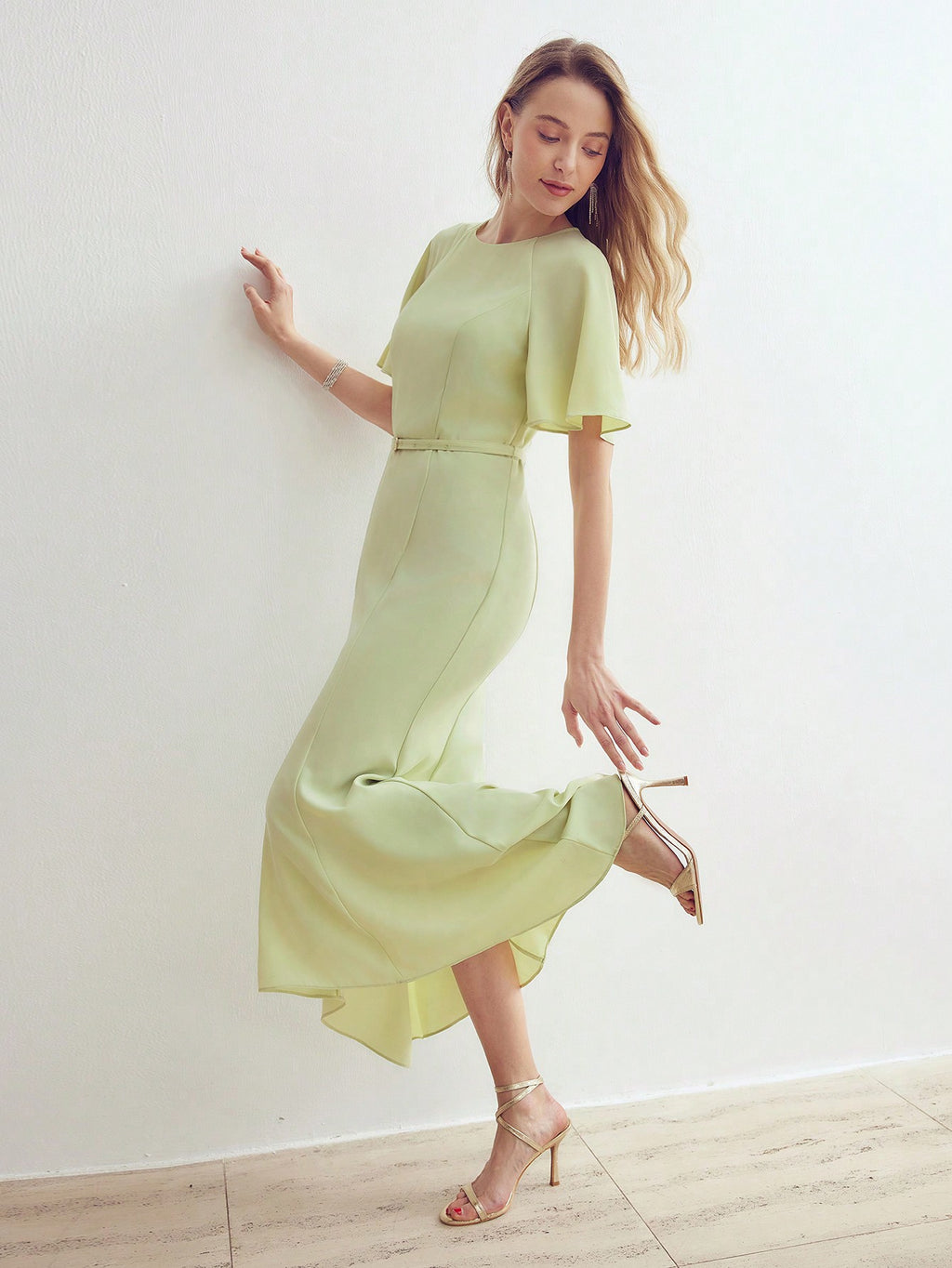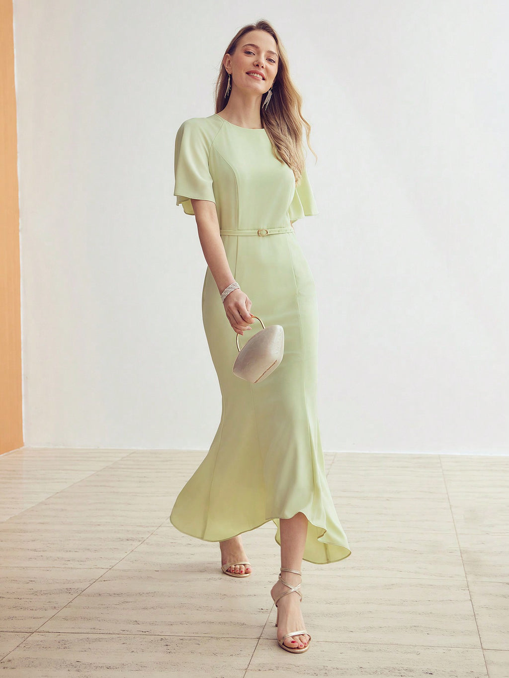 MIU PREMIUM SOLID RAGLAN SLEEVE MERMAID HEM BELTED DRESS,SUMMER OUTFITS