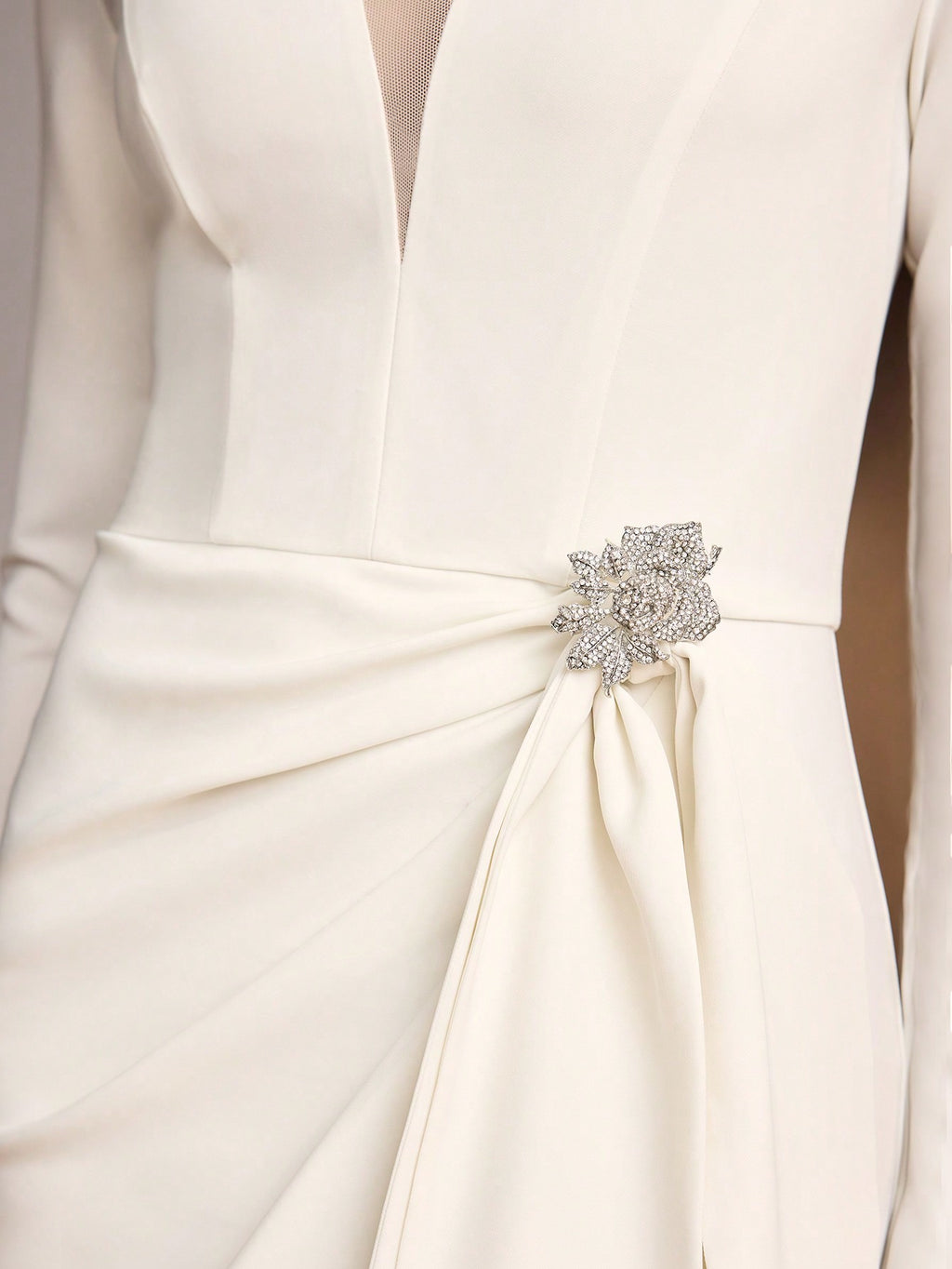 MIU PREMIUM SOLID V-NECK RHINESTONE FLORAL WRAP RUCHED WAIST MERMAID HEM COCKTAIL DRESS