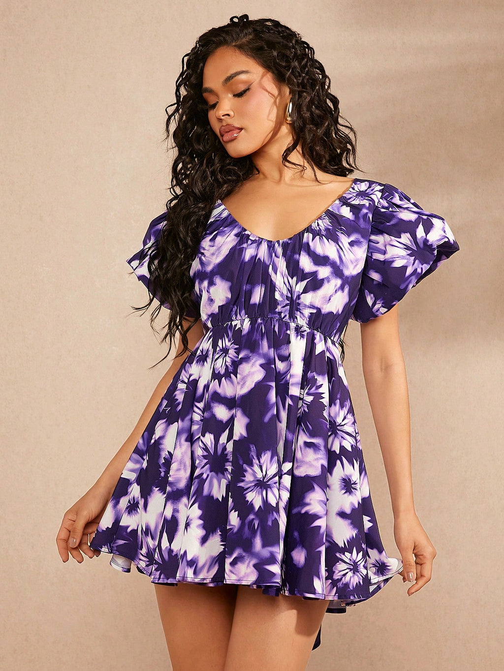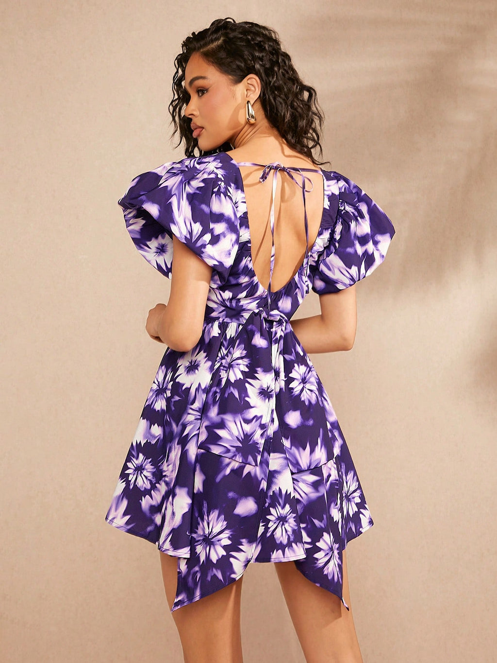 MIU Puff Sleeve Bow Back Tie-Dye Print Dress