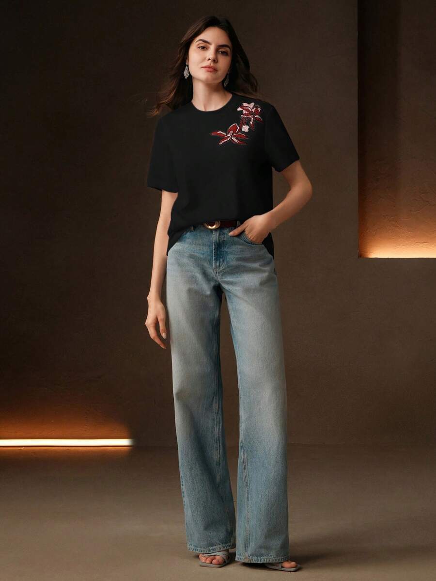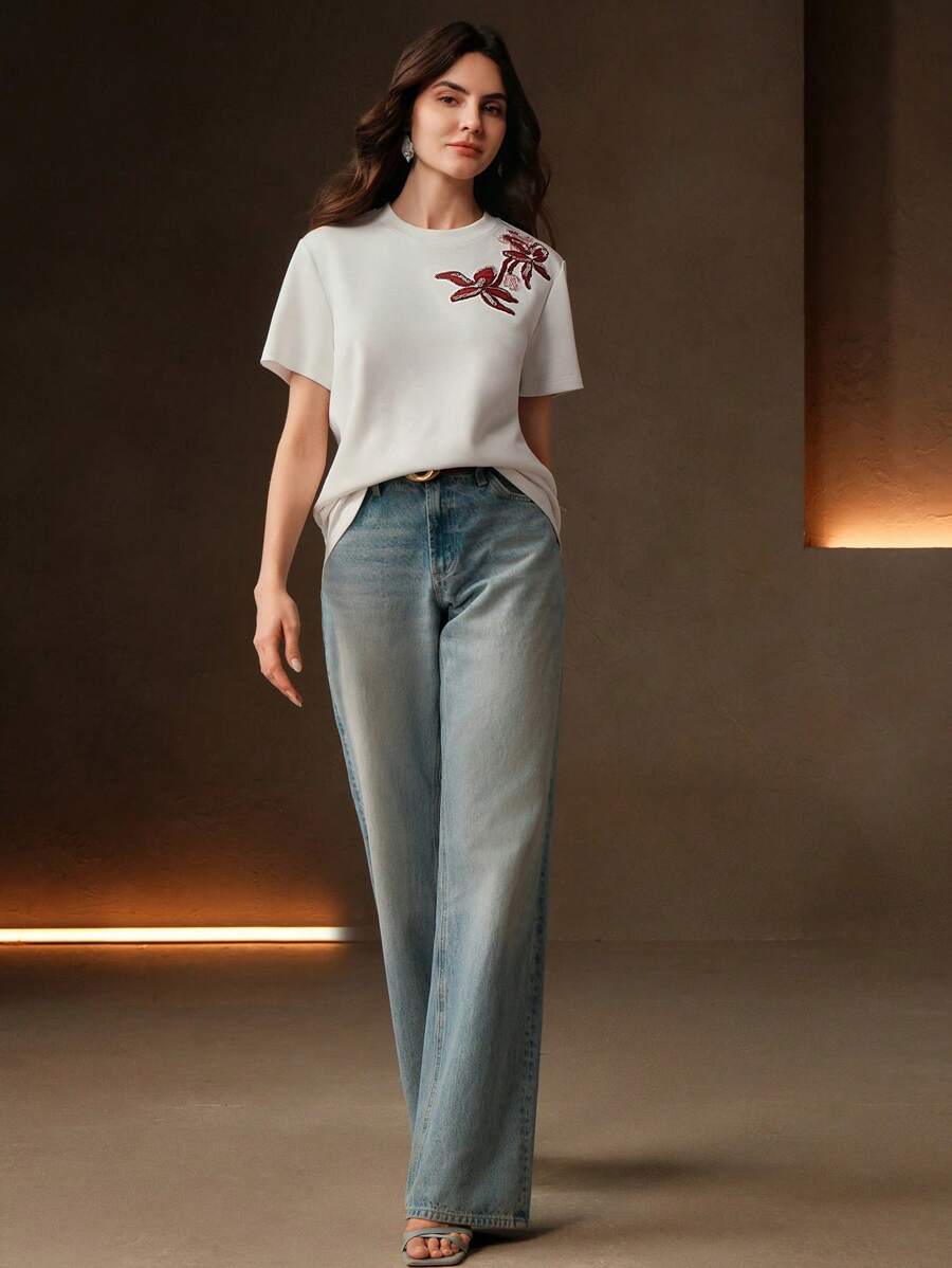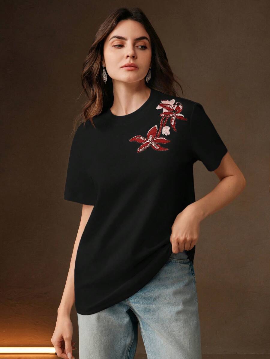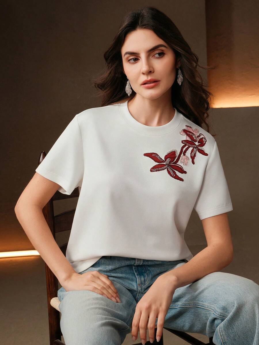 MIU Regular Women's Casual Elegant Contrast Color Embroidery Round Neck Loose Short Sleeve T-Shirt