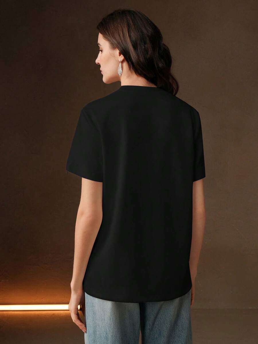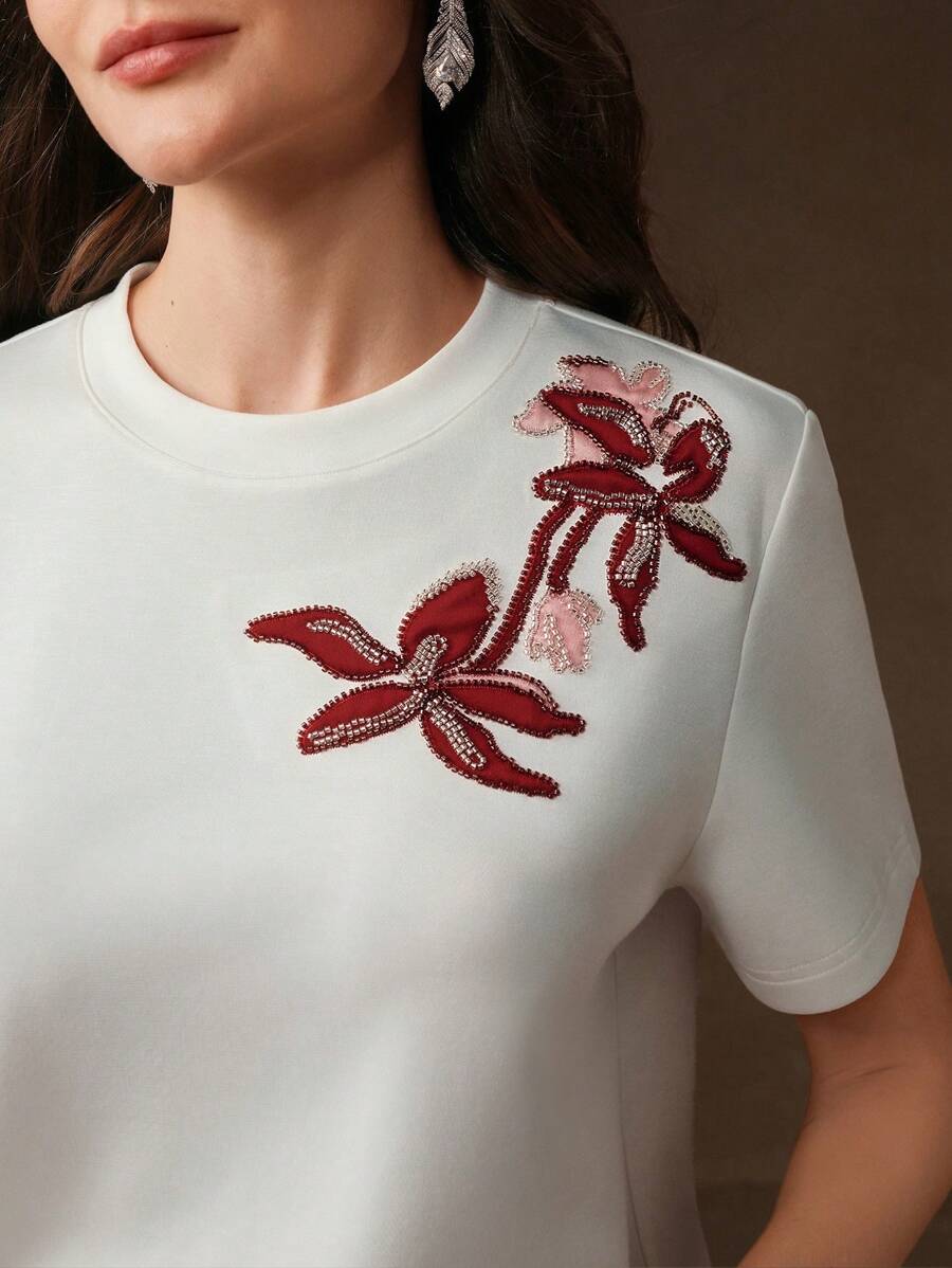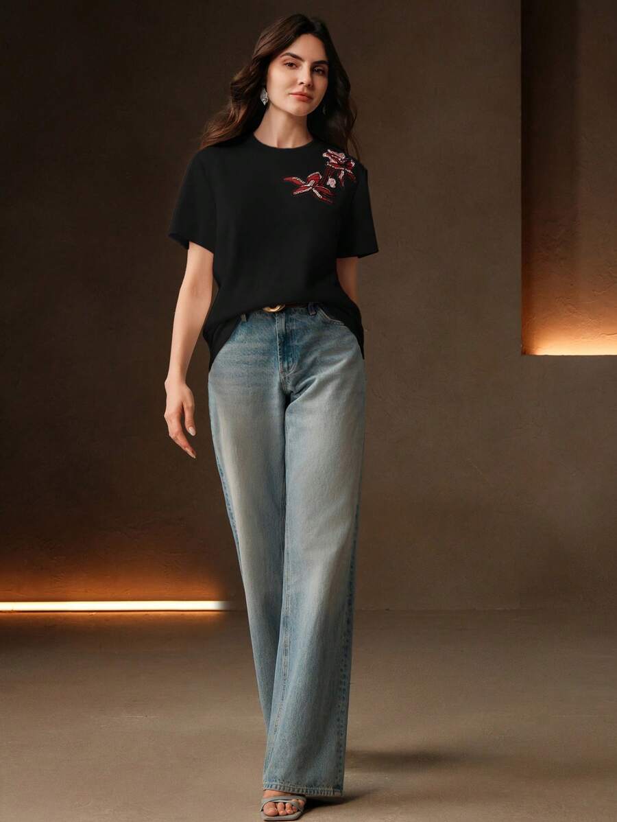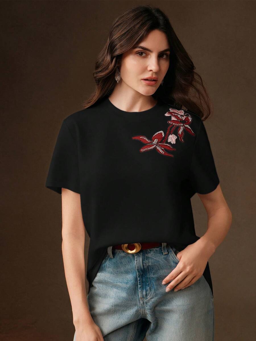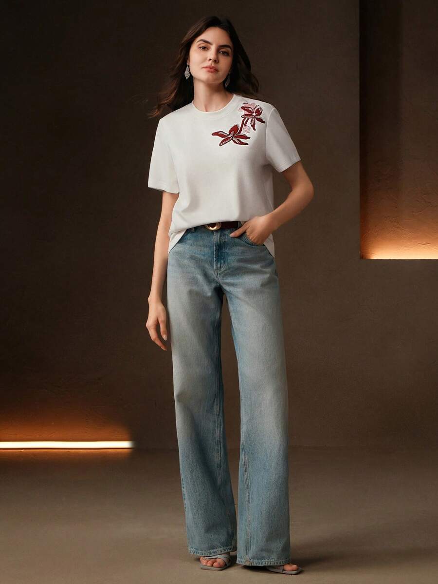 MIU Regular Women's Casual Elegant Contrast Color Embroidery Round Neck Loose Short Sleeve T-Shirt