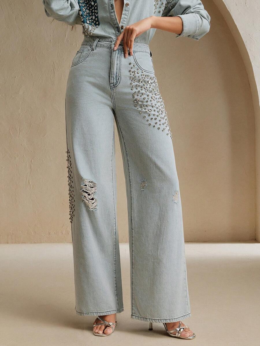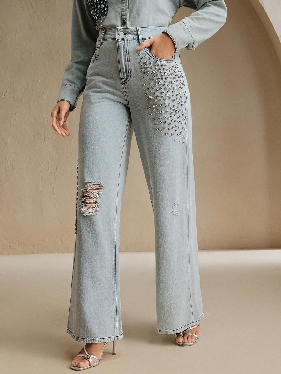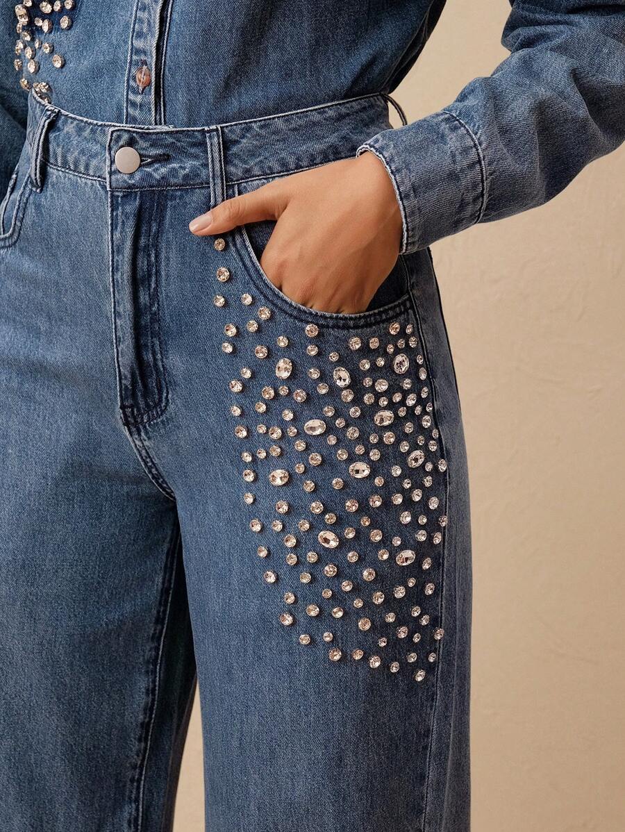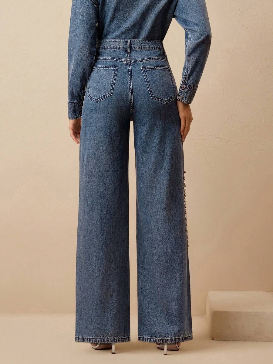 MIU Retro Embellished Beading Straight Leg Jeans, Casual