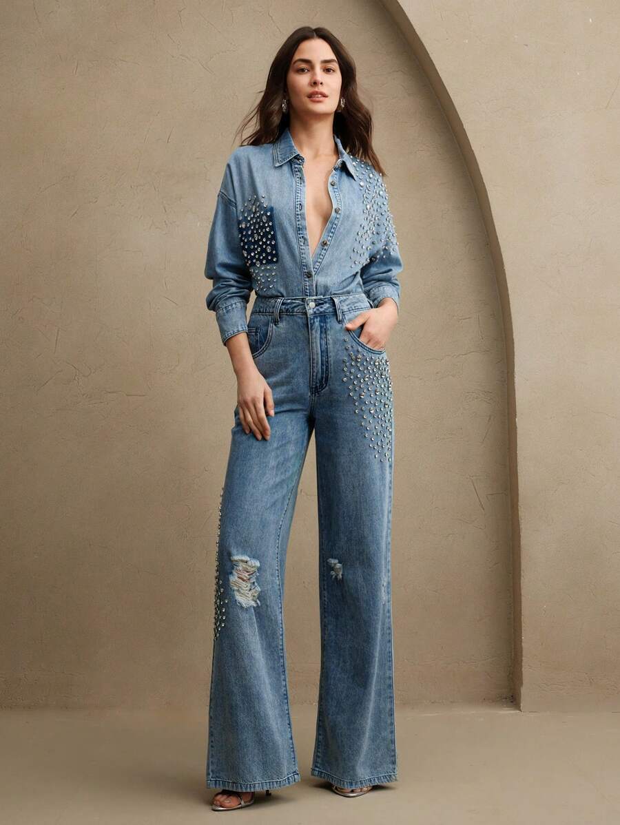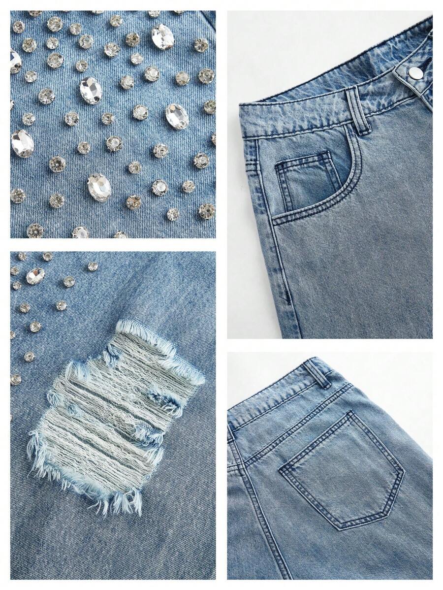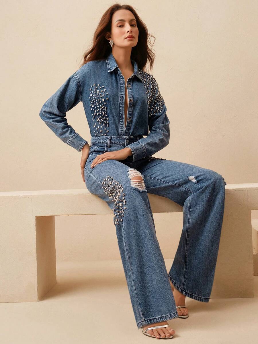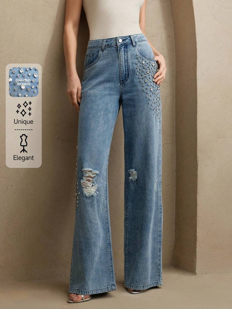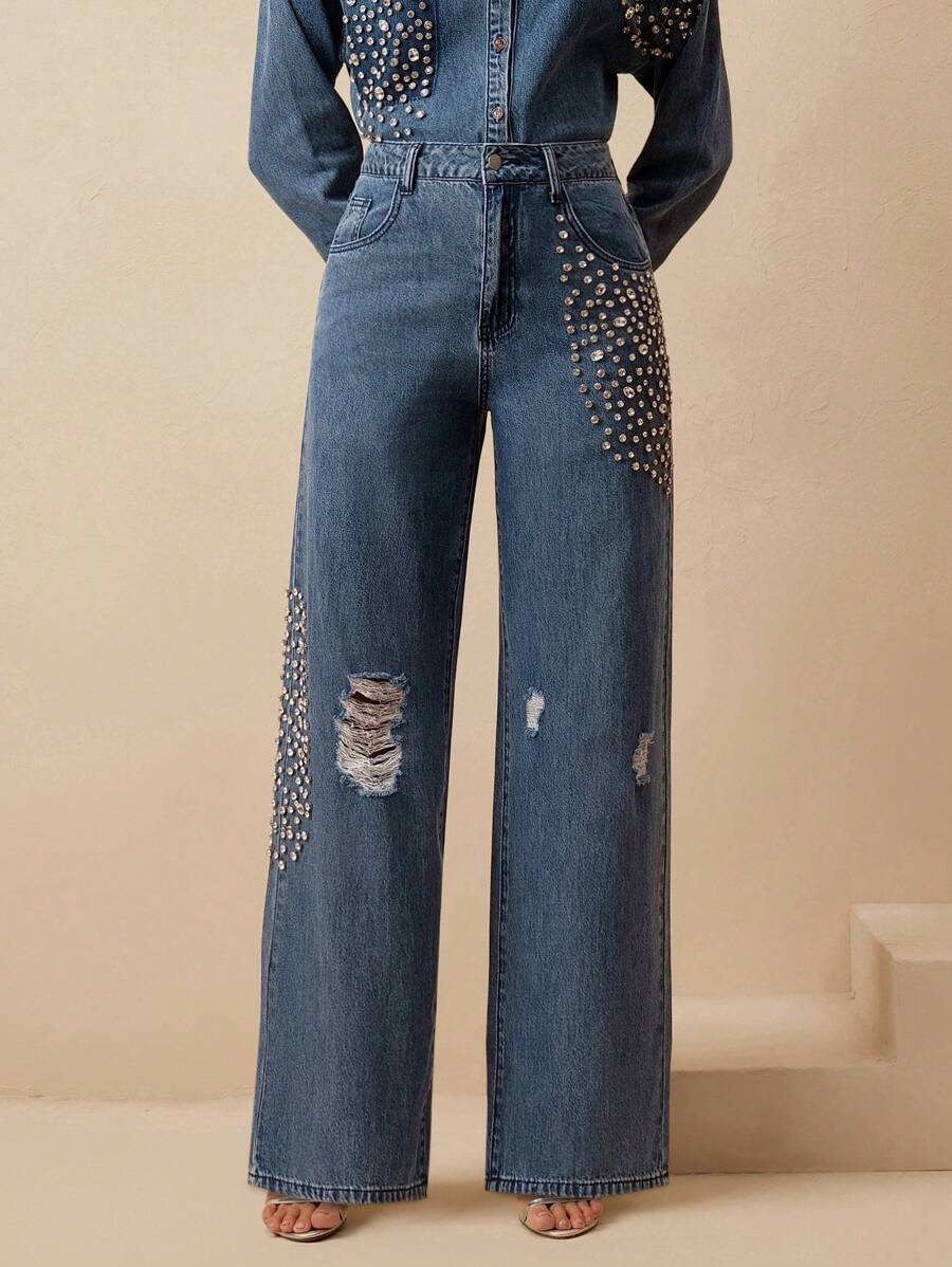 MIU Retro Embellished Beading Straight Leg Jeans, Casual