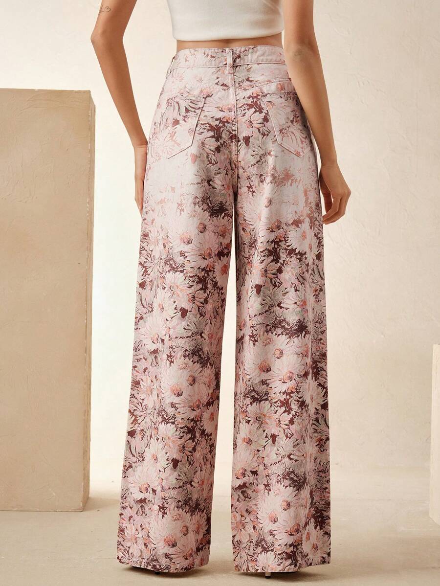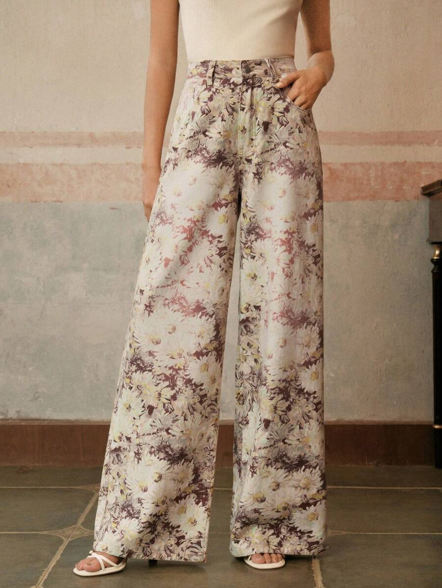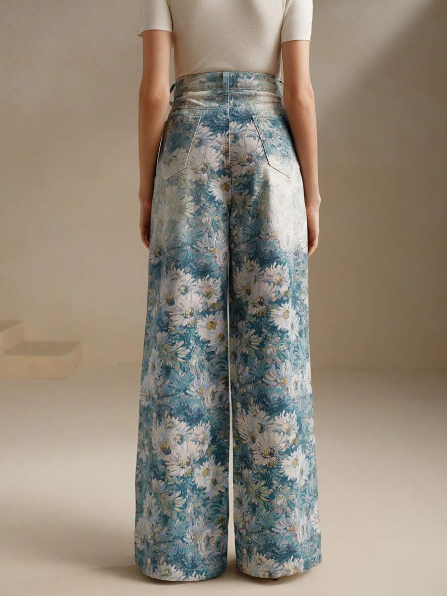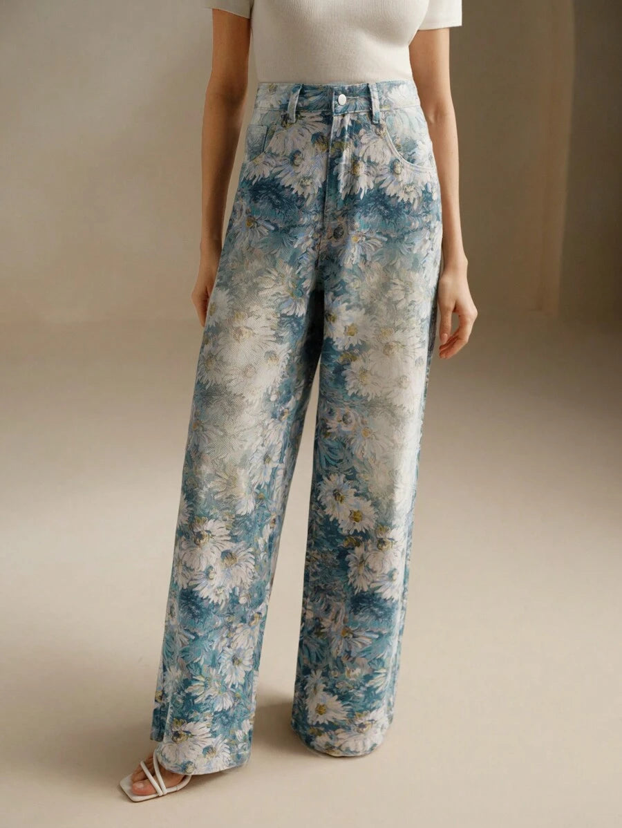 MIU Retro Printed Wide Leg Jeans For Women, Elegant, Casual, Festival, Vacation