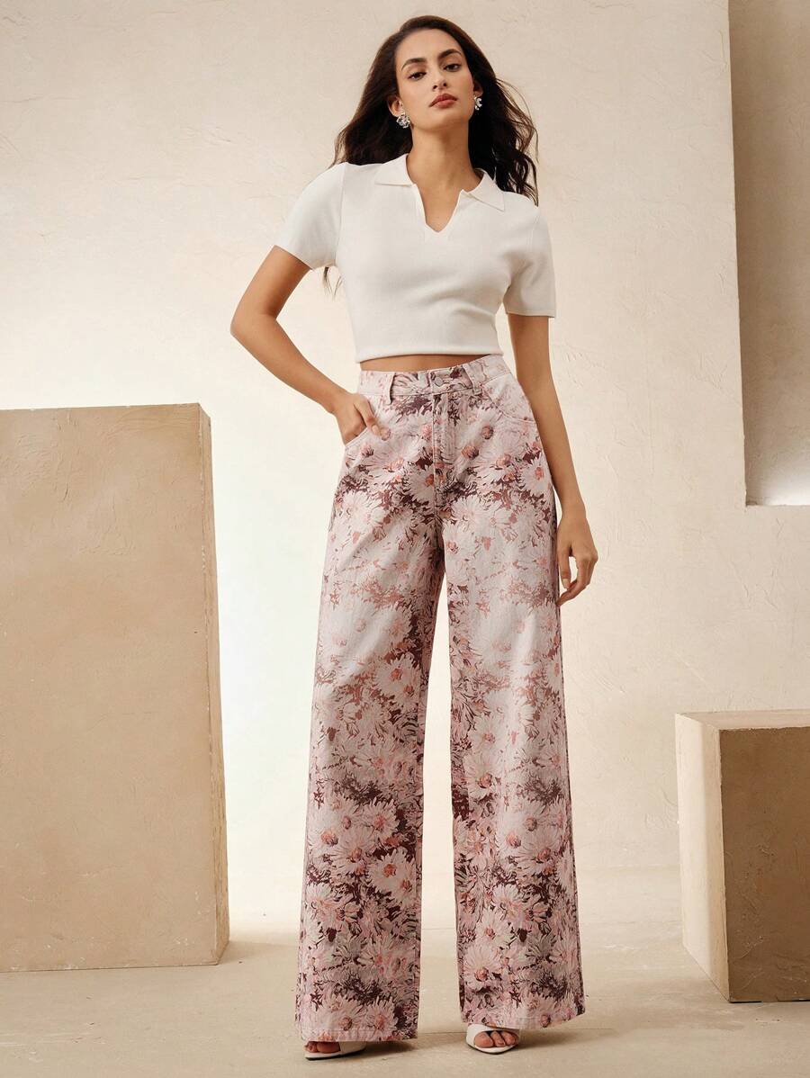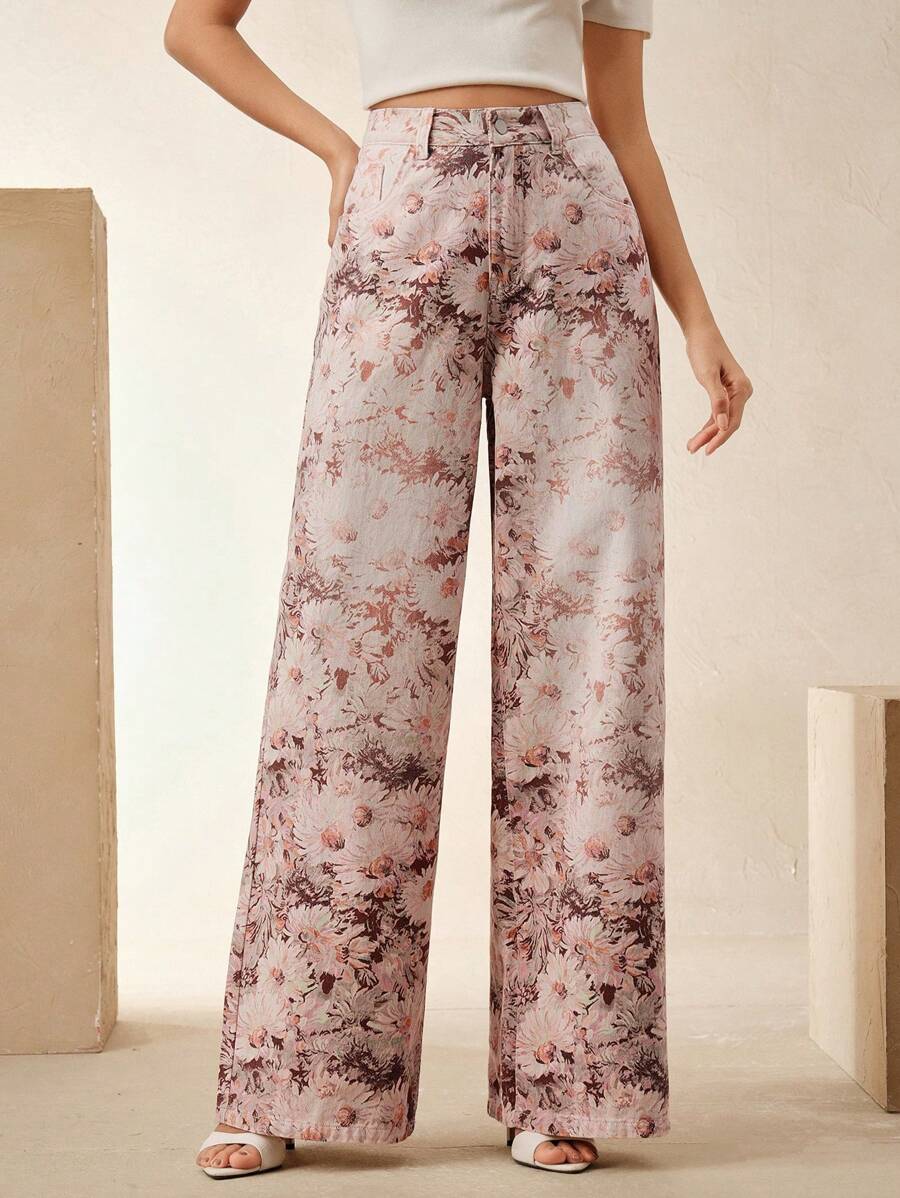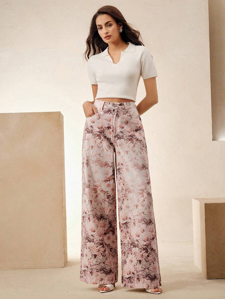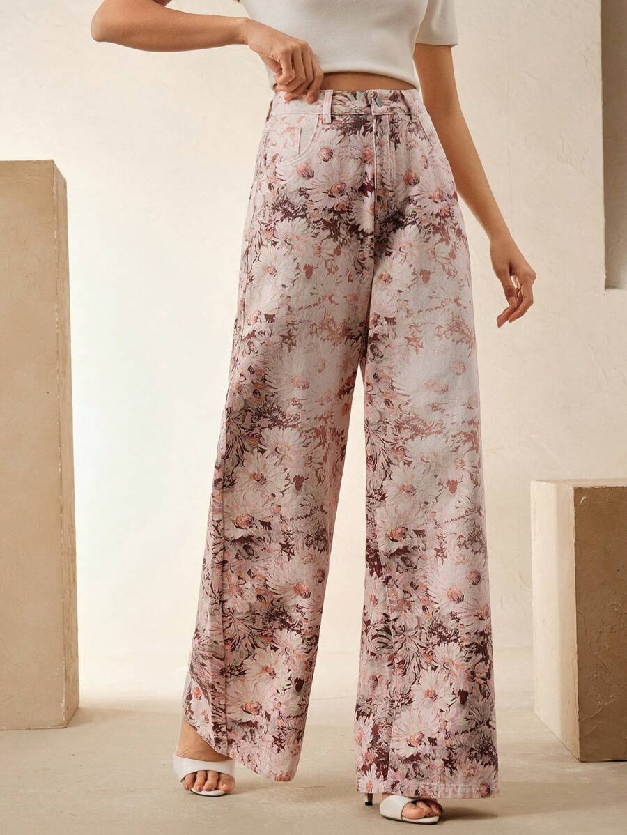 MIU Retro Printed Wide Leg Jeans For Women, Elegant, Casual, Festival, Vacation