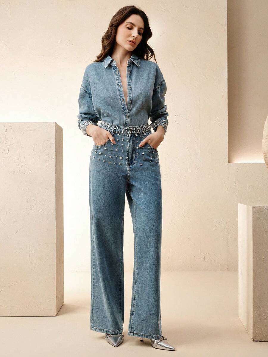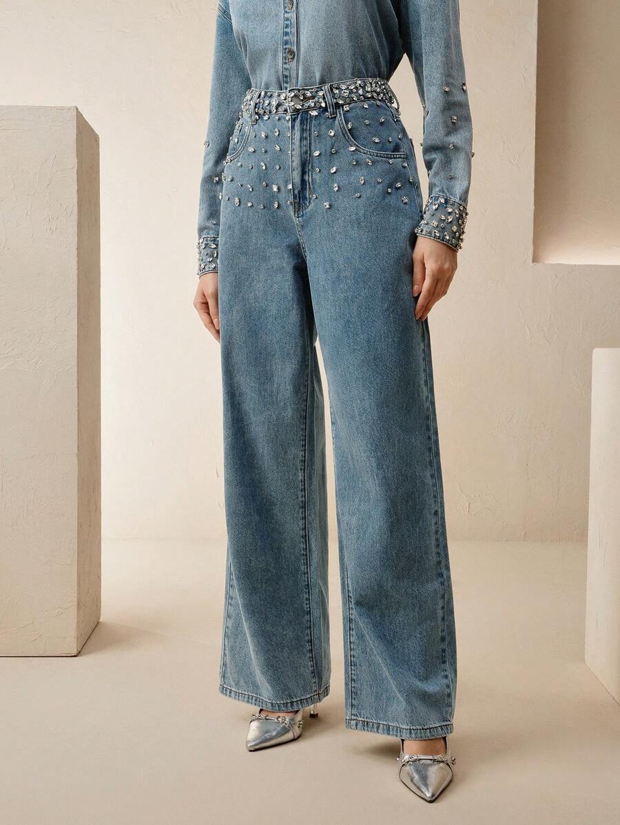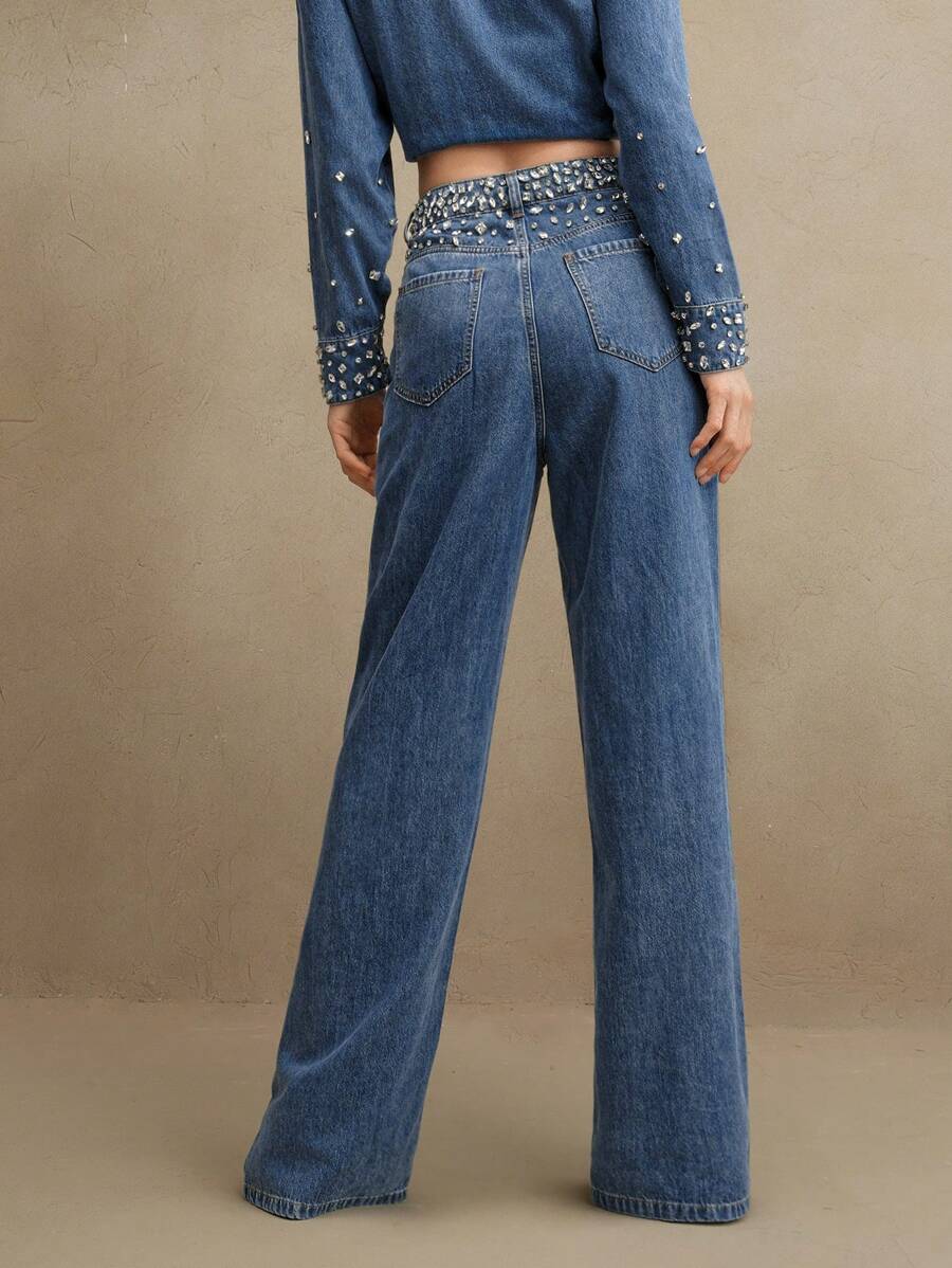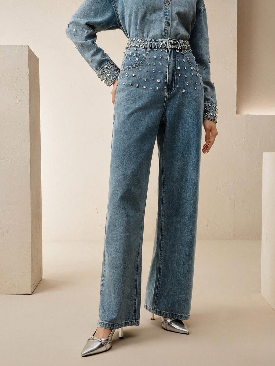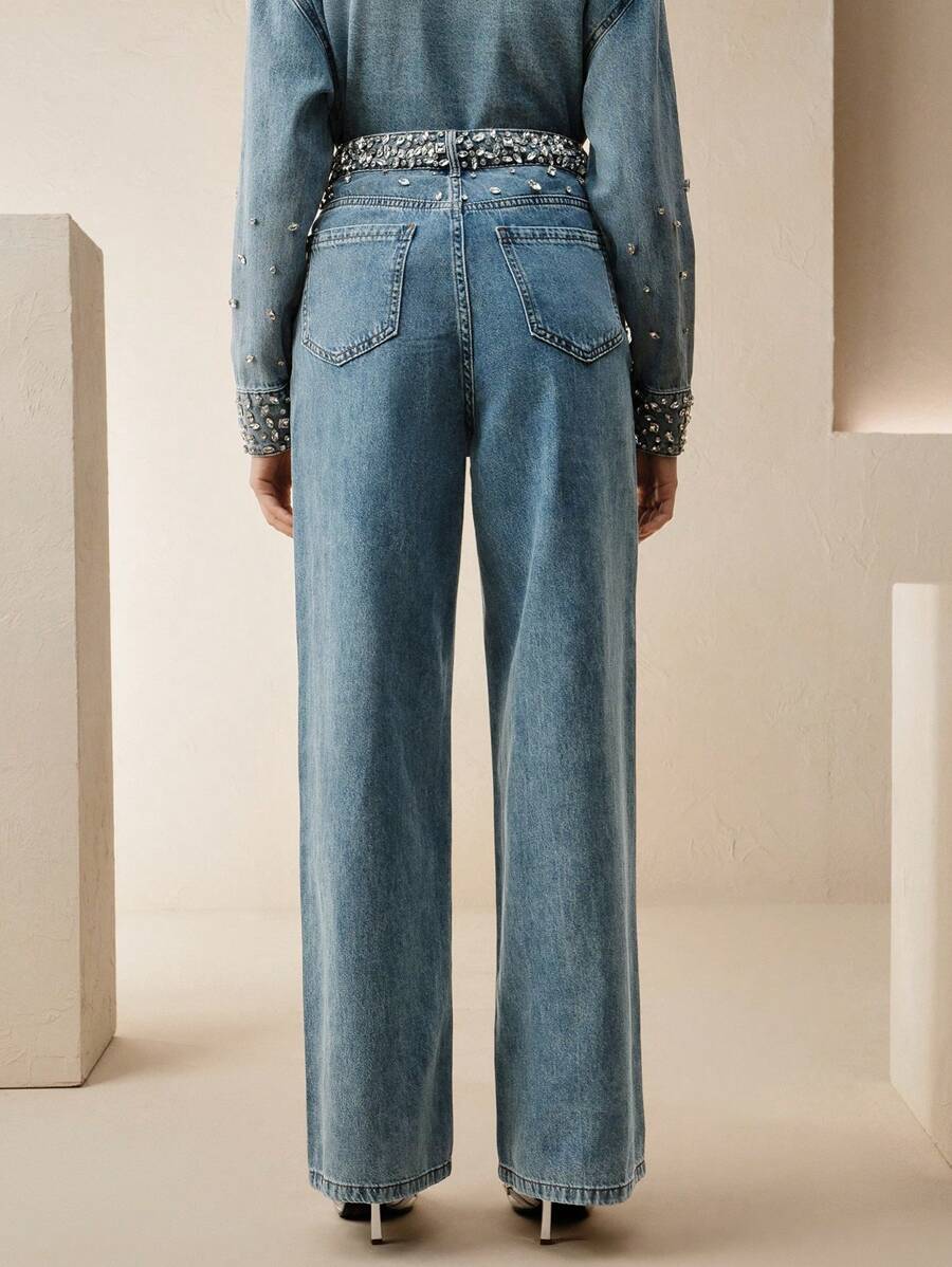 MIU Rhinestoned Elegant Casual Straight Leg Jeans For Women