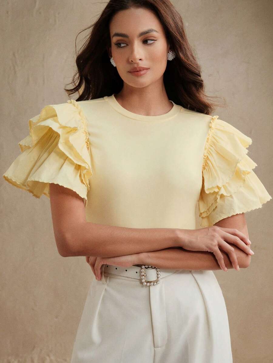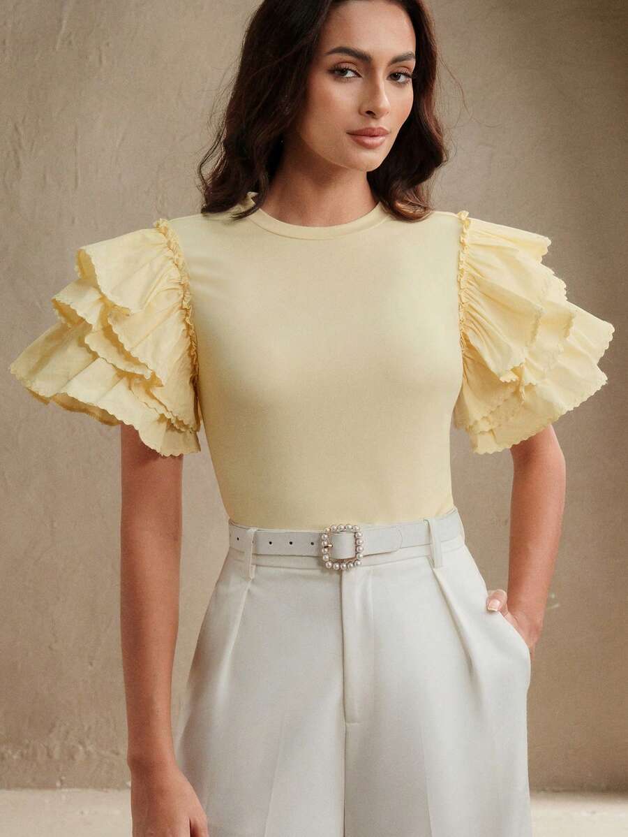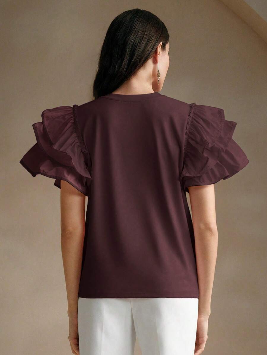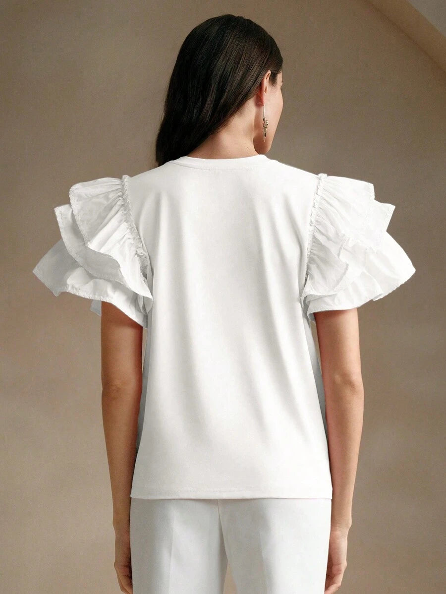 MIU Round Neck Puff Sleeve Flounce Hem Splice Short Sleeve Casual Vacation T-Shirt