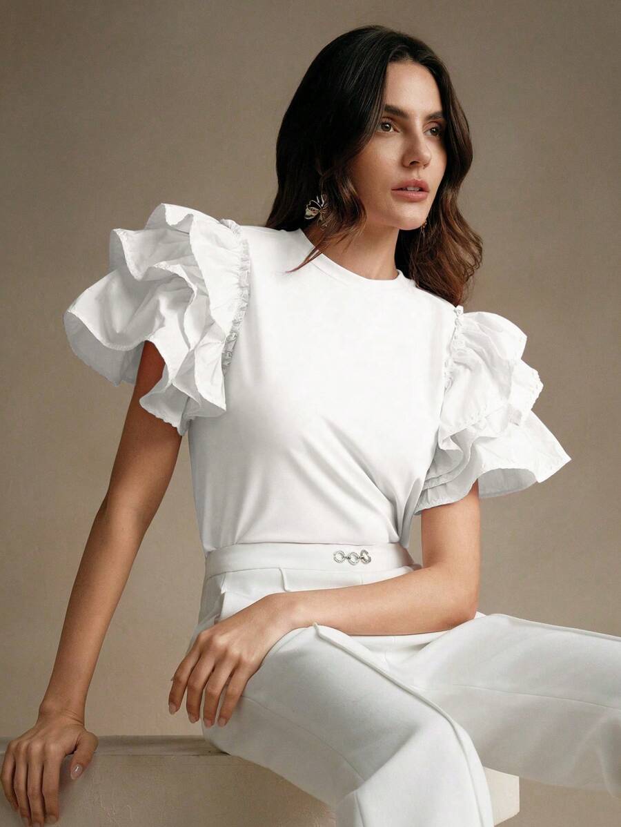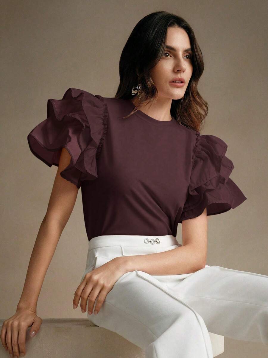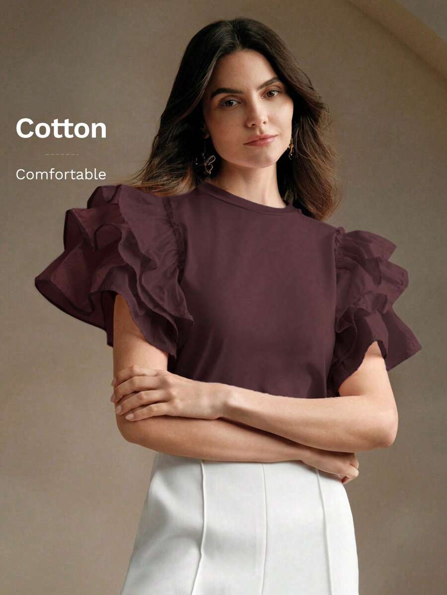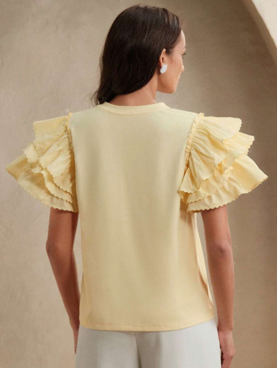MIU Round Neck Puff Sleeve Flounce Hem Splice Short Sleeve Casual Vacation T-Shirt