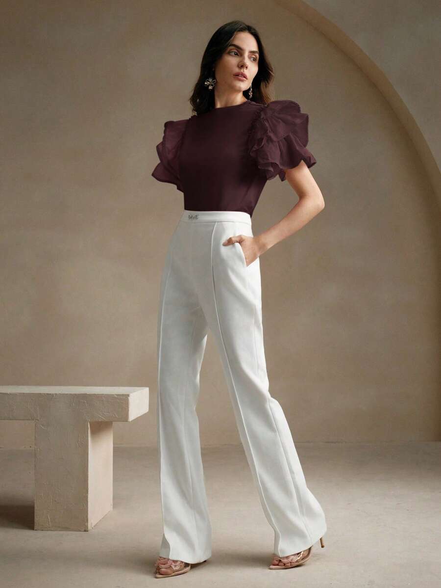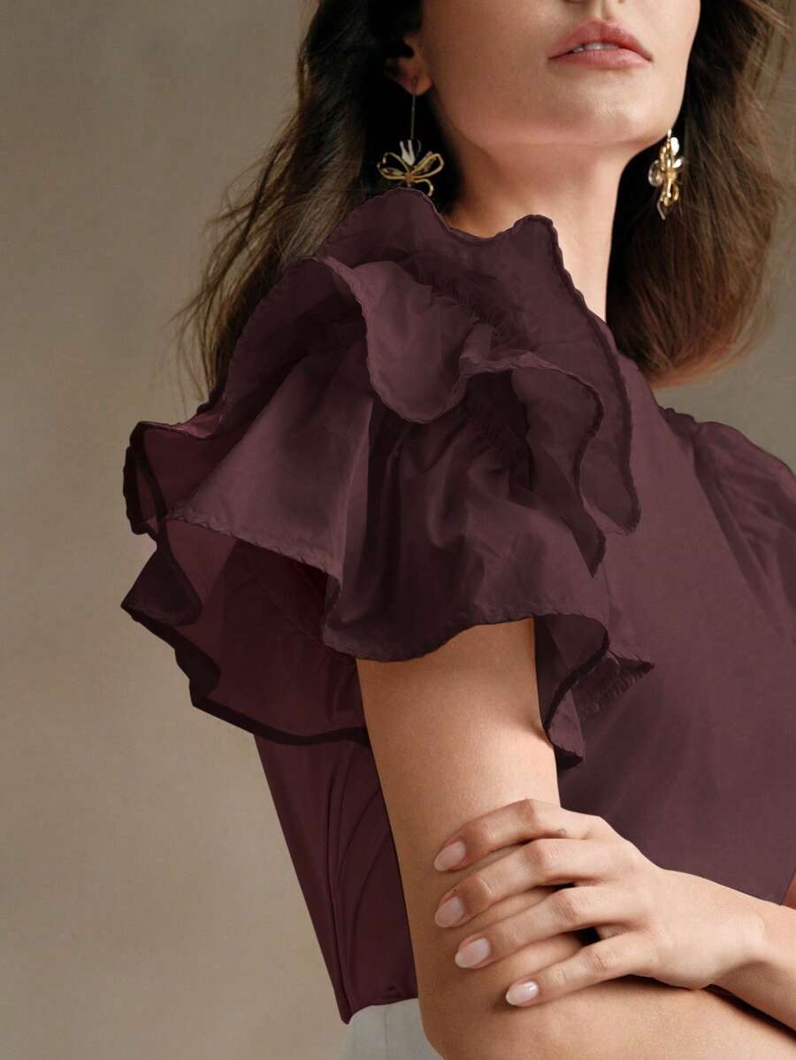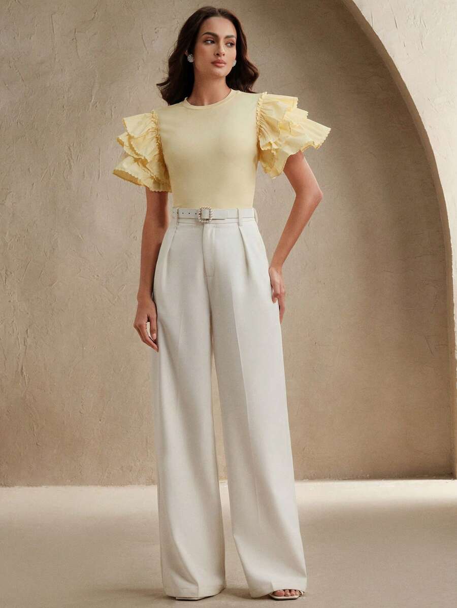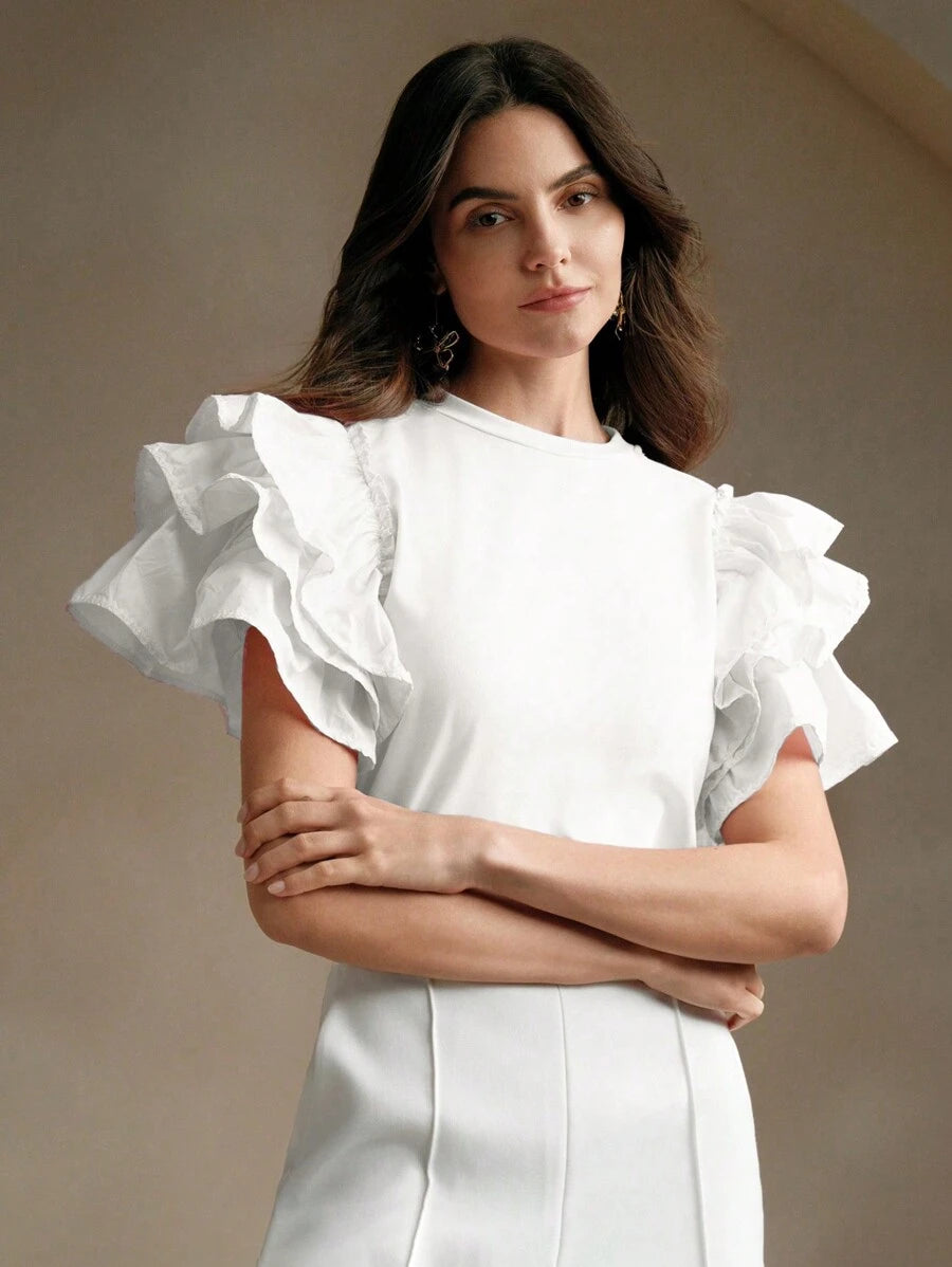 MIU Round Neck Puff Sleeve Flounce Hem Splice Short Sleeve Casual Vacation T-Shirt