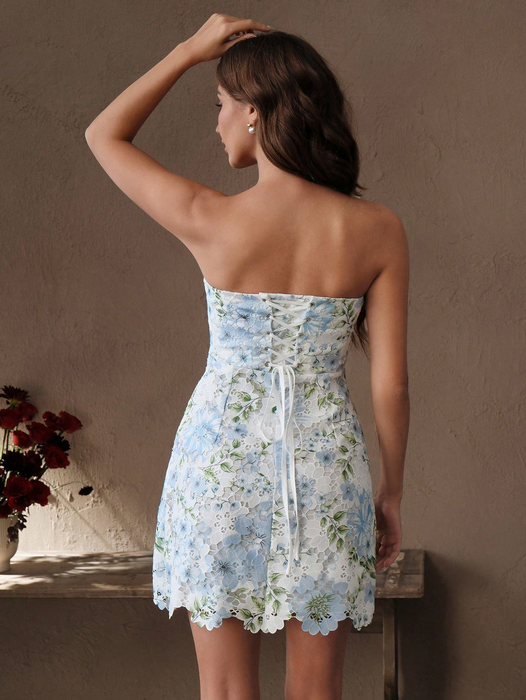 MIU Savoree Women's Strapless Hollow Out New Printed Embroidered Fabric Hem Arc Waist Elegant Short Dress, Spring/Summer