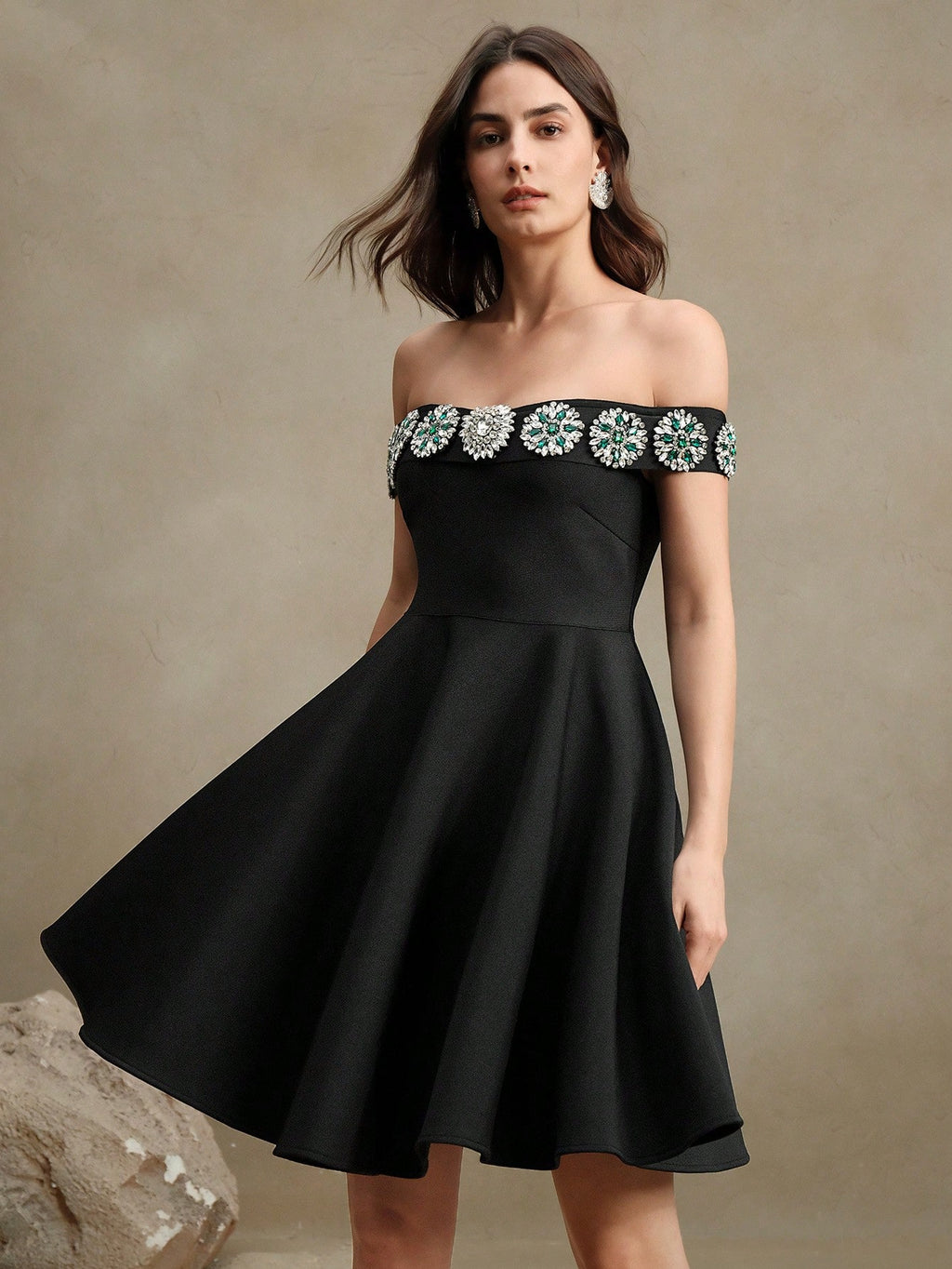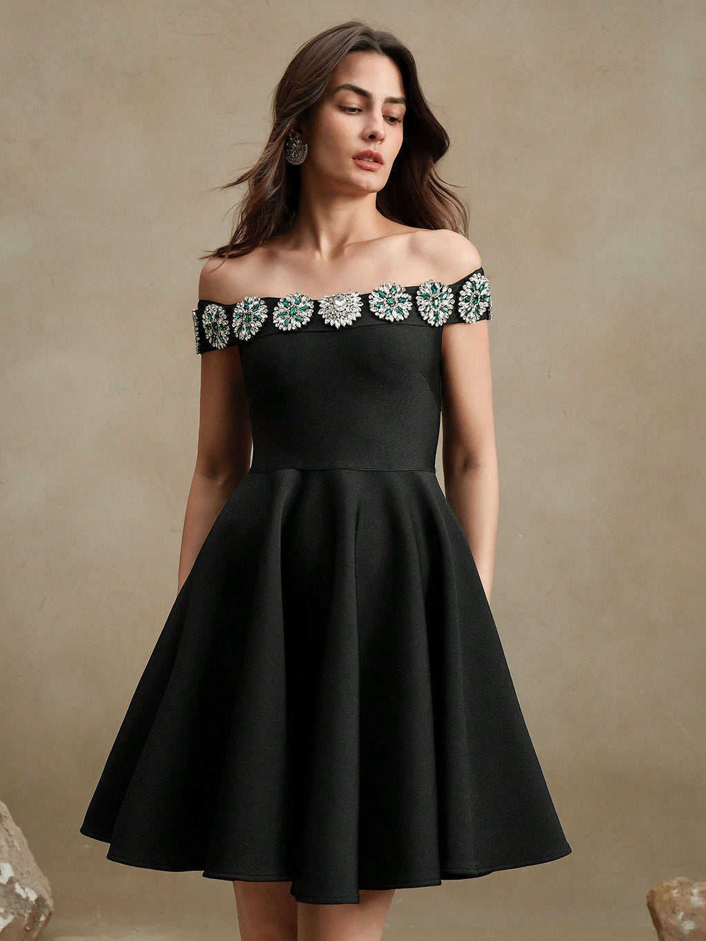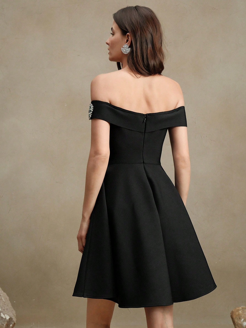 MIU Sexy Off Shoulder Bejeweled Cocktail Dress, Suitable For Elegant Party, Festival, Summer, Spring, Wedding Guest