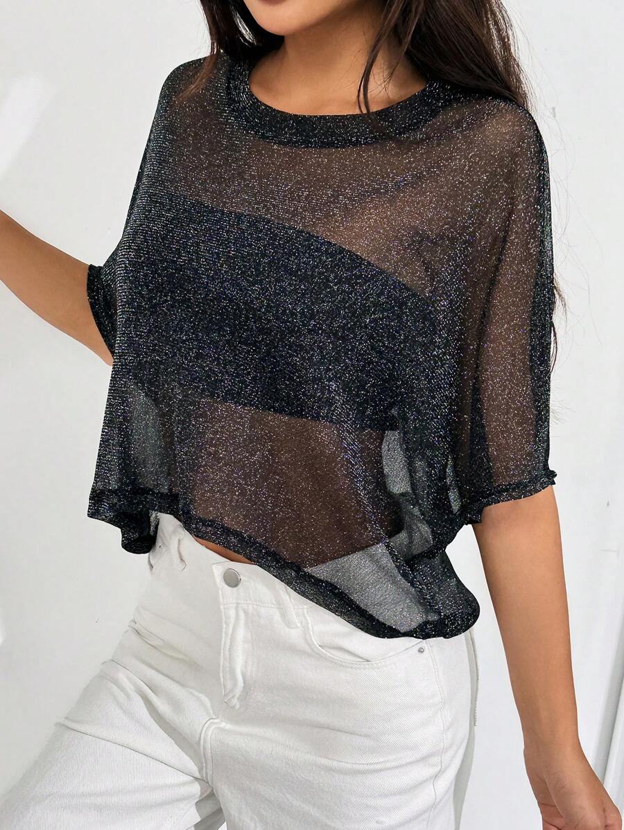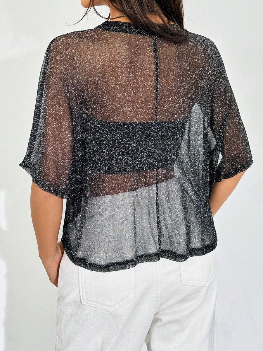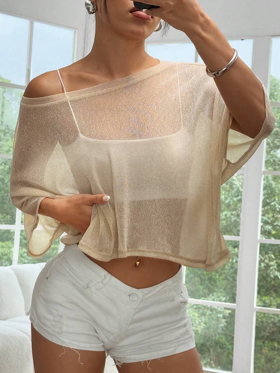 MIU Sheer Mesh Solid Batwing Sleeve Crop Tee