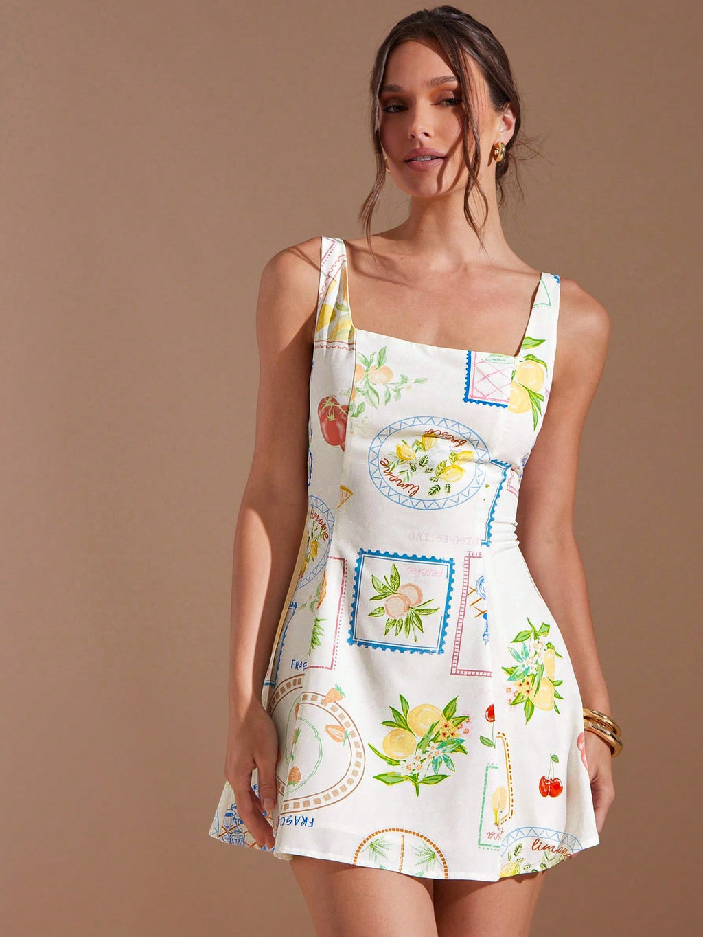 MIU Sleeveless Tropical Fruit Print Fit And Flare Smocked Back Mini Summer Sundress, Summer Outfits For Women, Brunch Outfits For Women, Vacation Outfits Woman