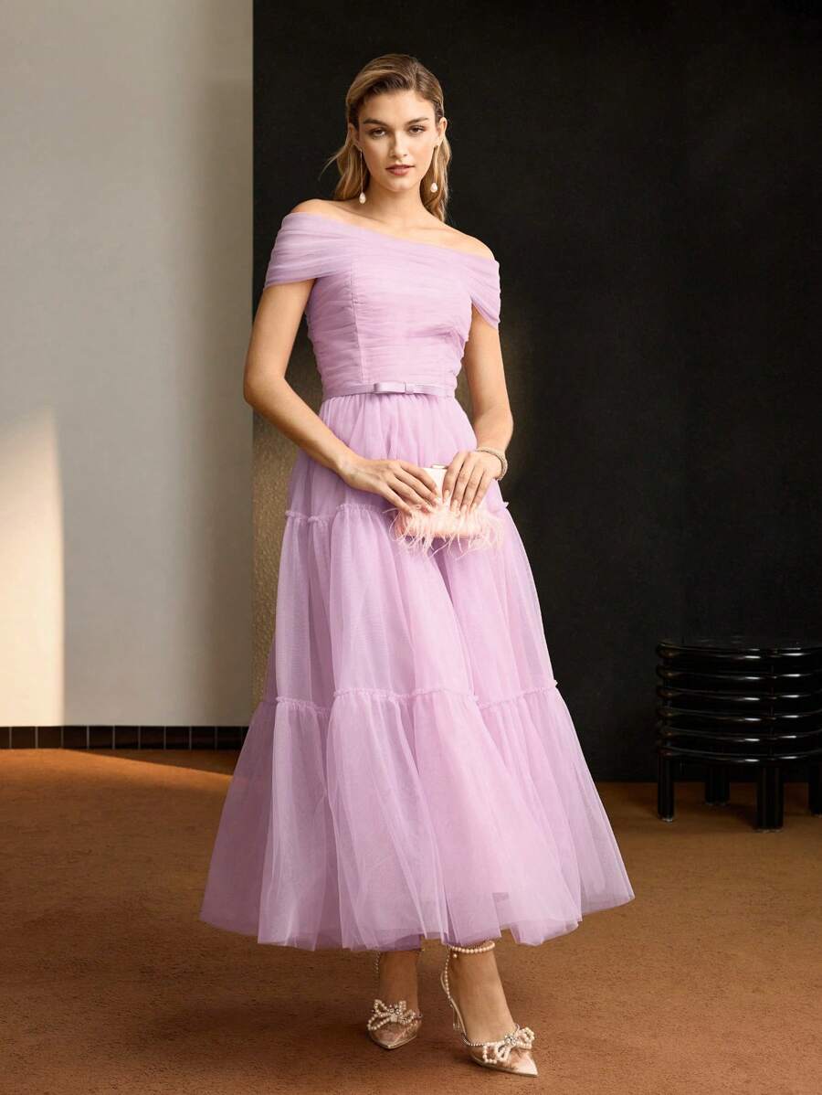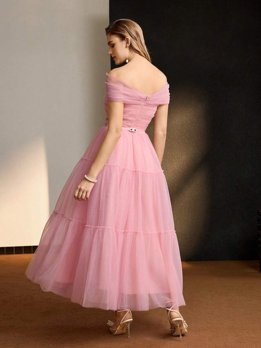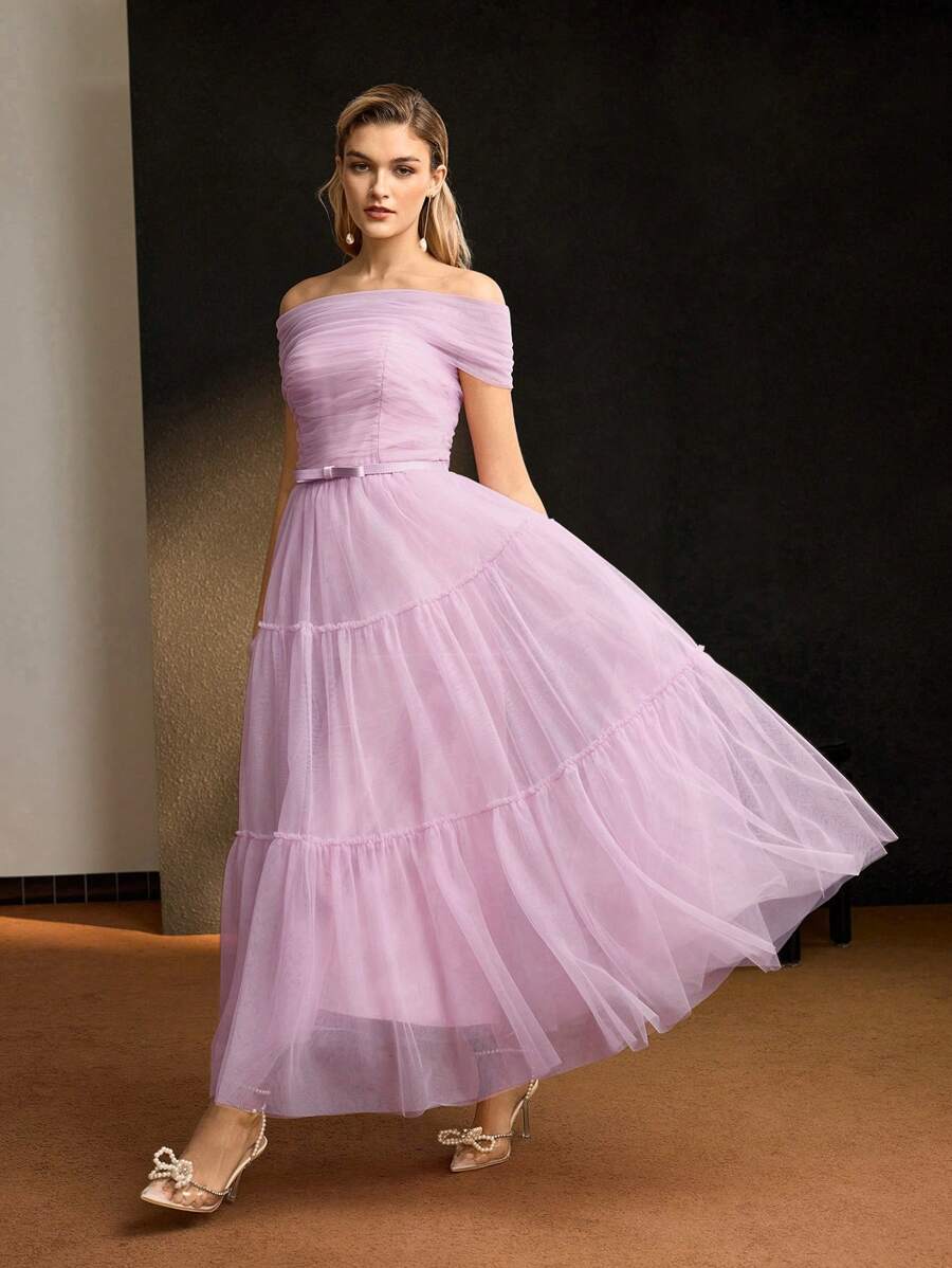 MIU Soiréza MESH OVERLAY OFF SHOULDER RUCHED BODICE TIERED HEM FORMAL EVENING DRESS