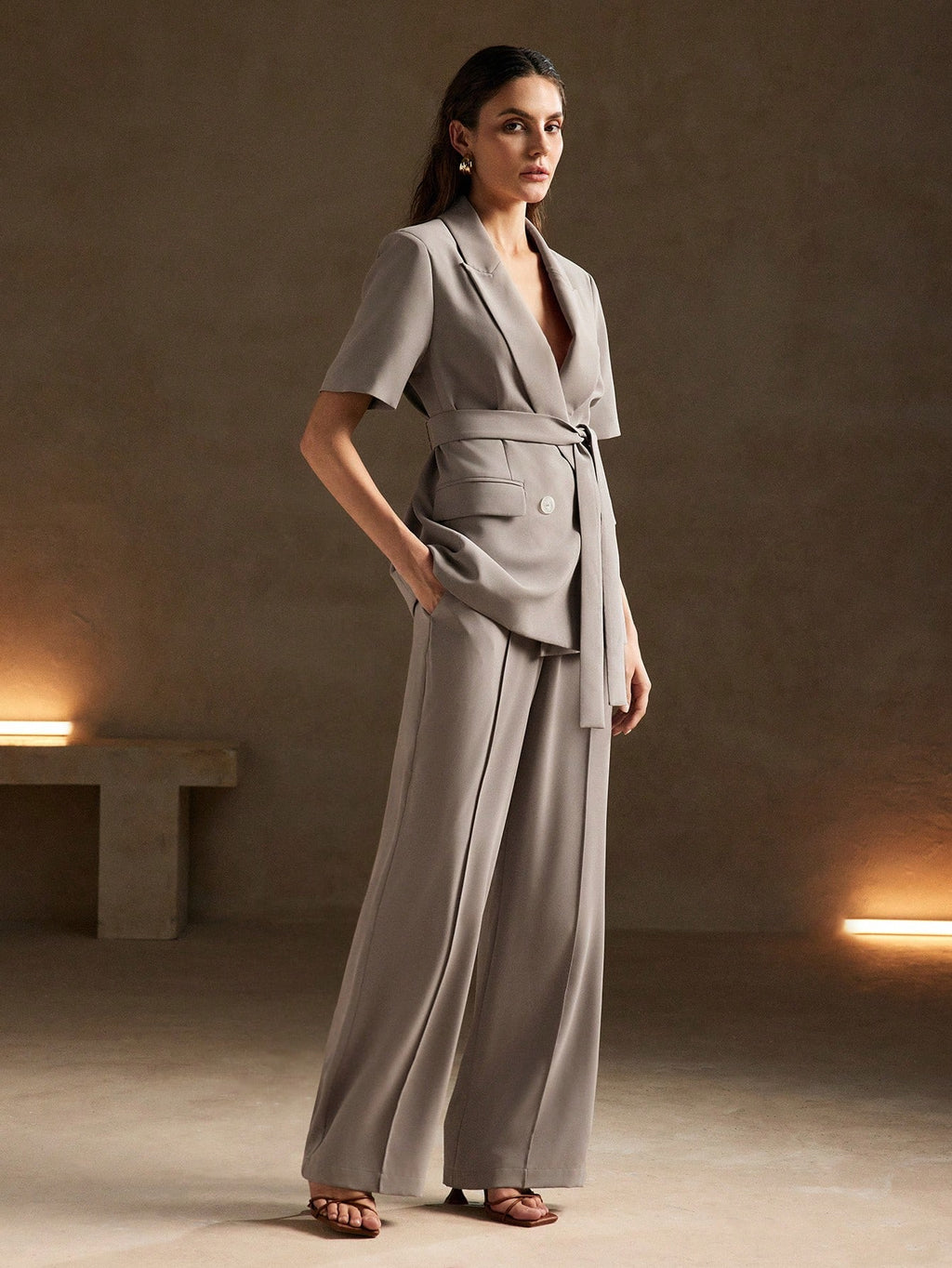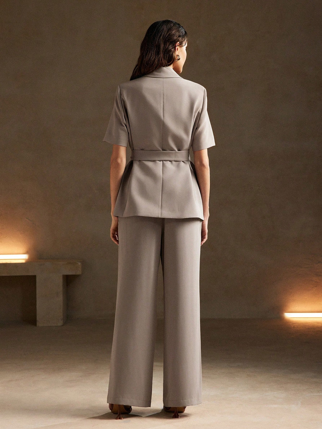 MIU Solid Color Waist Belt Short Sleeve Blazer And Pocketed Long Pants Suit