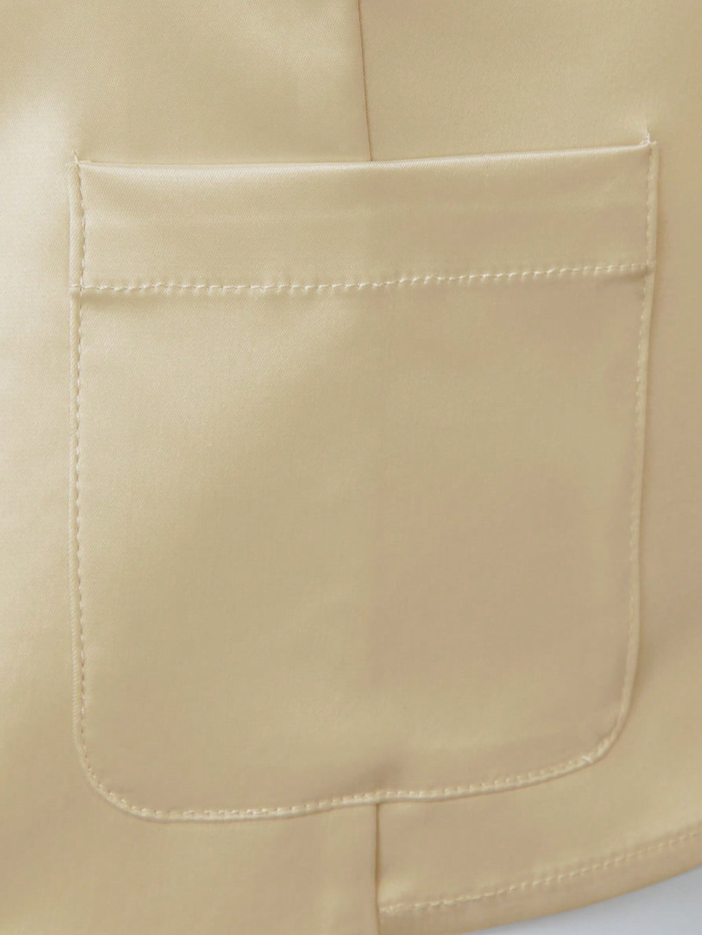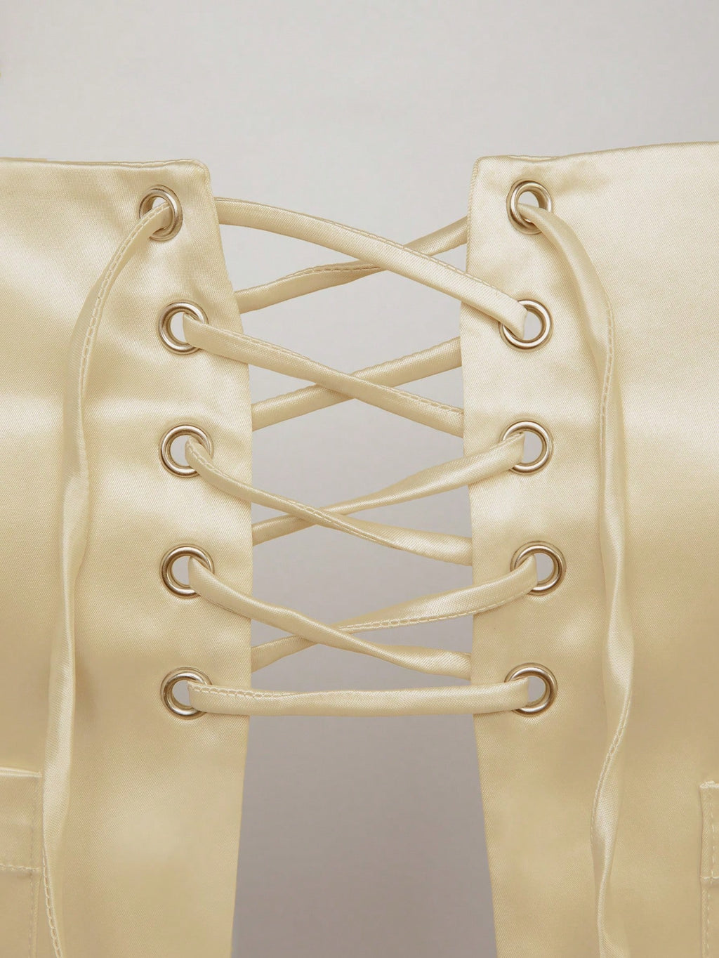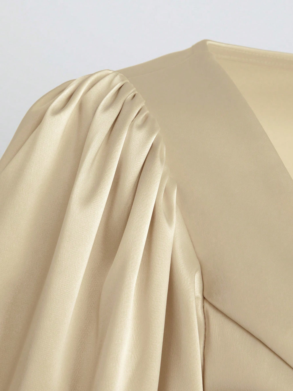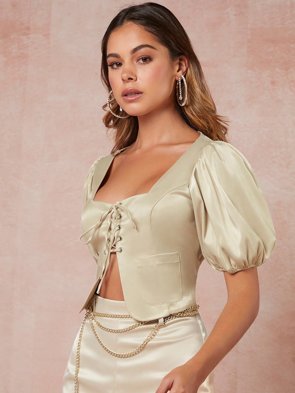 MIU Solid Puff Sleeve Lace Up Slit Hem Satin Blouse