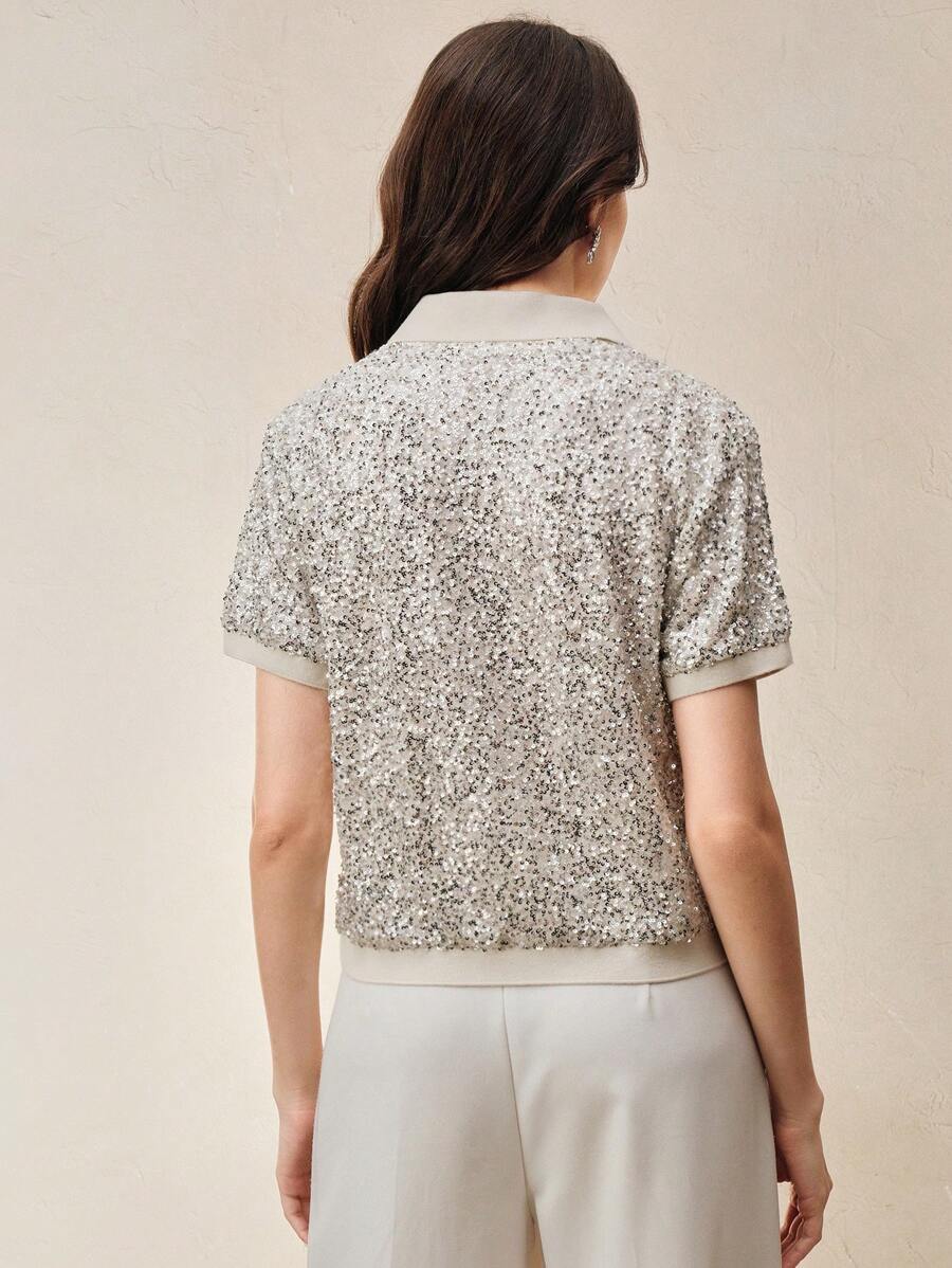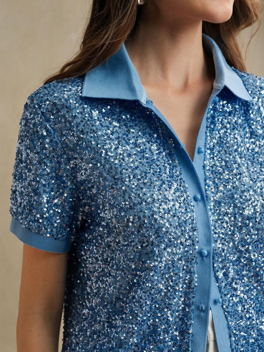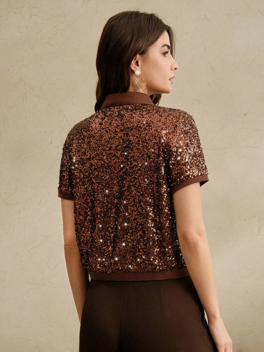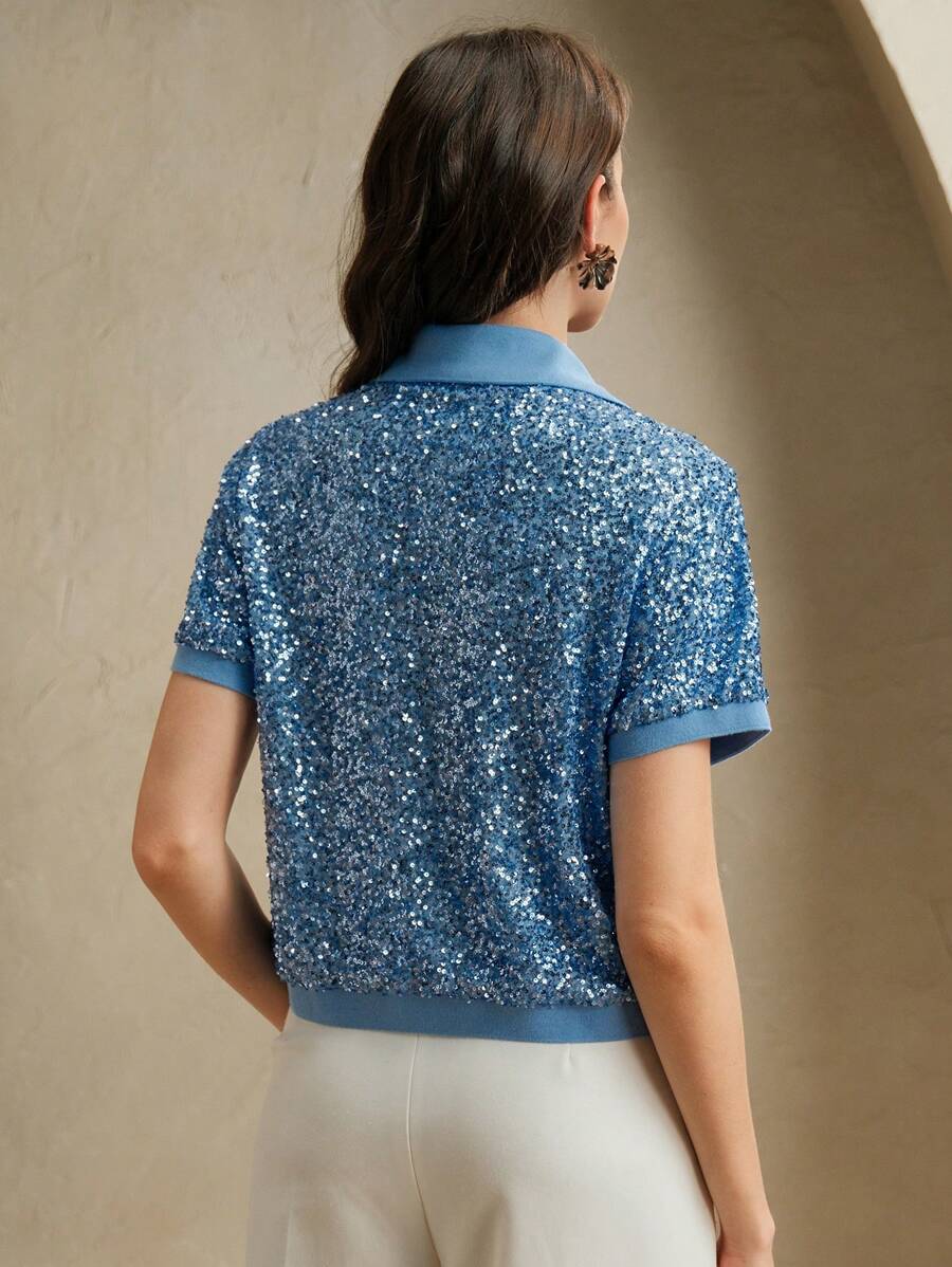 MIU Sparkly Sequin Polo Collar Short Sleeve Front Open Women T-Shirt, Holiday Party, Spring/Summer